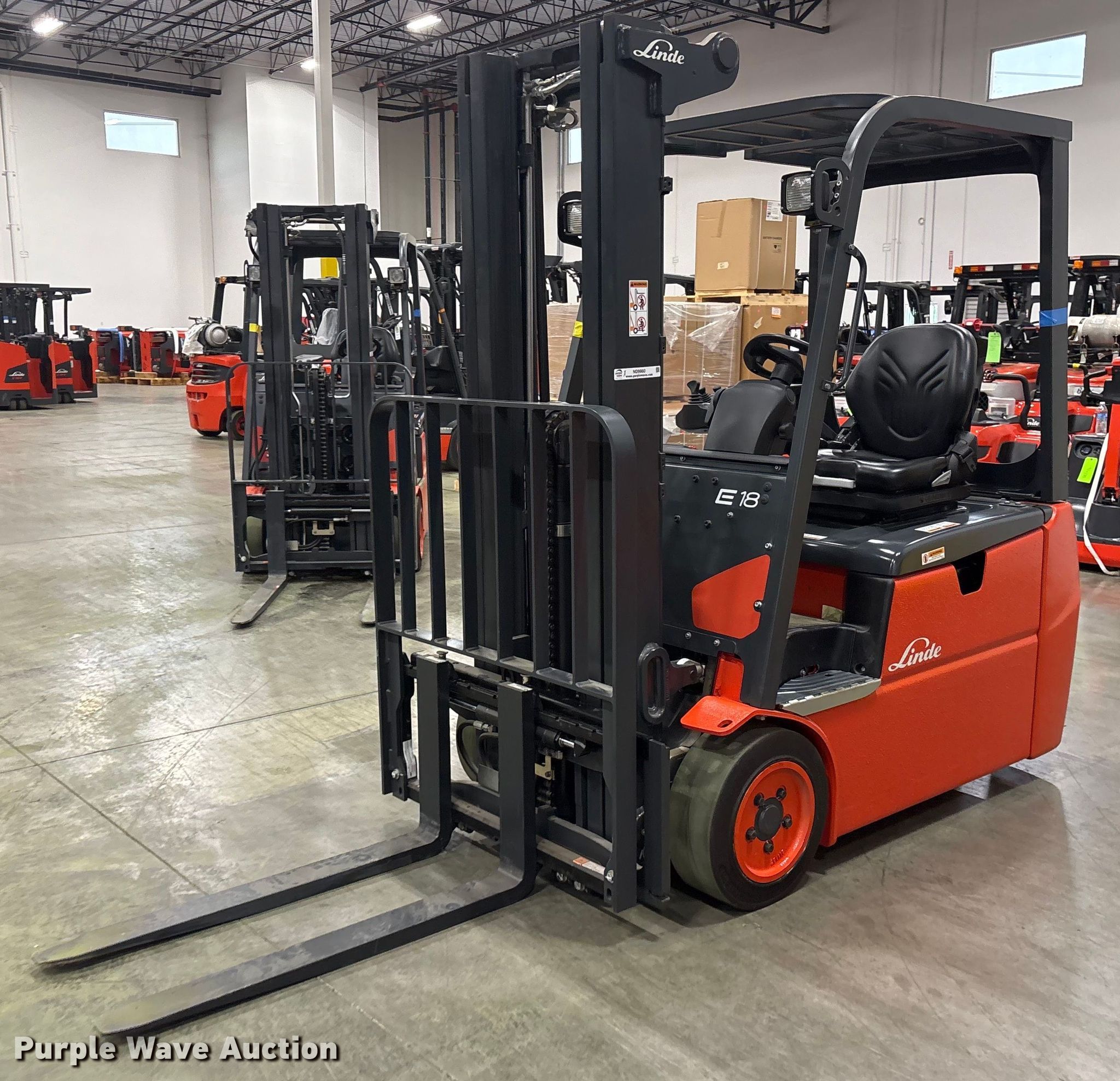 This 2023 Linde E18 forklift will sell to the highest bidder regardless of price.
