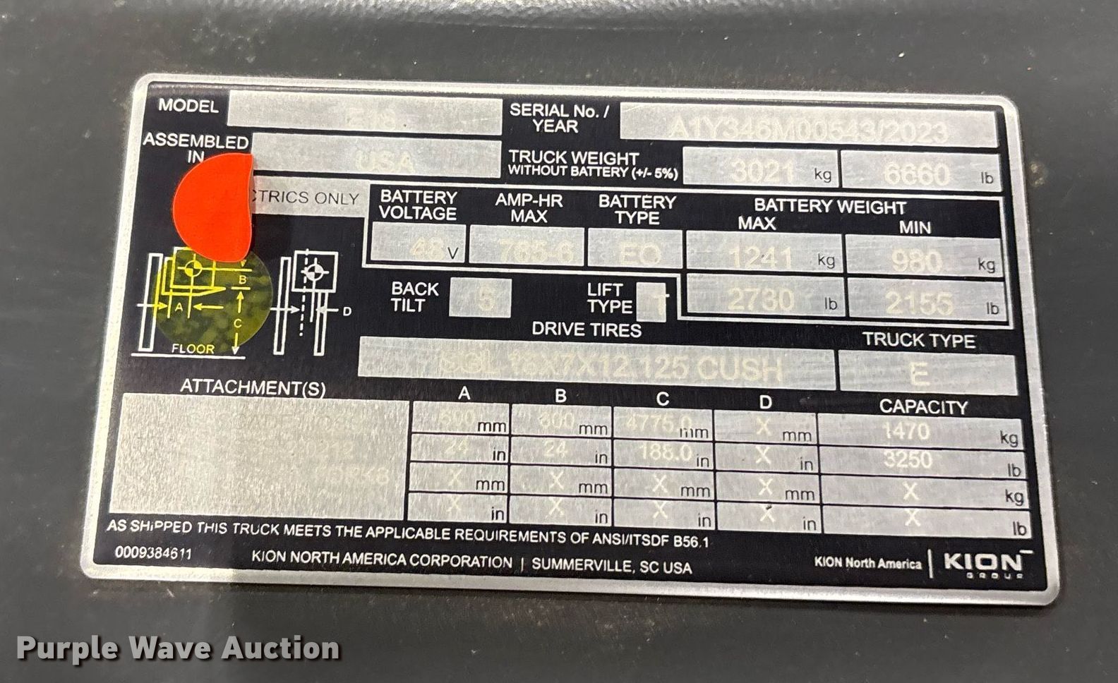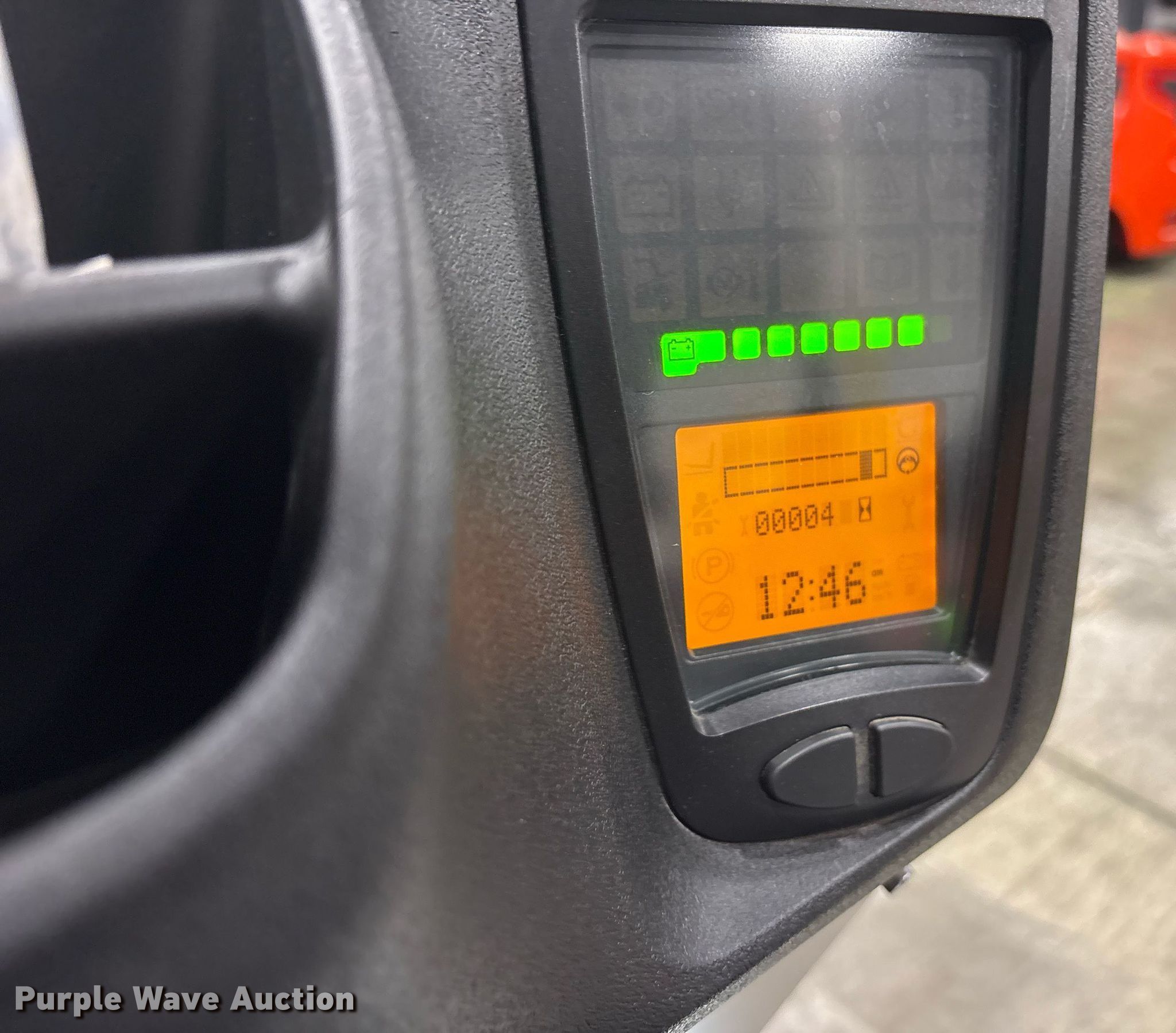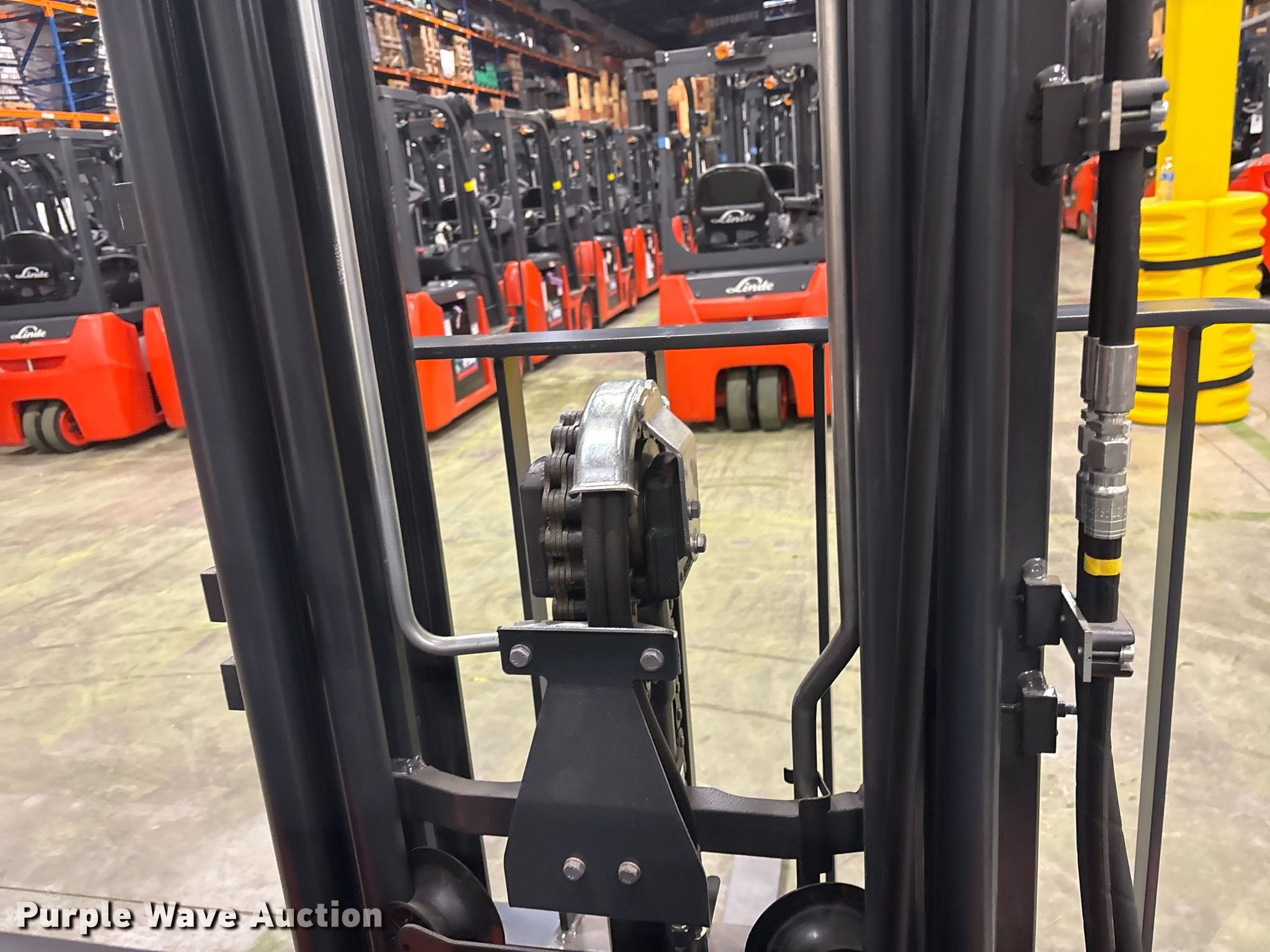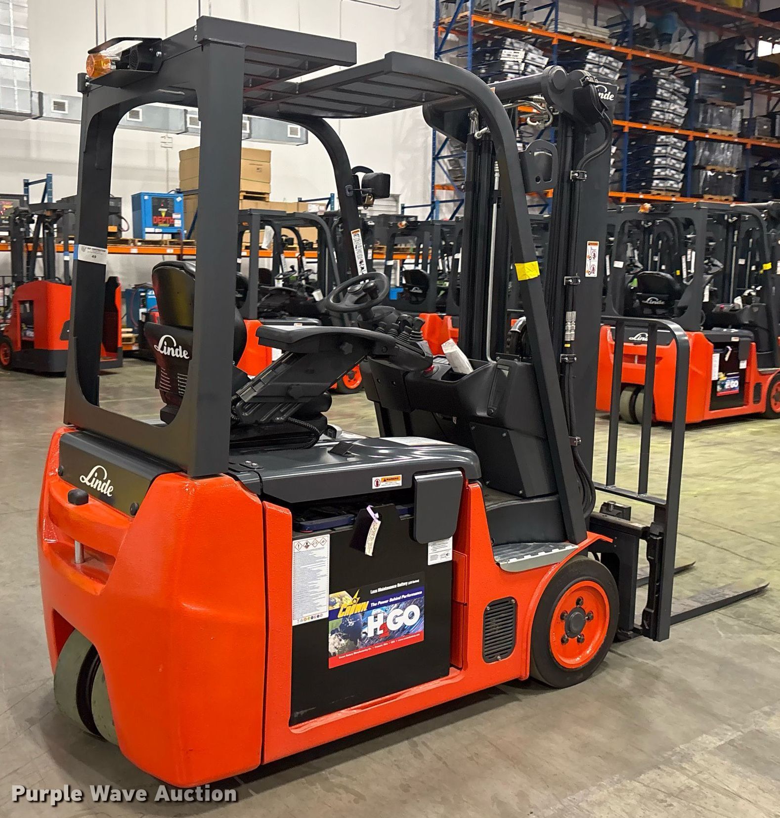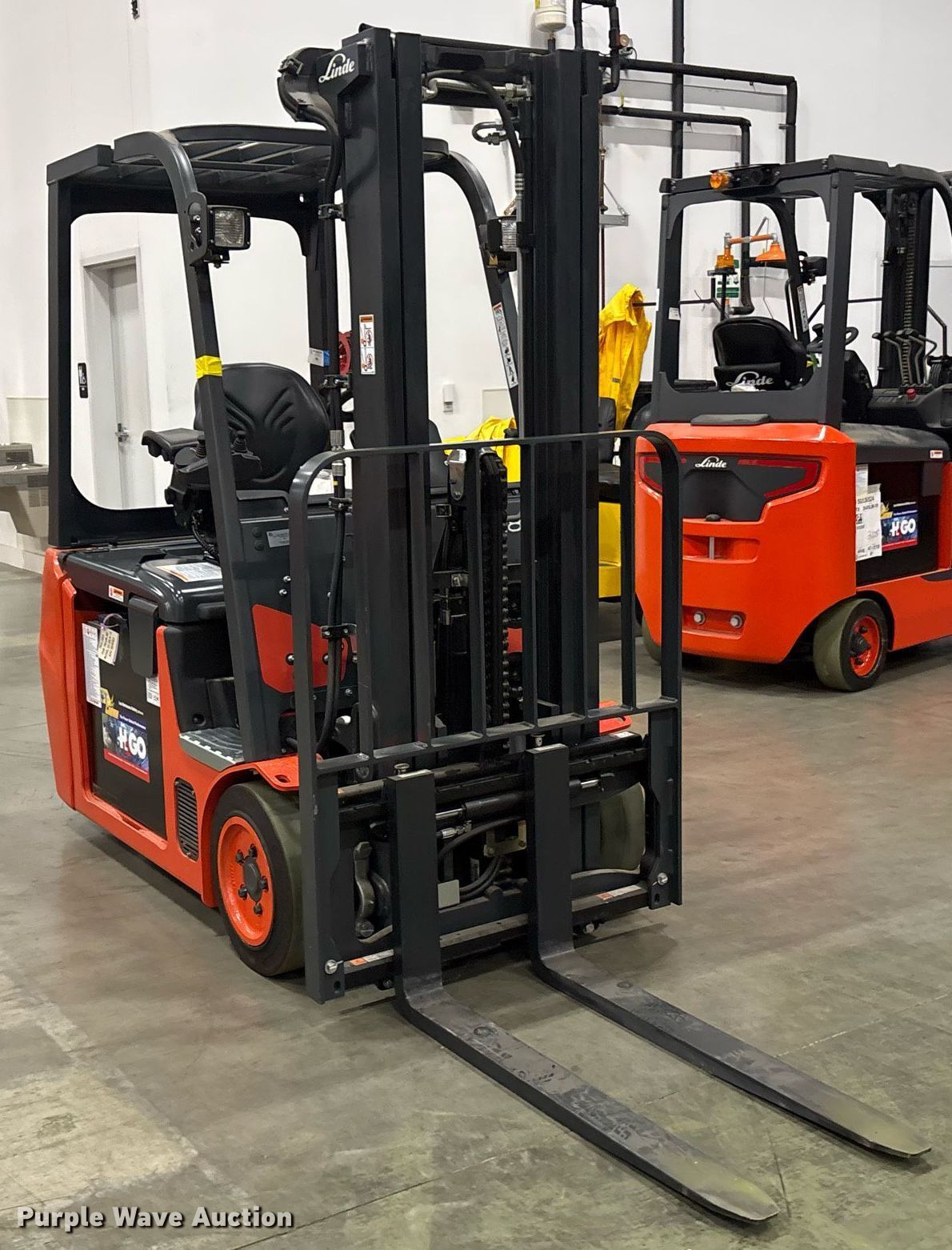 Purple Wave is selling a used Warehouse Forklift in Texas. This item is a 2023 Linde E18 forklift with the following: Hours: 4 on meter, Serial: A1Y346M00543