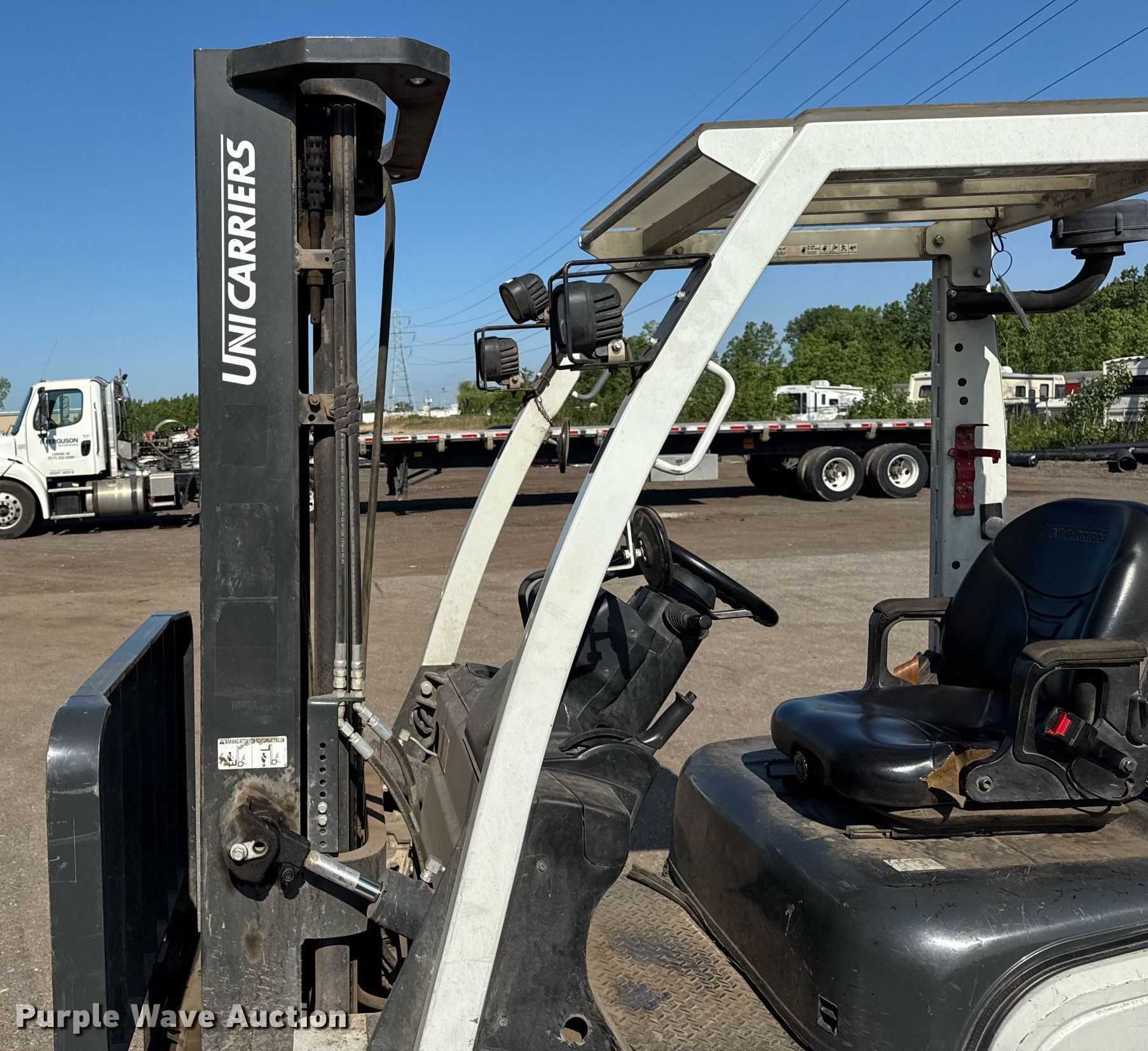 2016 UniCarriers PF50 forklift. Hours: 2,682 on meter, Serial: P1F2-9H21734, Unit #: SFS2123. Engine GCT HNFXB02.147D, Displacement: 2.1L, Cylinders: 4, Fuel type: LPG LP bottle: Not included. Transmission Automatic. Operators station OROPS, Canopy. Features Maximum lift capacity: 3,325 lbs, Maximum lift height: 203", Collapsed mast height: 89", Mast stages: 3, Side shift, Mast tilt, Fork positioner, Fork length: 48". Tires Front: 7.00-12, Rear: 6.00-9, Solid. Ferguson. Warren, MI 48089