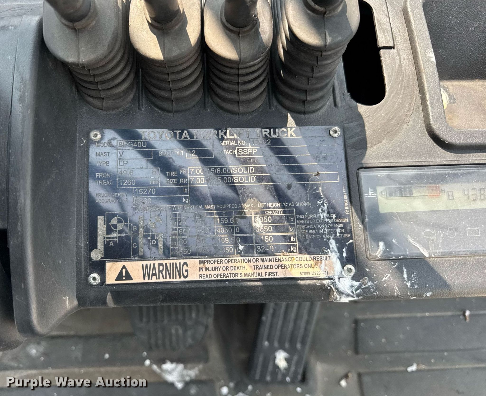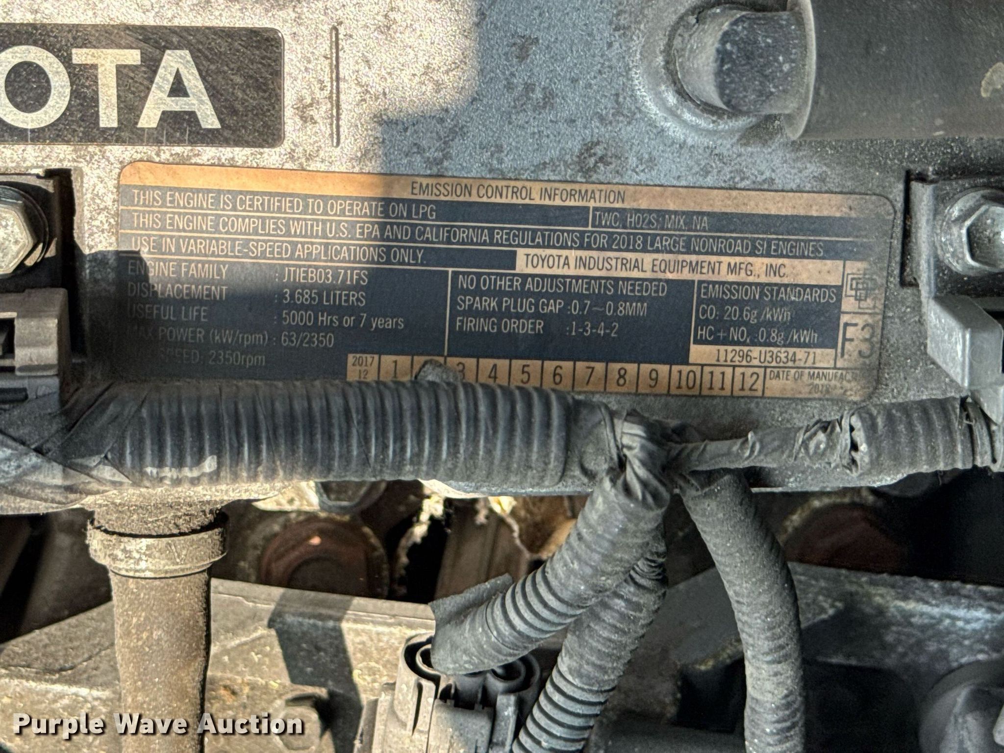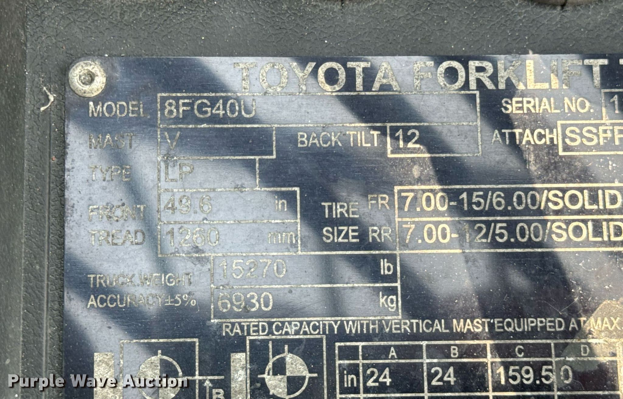 2018 Toyota 8FG40U forklift. Hours: 4,389 on meter, Serial: 12922, Unit #: SFS2103. Engine Toyota JTIEB03.71FS, Displacement: 3.685L, Cylinders: 4, Fuel type: LPG LP bottle: Not included. Transmission Powershift. Operators station Canopy. Features Maximum lift capacity: 7,150 lbs, Maximum lift height: 159", Collapsed mast height: 112", Mast stages: 3, Side shift, Mast tilt, Fork positioner, Fork length: 60". Tires Front: 7.00-15, Rear: 7.00-12, Solid. Notes Hydraulic issues, mast will not lower, Unit is in limp mode. Ferguson. Celina, OH 45822