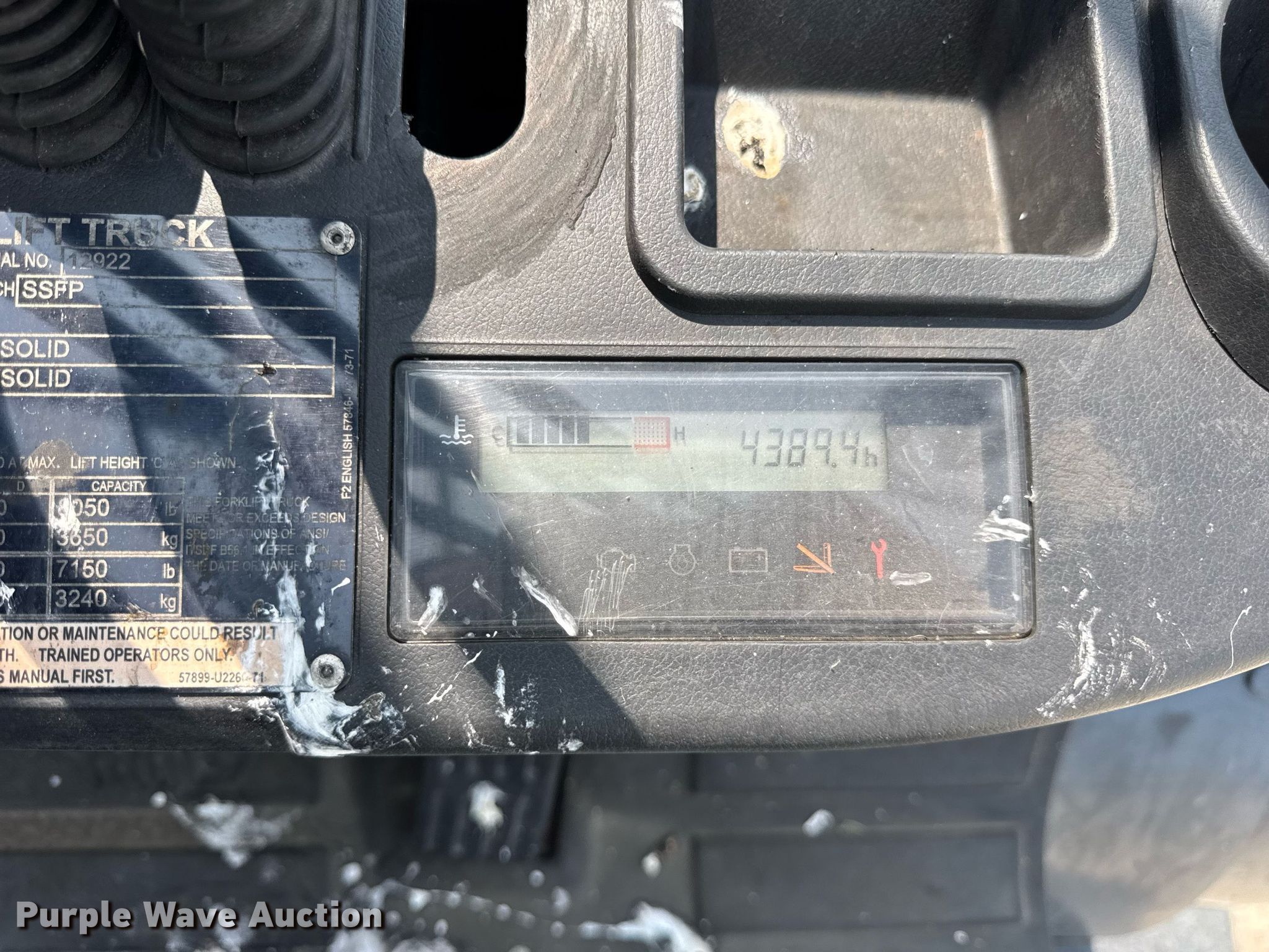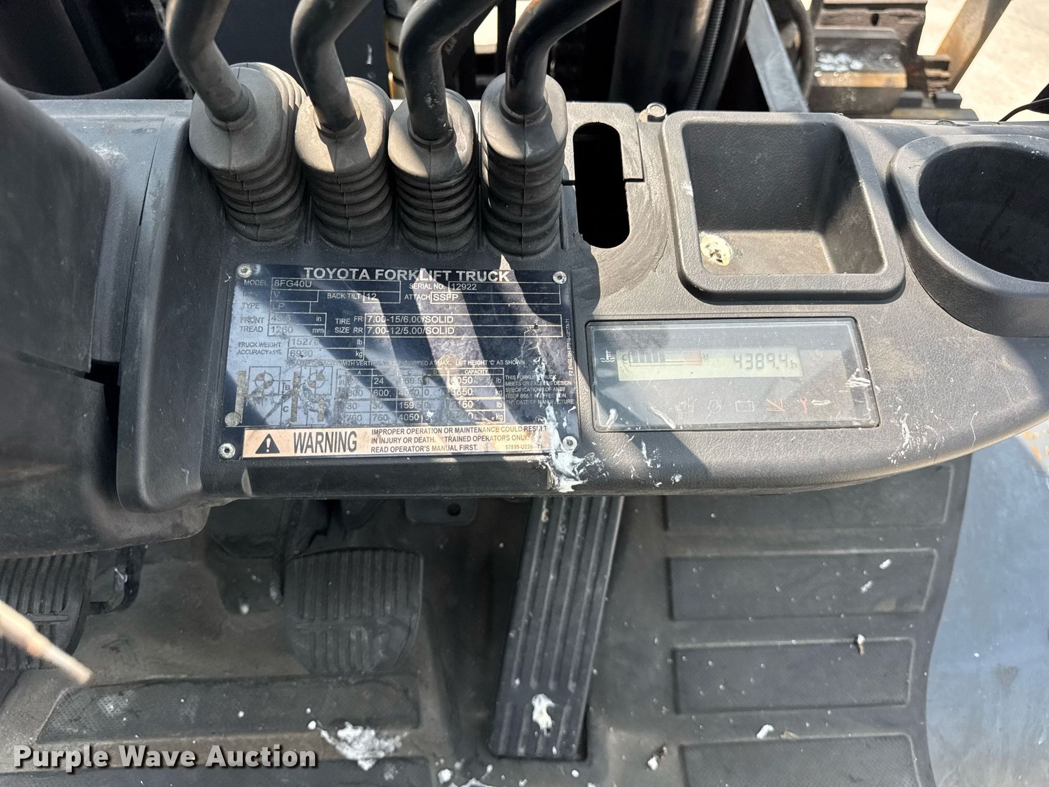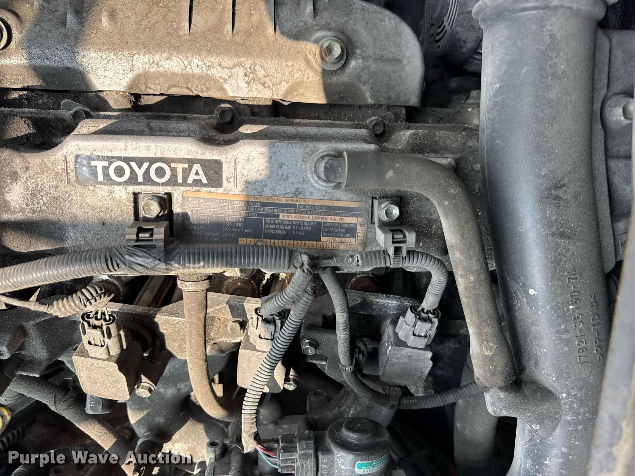 2018 Toyota 8FG40U forklift. Hours: 4,389 on meter, Serial: 12922, Unit #: SFS2103. Engine Toyota JTIEB03.71FS, Displacement: 3.685L, Cylinders: 4, Fuel type: LPG LP bottle: Not included. Transmission Powershift. Operators station Canopy. Features Maximum lift capacity: 7,150 lbs, Maximum lift height: 159", Collapsed mast height: 112", Mast stages: 3, Side shift, Mast tilt, Fork positioner, Fork length: 60". Tires Front: 7.00-15, Rear: 7.00-12, Solid. Notes Hydraulic issues, mast will not lower, Unit is in limp mode. Ferguson. Celina, OH 45822