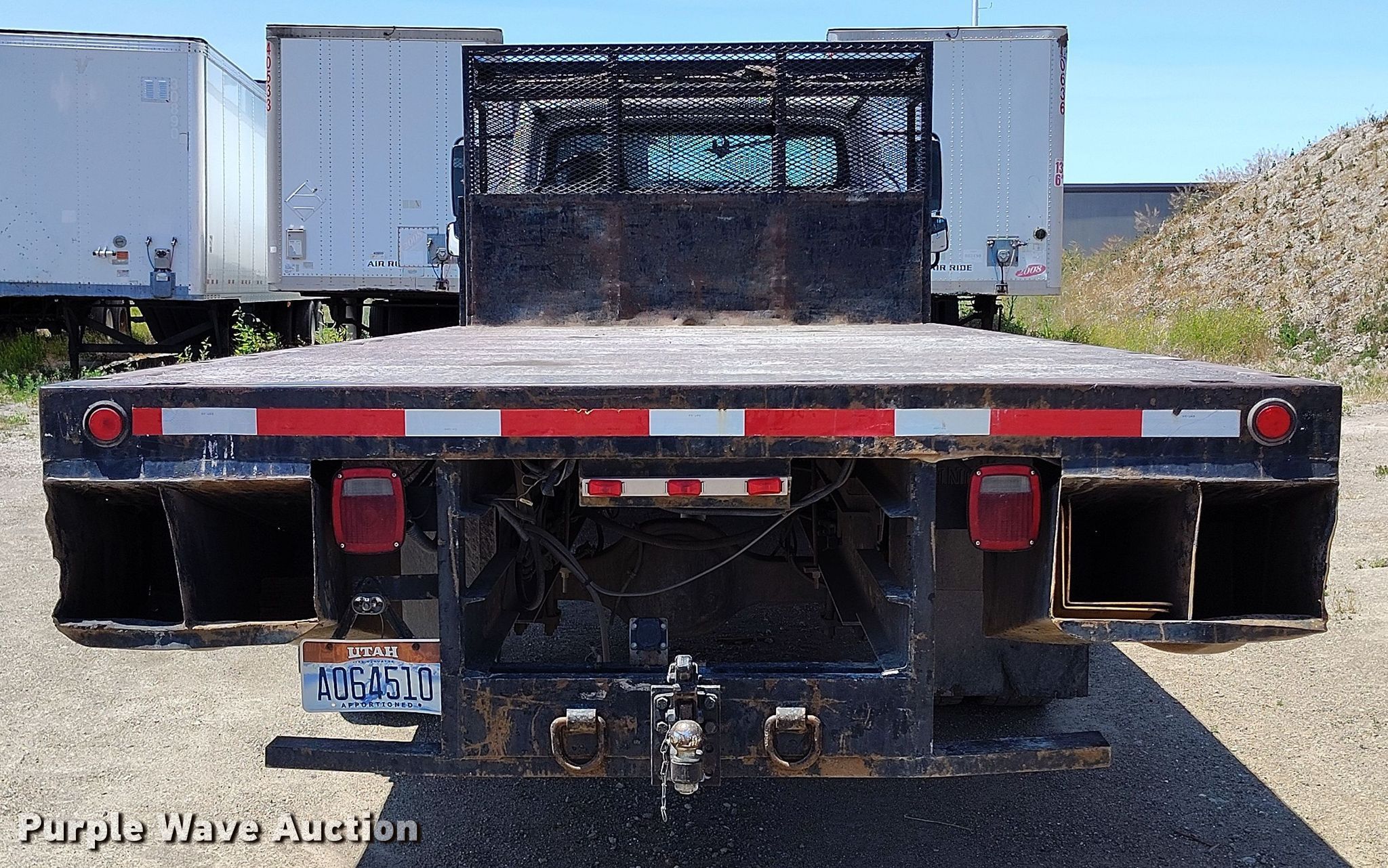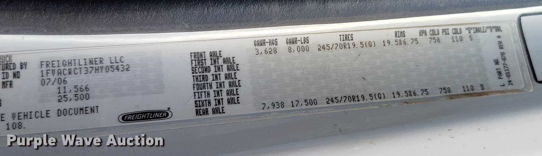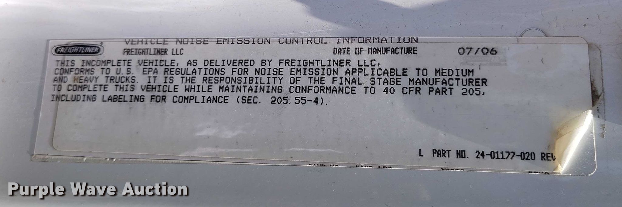 2007 Freightliner Business Class M2 flatbed truck. Miles: 369,944 on odometer, Hours: 18,351 on meter, VIN: 1FVACWCT37HY05432. Engine Mercedes Benz, Displacement: 6.4L, Cylinders: 6, Fuel type: Diesel. Transmission Automatic. Chassis Axles: Single, Suspension: Spring, Brakes: Air, GVWR: 25,500 lbs. Interior AC, Heat, Heated mirrors, Power windows, Power locks, Cruise control. Features Flatbed 20' L x 96" W, Auxiliary fuel tank, Fill-rite pump. Tires Size: 245/70R19.5. Notes Decals will be removed prior to auction, Windshield chipped or cracked. Utah title. Title distribution may be delayed up to 14 days from verification of funds. Suntec Concrete. Salt Lake City, UT 84104