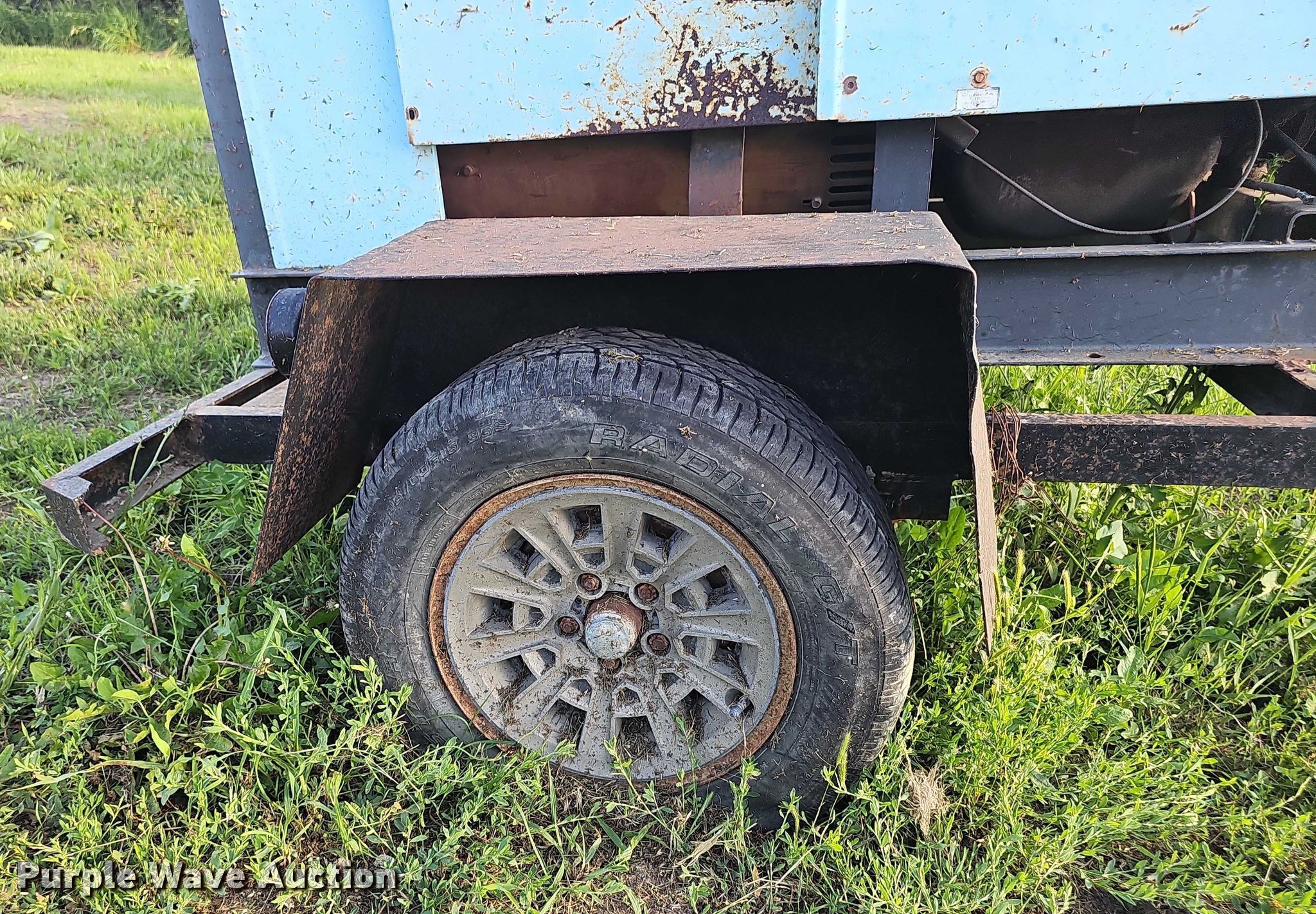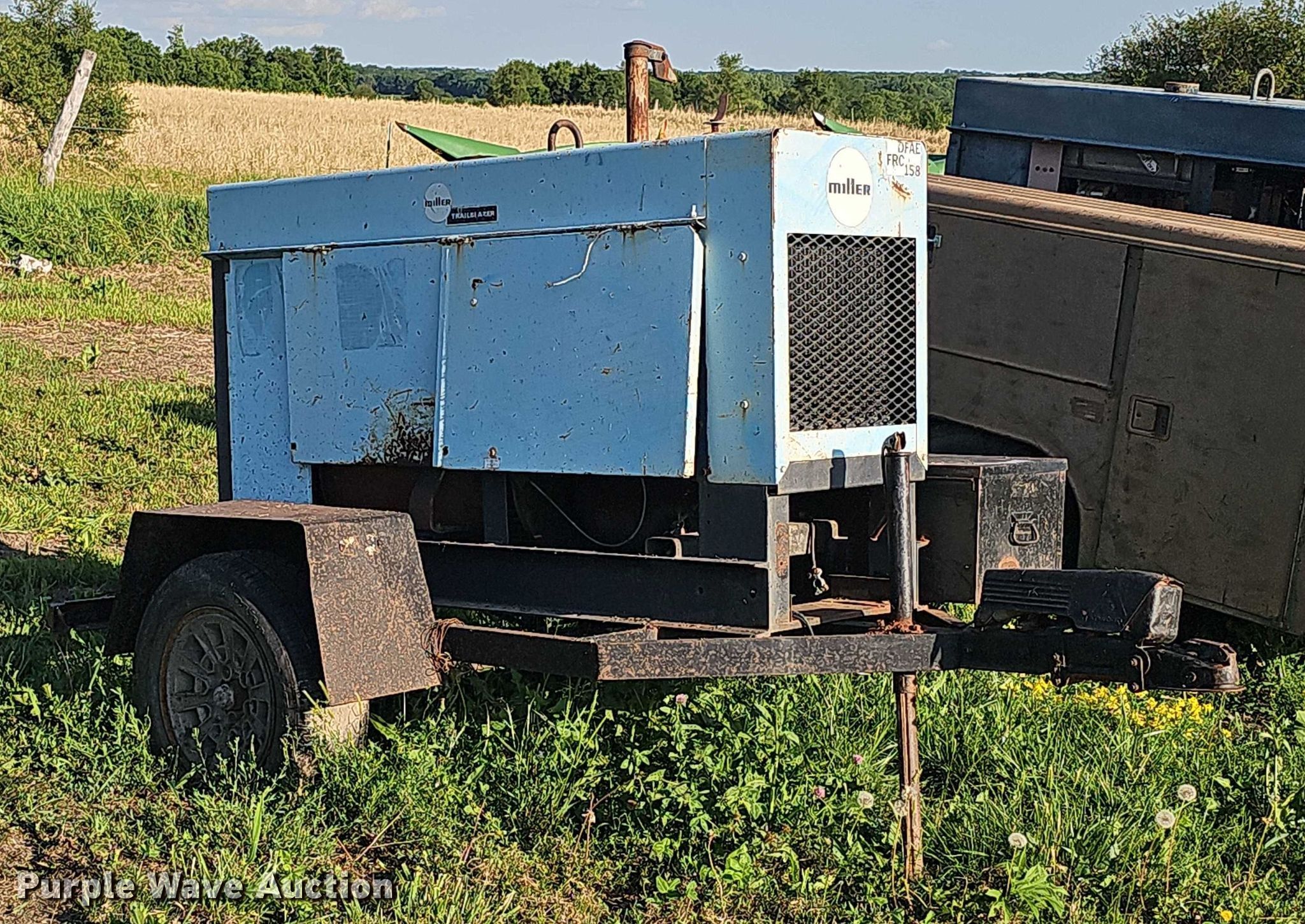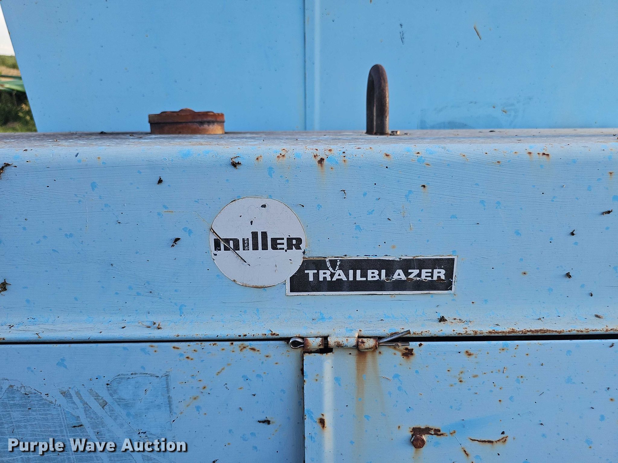 Miller Trailblazer welder/generator. Serial: 000294. Engine Cylinders: 4, Fuel type: Gas. Features Welder Leads, Fuel tank, Trailer mounted, Generator 120V outlets: 2. Trailer 9' L x 68" W, Ball hitch size: 2", Suspension: Spring, Axles: Single, Tire size: P225/60R15. Notes Flat tires, Non-operational unit. Kickapoo Tribe. Horton, KS 66439