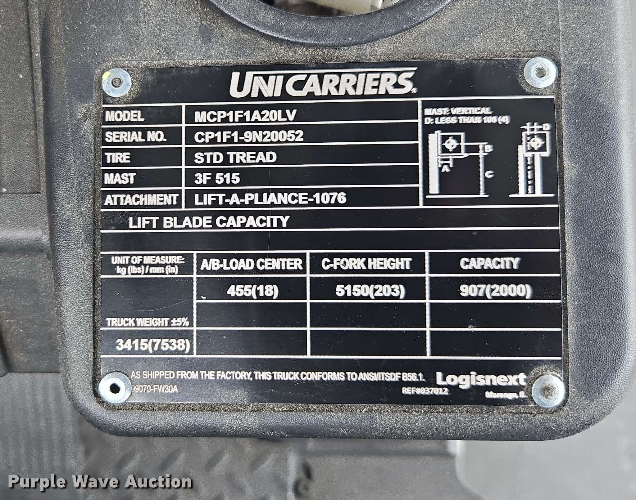 UniCarriers CFS40 forklift. Hours: 3,149 on meter. Engine GCT, Displacement: 2.1L, Cylinders: 4, Fuel type: LPG LP bottle: Not included. Transmission Automatic. Operators station OROPS. Features Maximum lift capacity: 2,910 lbs, Maximum lift height: 203", Collapsed mast height: 88", Mast stages: 3, Side shift, Mast tilt. Tires Front: 18x6x12.125, Rear: 14x5x10, Solid. Notes Cap carton material handler not included. Ferguson. North Charleston, SC 29405