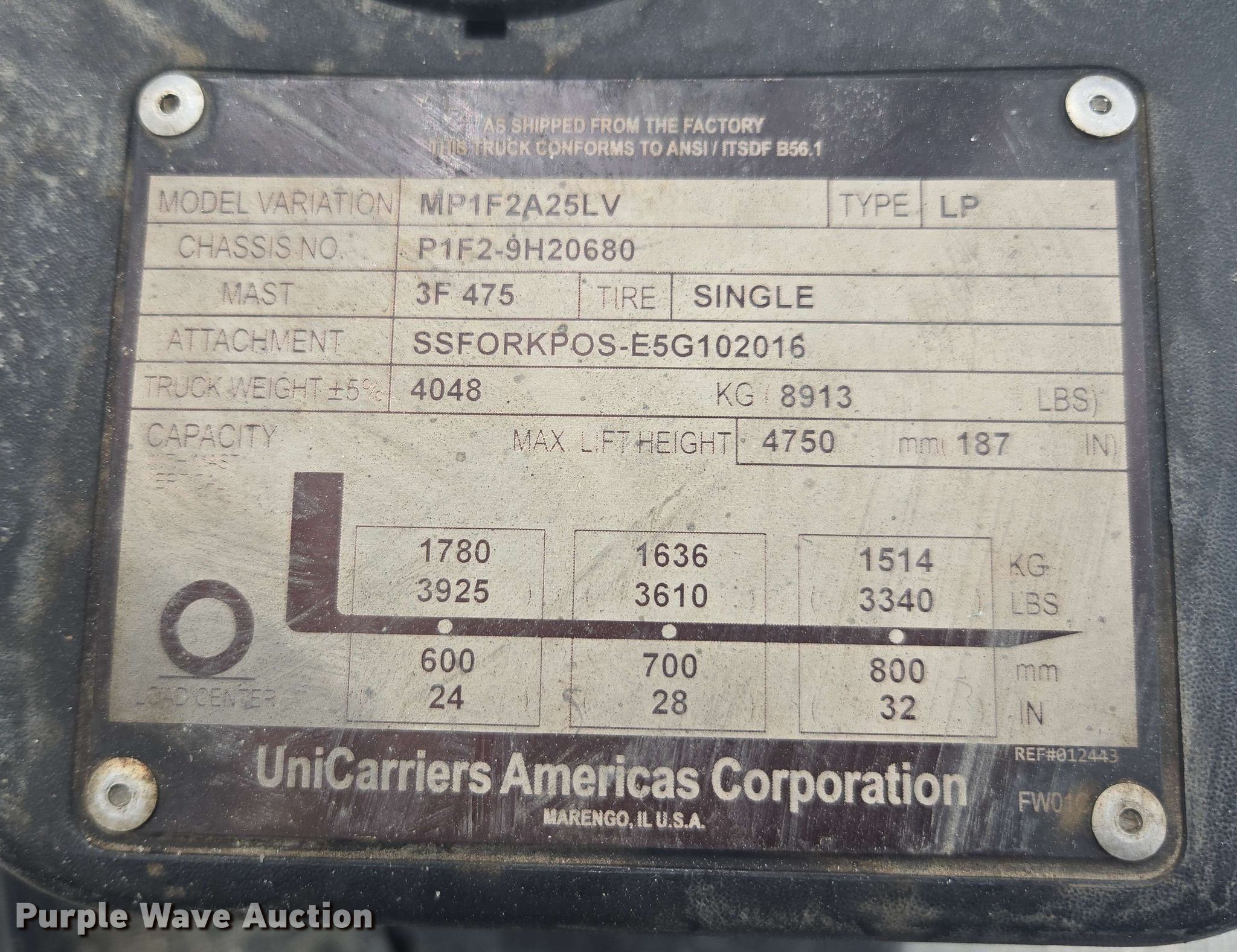 2016 UniCarriers PF50 forklift. Hours: 4,973 on meter, Serial: P1F2-9H20680. Engine GCT, Displacement: 2.1L, Cylinders: 4, Fuel type: LPG LP bottle: Not included. Transmission Automatic. Operators station OROPS, Canopy. Features Maximum lift capacity: 3,925 lbs, Maximum lift height: 187", Collapsed mast height: 83", Mast stages: 3, Side shift, Mast tilt, Fork positioner, Fork length: 48". Tires Front: 7.00-12, Rear: 6.00-9, Solid. Ferguson. Kernersville, NC 27284
