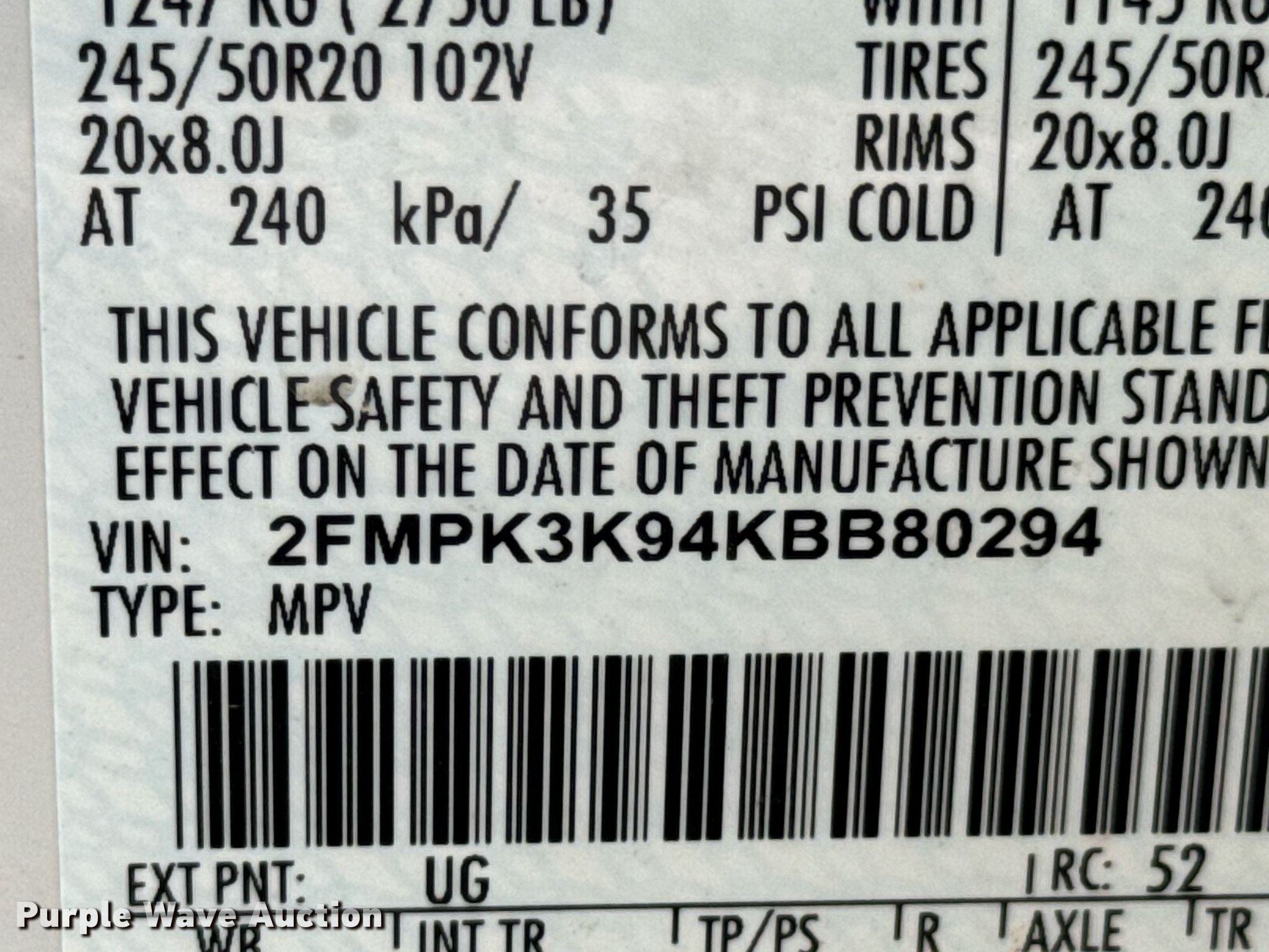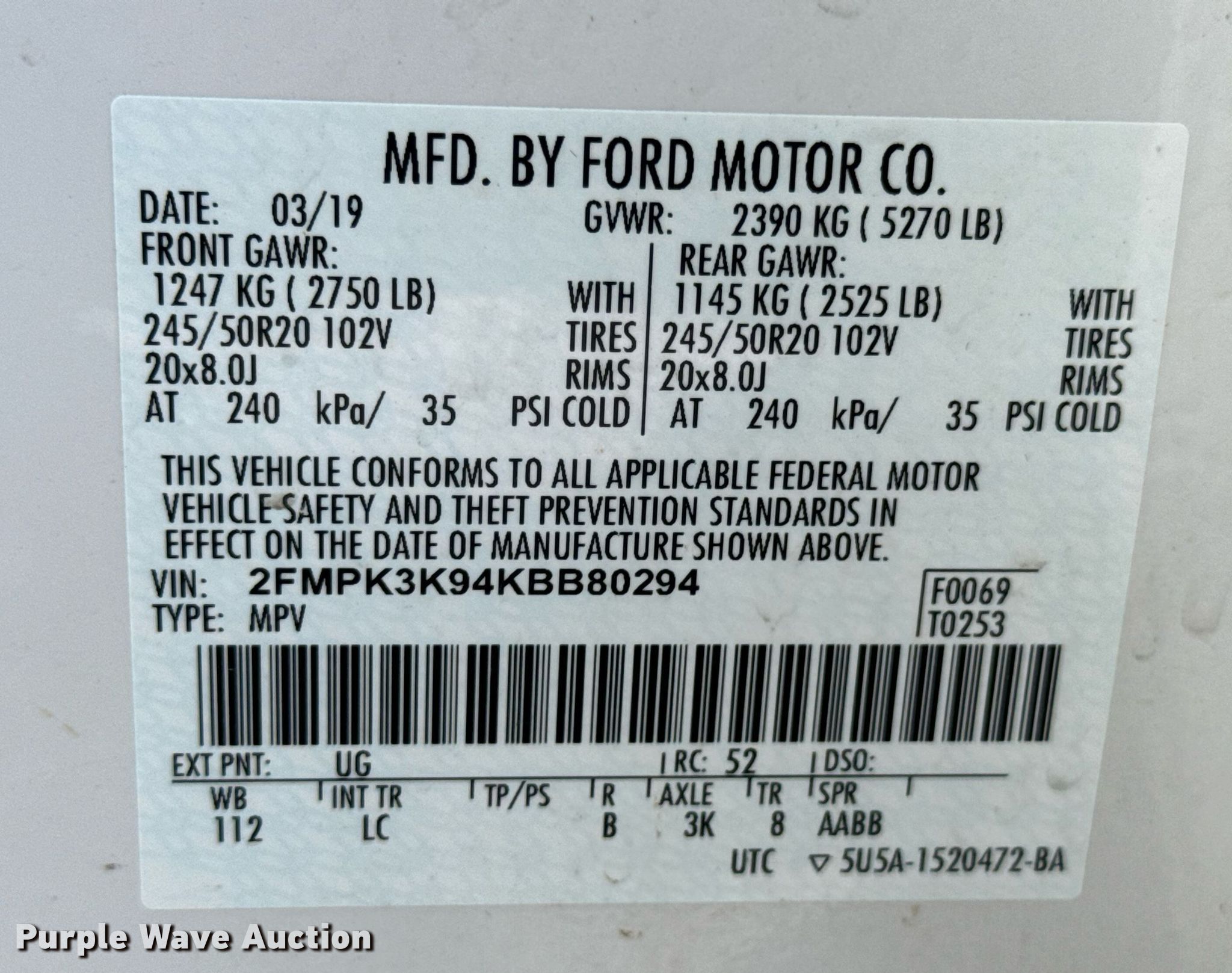 Purple Wave is selling a used Passenger Vehicle in Oklahoma. This item is a 2019 Ford Edge SUV with the following: Miles: 137,590 on odometer, VIN: 2FMPK3K94KBB80294, Unit #: 101014