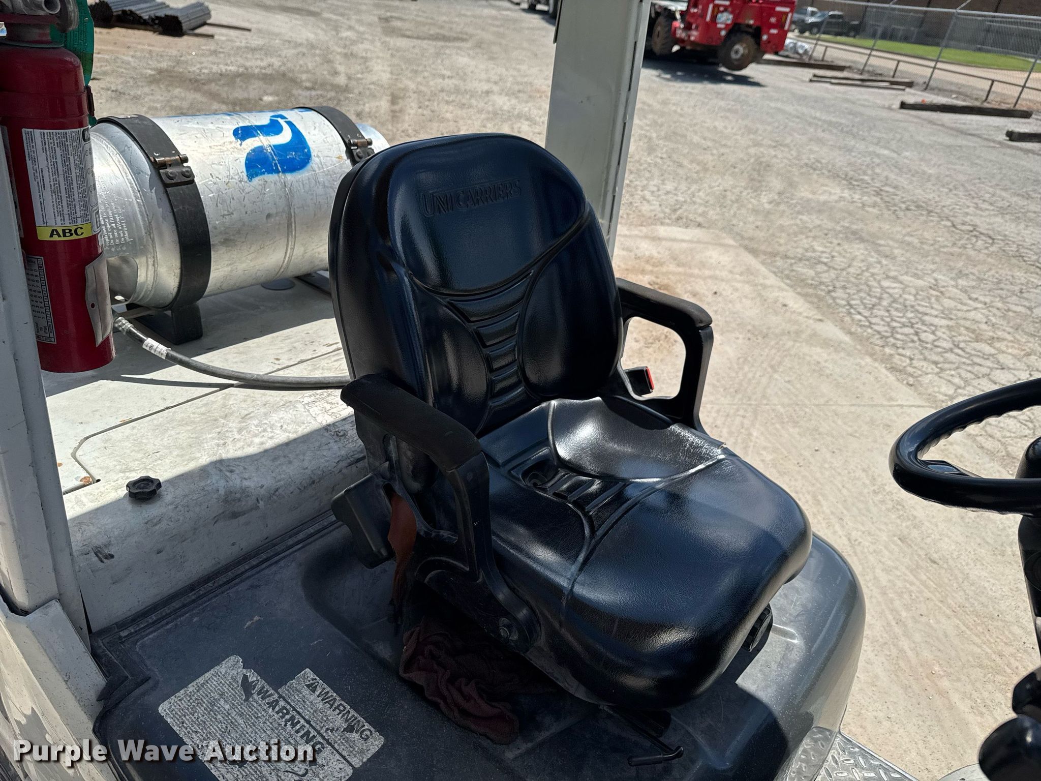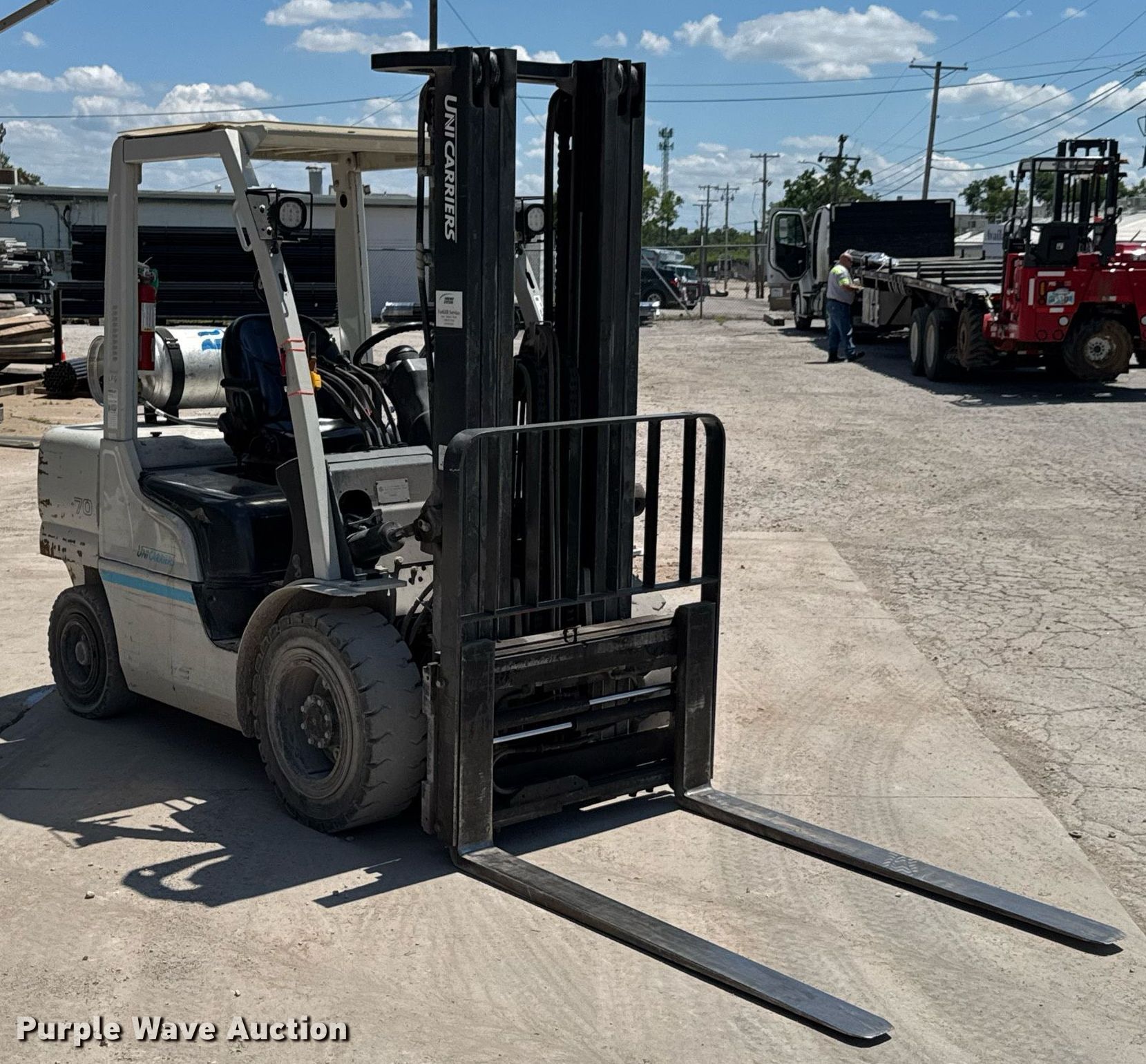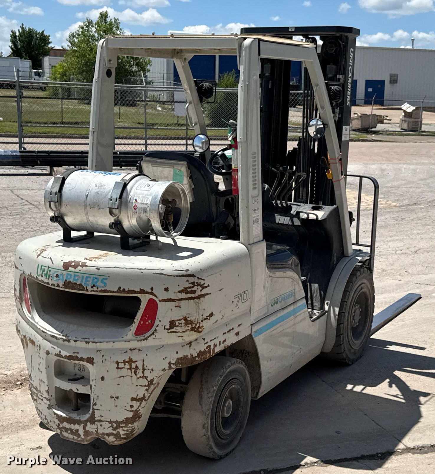 2016 UniCarriers PF70 forklift. Hours: 2,742 on meter, Serial: UG1F2-9L20606. Engine GCT, Displacement: 2.5L, Cylinders: 4, Fuel type: LPG LP bottle: Not included. Transmission Automatic. Operators station OROPS, Canopy. Features Maximum lift capacity: 6,025 lbs, Maximum lift height: 191", Mast stages: 3, Side shift, Mast tilt, Fork positioner, Fork length: 60". Tires Front: 250-15, Rear: 6.50-10. Ferguson. Tulsa, OK 74112
