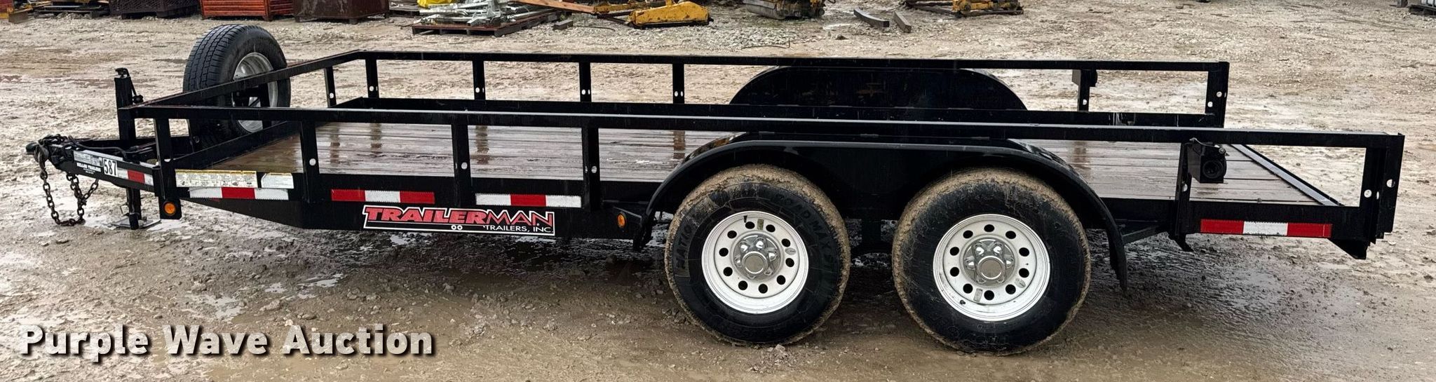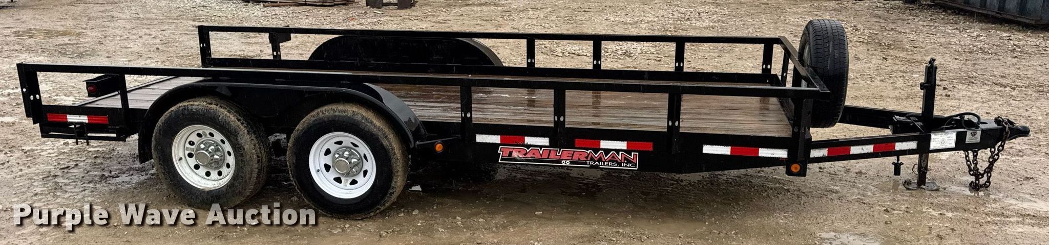 2016 Trailerman utility trailer. VIN: 5L3AX1627GL001506, Unit #: 587. Dimensions Overall: 21' 2" L x 98" W, Deck: 16' L x 76" W, Side height: 14", Ramps: Manual Length: 5'. Features Deck type: Wood. Chassis Ball hitch: 2 5/16", Landing gear: Single, Suspension: Spring, Brakes: Electric, Axles: Tandem, GVWR: 10,000 lbs, GAWR: 5,000 lbs. Tires Steel wheels, Size: ST225/75R15. Missouri title. Title has a lien that will be released following the close of the auction. Title distribution may be delayed up to 30 days from verification of funds. Hardy Holding Group. Boonville, MO 65233