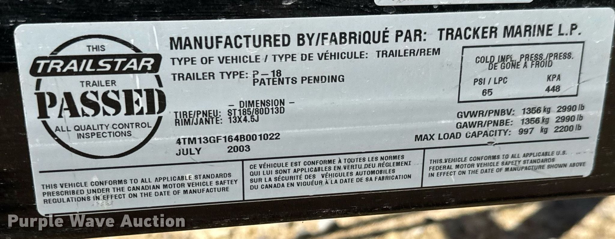2004 Tracker Bass Buggy 18 pontoon boat. Length: 18', Hull ID: BUJ16304H304. Engine Engine type: Outboard, 2003 Mercury Tracker 50, Serial: OT852184, Displacement: 967 cc, Cylinders: 3, Fuel type: Gas, HP: 50, Outdrive Propeller: Stainless steel. Operators station Capacity Person: 7, 985 lbs, Depth finder: Eagle Fish Mark 320. Features Bimini top. Trailer 2003 Tracker Marine L.P. P-18, VIN: 4TM13GF164B001022, Overall length: 22' 6", Overall width: 92", GVWR: 2,990 lbs, Ball hitch size: 2", Axles: Single, Tire size: 185/80D13. Boat: Texas title. Trailer: Texas title. Motor: Texas title. Title distribution may be delayed up to 14 days from verification of funds.. Buhler, KS 67522