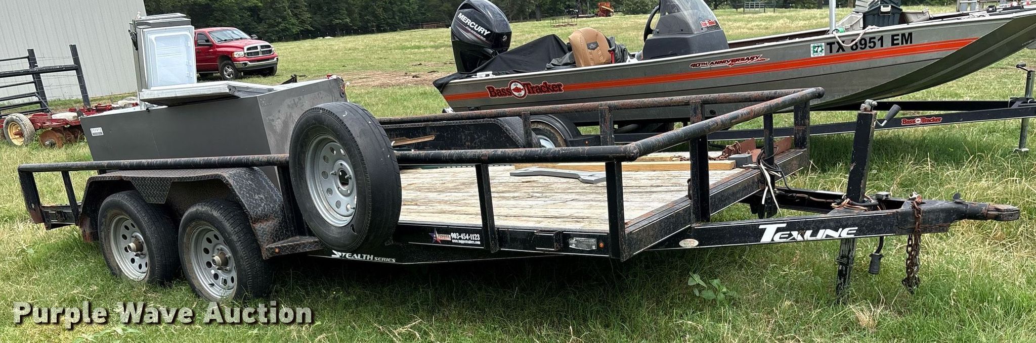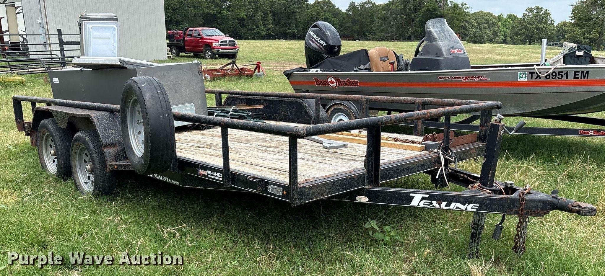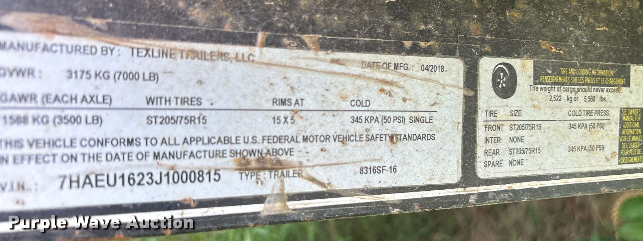 2018 Texline 8316SF-16 utility trailer. VIN: 7HAEU1623J1000815. Dimensions Overall: 20' L x 8' 6" W, Deck: 16' L x 83" W, Side height: 13", Deck height: 22". Features Deck type: Wood. Chassis Ball hitch: 2", Landing gear: Single, Suspension: Spring, Axles: Tandem, GVWR: 7,000 lbs, GAWR: 3,500 lbs. Tires Steel wheels, Size: 205/75R15. Notes Spare tire damage, hole, Contents not included. Texas title. Title distribution may be delayed up to 30 days from verification of funds. Alba, TX 75410