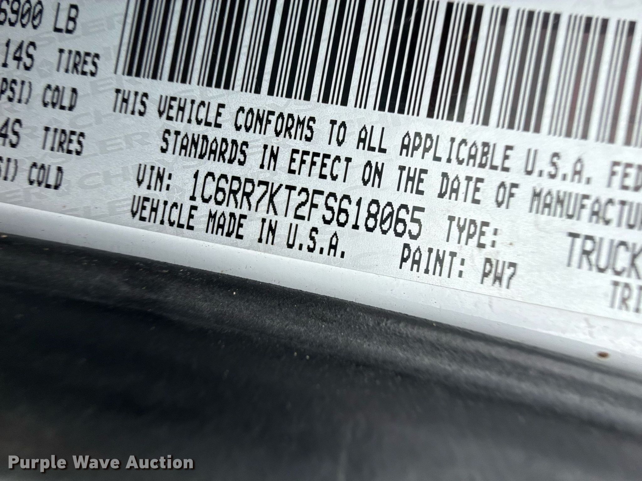 2015 Dodge Ram 1500 Crew Cab pickup truck. Miles: 174,816 on odometer, VIN: 1C6RR7KT2FS618065. Engine Displacement: 5.7L V8 OHV, Cylinders: 8, Fuel type: Gas. Transmission Automatic, Four wheel drive. Interior AC, Heat, Power windows, Power locks, Cruise control, Backup camera. Tires Size: 275/60R20. Notes Dash warning indicator: Check engine. Kansas title. Title distribution may be delayed up to 14 days from verification of funds. Stoppel Dirt Inc.. Sublette, KS 67877