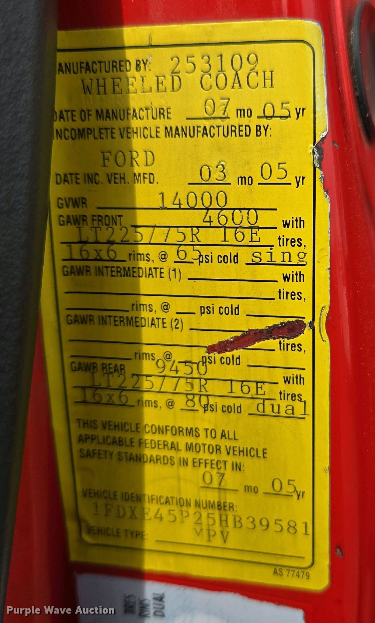 2005 Ford E450 Super Duty ambulance. Miles: 135,166 on odometer, VIN: 1FDXE45P25HB39581. Engine Displacement: 6.0L, Cylinders: 8, Fuel type: Diesel. Transmission Automatic. Chassis Axles: Single, Suspension: Spring, Brakes: Hydraulic, GVWR: 14,050 lbs, Wheelbase: 158". Interior AC, Heat, Power windows, Power locks, Cruise control. Features Ambulance body Wheeled Coach, PA/ siren controls. Tires Size: 225/75R16. Notes Dash warning indicator: ABS. California salvaged title. Title distribution may be delayed up to 30 days from verification of funds. Sacramento, CA 95838