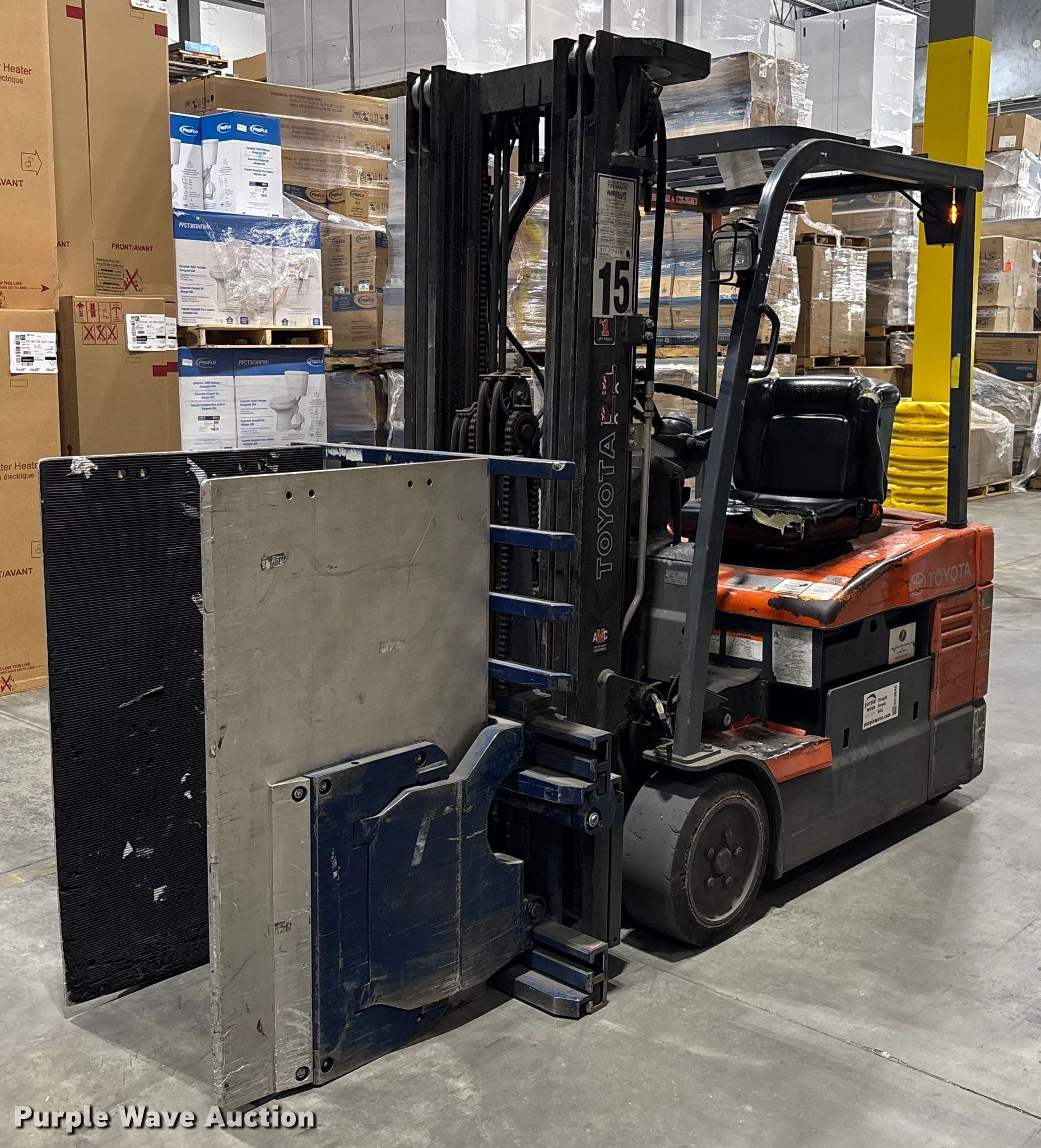 Toyota 7FBEU18 forklift. Hours: 6,000 on meter, Miles or hours may vary, unit still in use, Serial: 28092. Electric Motor Volts: 36. Transmission Electric drive. Operators station OROPS. Features Maximum lift capacity: 2,900 lbs, Maximum lift height: 189", Collapsed mast height: 83", Mast stages: 3, Side shift, Mast tilt, Cap carton material handler. Tires Front: 457/178-308, Solid. Ferguson. Jacksonville, FL 32256