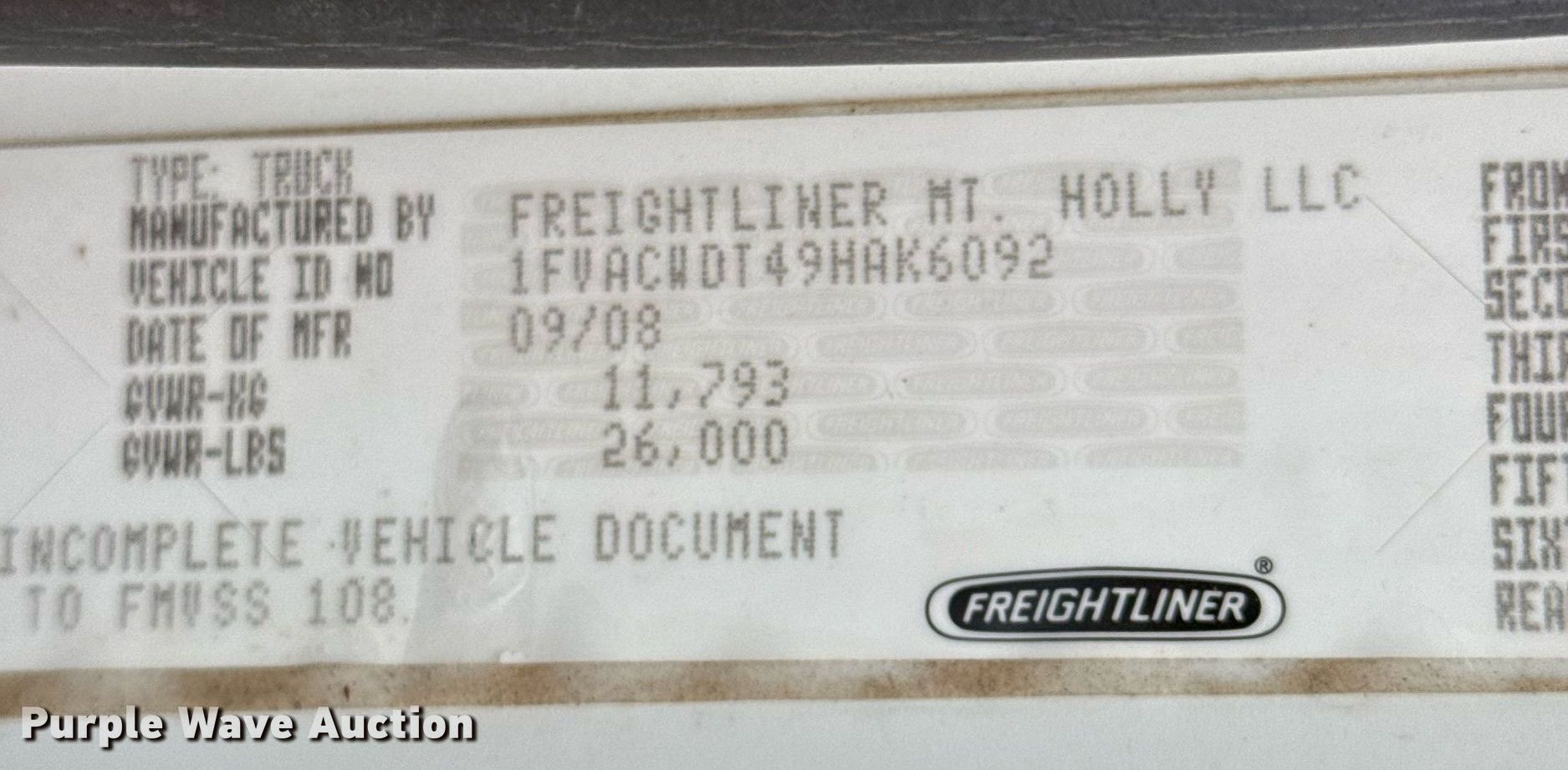 Purple Wave is selling a used Truck Chassis in Texas. This item is a 2009 Freightliner M2 truck cab and chassis with the following: Miles: 348,018 on odometer, Hours: 12,487 on meter, VIN: 1FVACWDT49HAK6092, Unit #: 2117