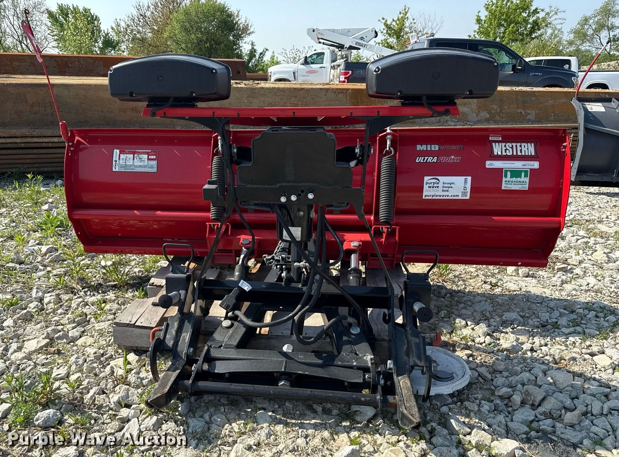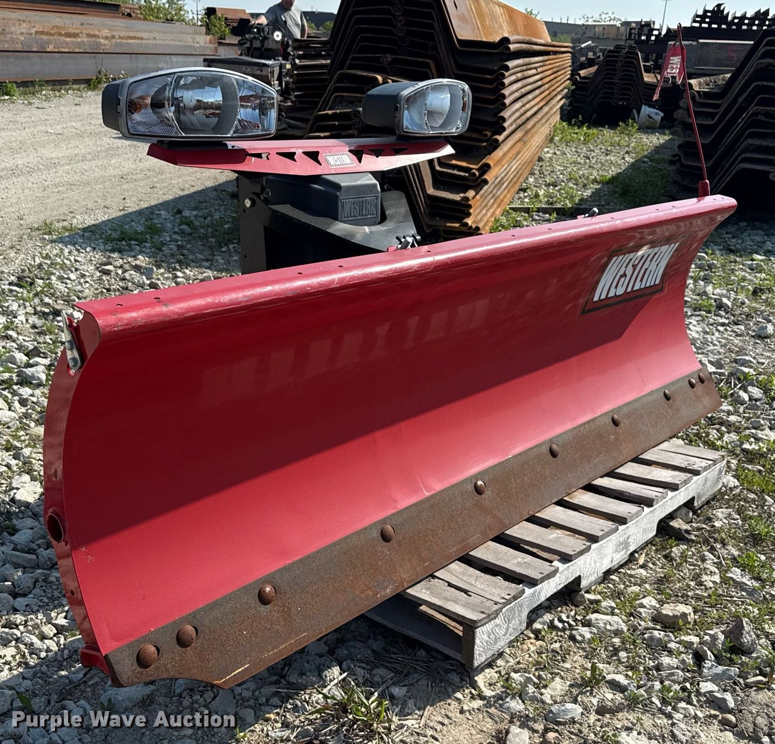 Western Mid Weight Plow snow plow. Serial: 74340. Features Plow Width: 90", Ultra mount two mounting. Snow Management Equipment Auction. South Holland, IL 60473
