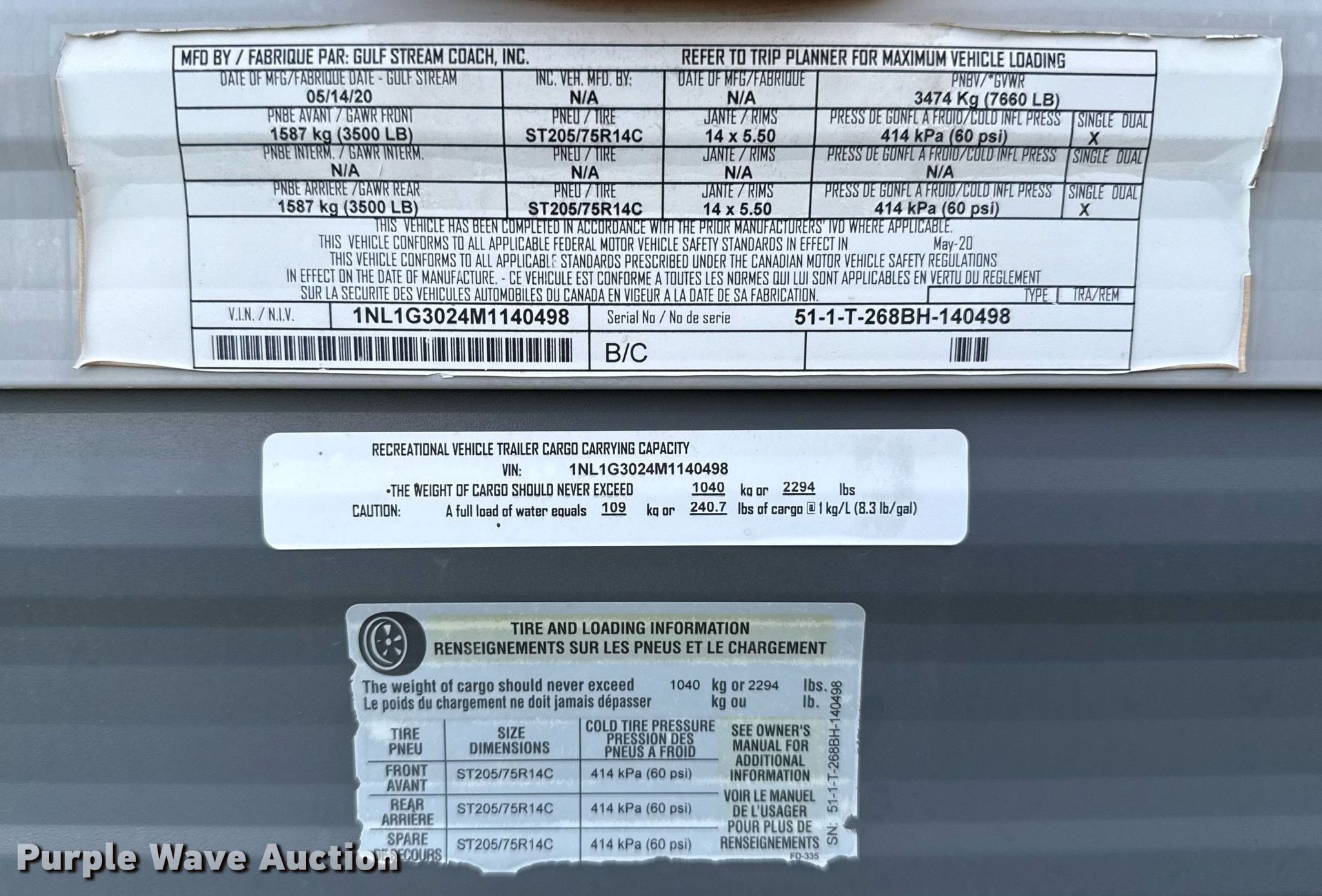 Purple Wave is selling a used RV or Camper in Oklahoma. This item is a 2021 Gulf Stream Coach King Sport camper with the following: Camper length: 30', VIN: 1NL1G3024M1140498, Insurance salvage unit claim #: 5-804376