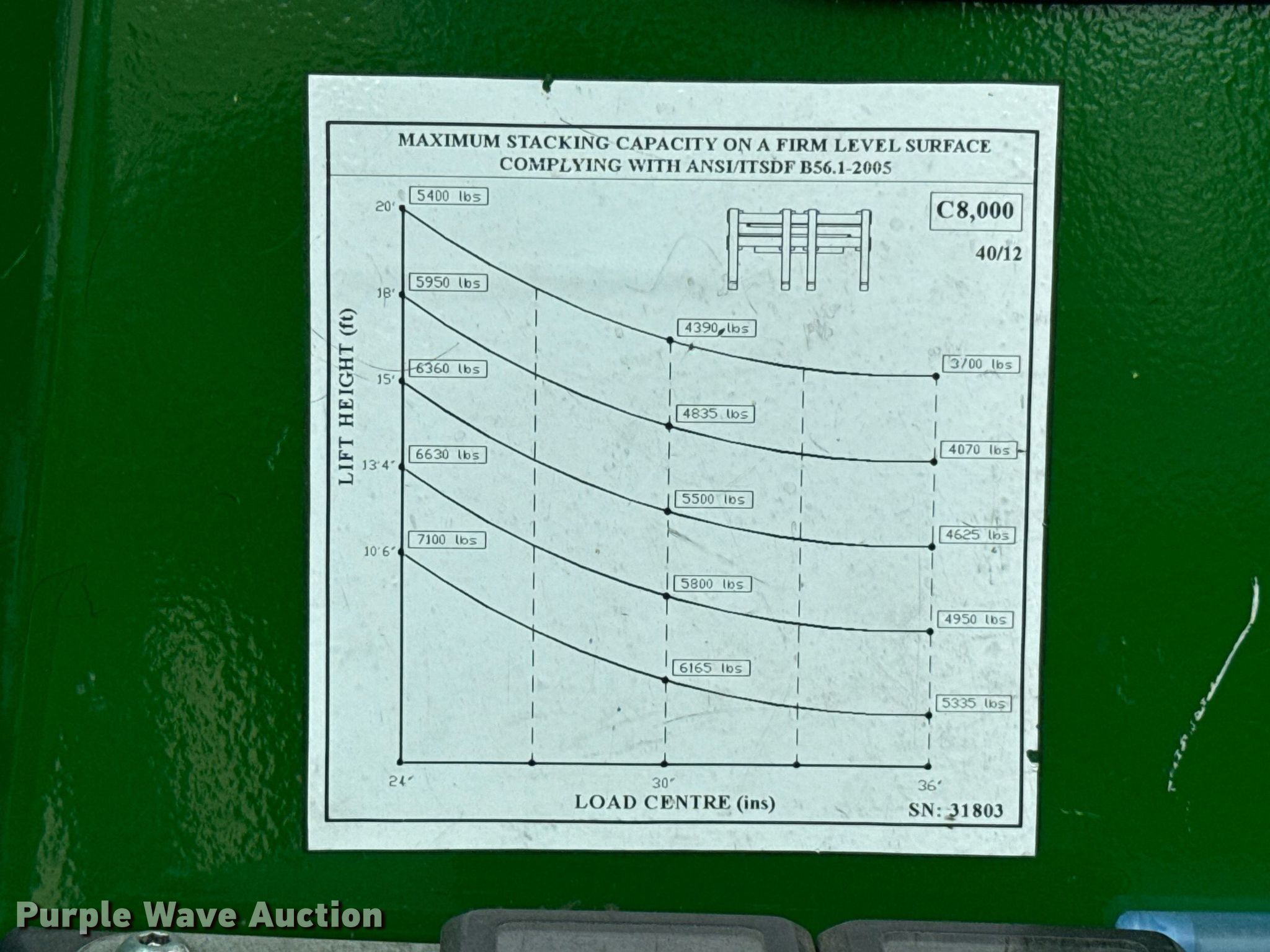 2016 CombiLift C8000 forklift. Hours: 1,097 on meter, Miles or hours may vary, unit still in use, Serial: 31803, Unit #: SFS2163. Engine Cylinders: 4, Fuel type: LPG LP bottle: Not included. Transmission Hydrostatic. Operators station OROPS. Features Maximum lift capacity: 7,100 lbs, Maximum lift height: 240", Collapsed mast height: 112", Mast stages: 3, Side shift, Mast tilt, Fork positioner, Fork length: 47". Tires Front: 200/50-10, Rear: 27X10-12, Solid. Ferguson. Oklahoma City, OK 73107