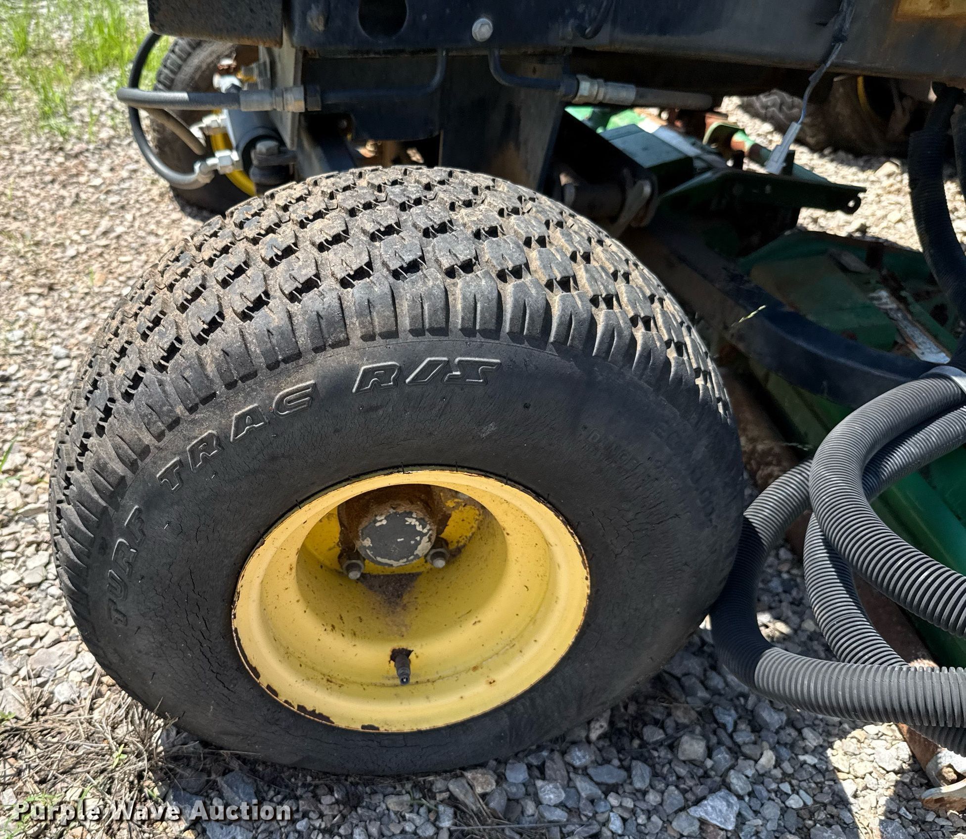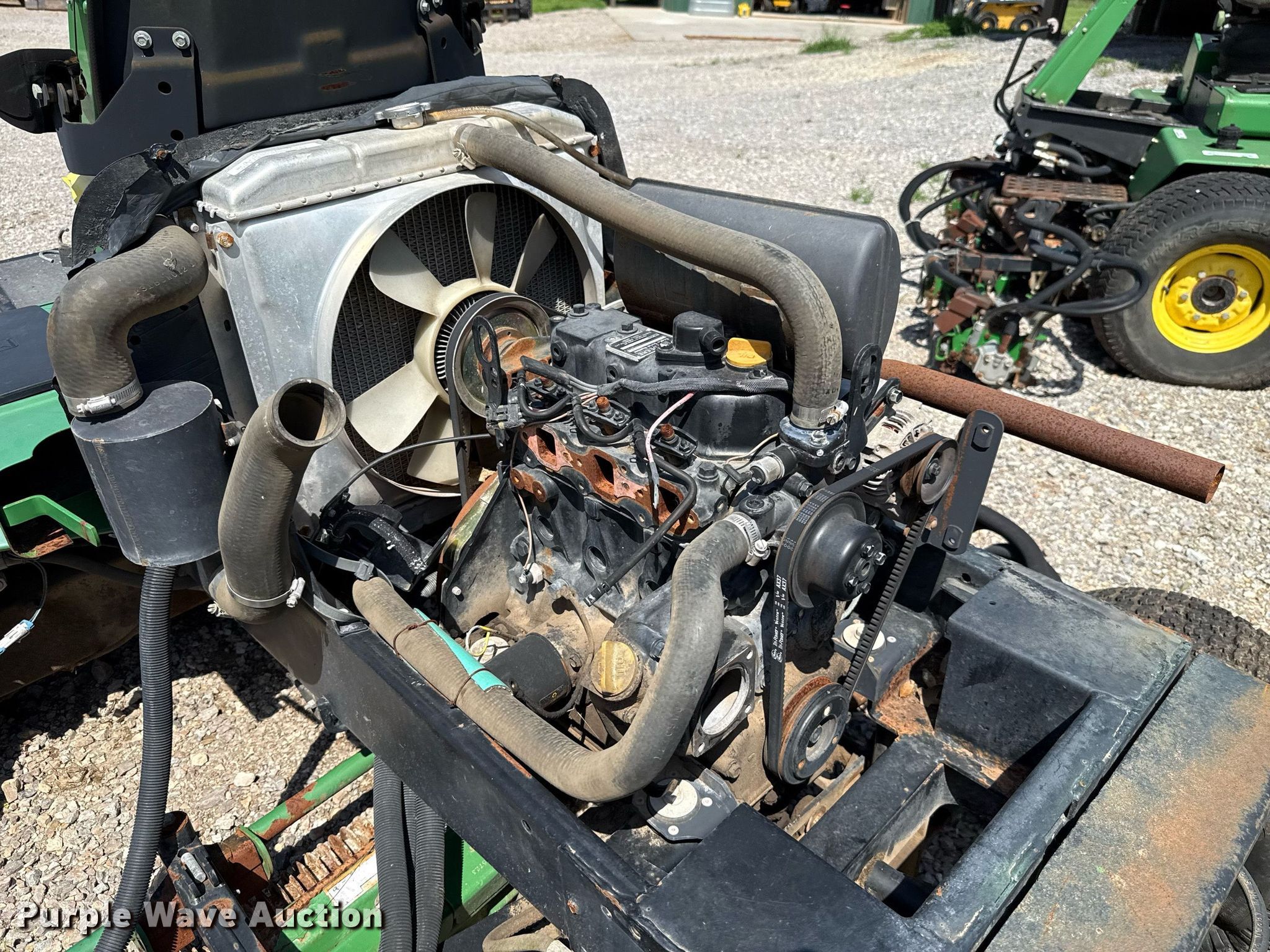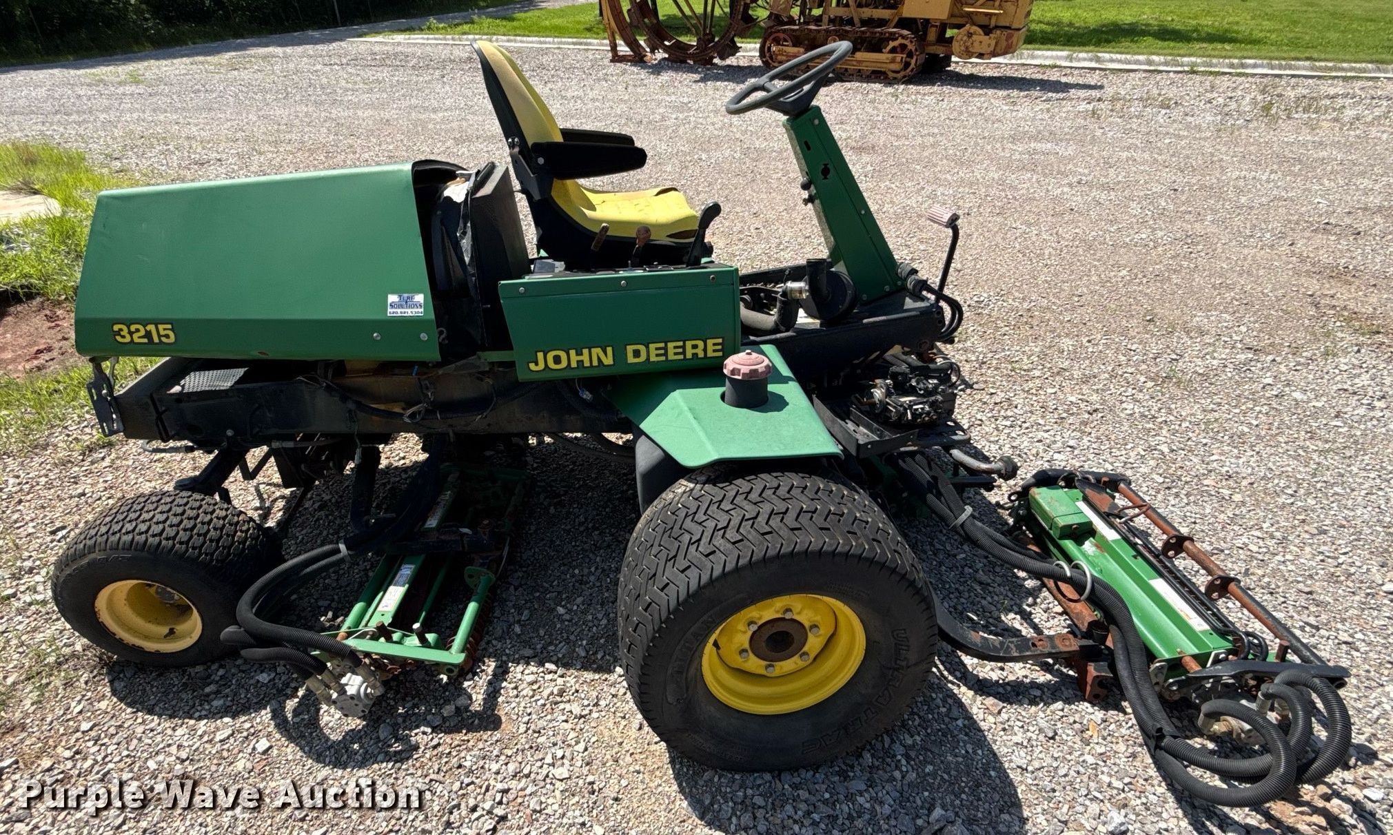 John Deere 3215A reel mower. Hours: 3,986 on meter, Cutting width: 96", Serial: M03215A030203. Engine John Deere 3TNE78A-JF, Serial: CH3044D002865, Cylinders: 3, Fuel type: Diesel. Transmission Hydrostatic. Features Hydraulic front deck lift. Tires Front: 26.5X14.00-12, Rear: 20X10.00-9. Notes Flat tires, Non-operational engine , Non-operational unit. Norman, OK 73026