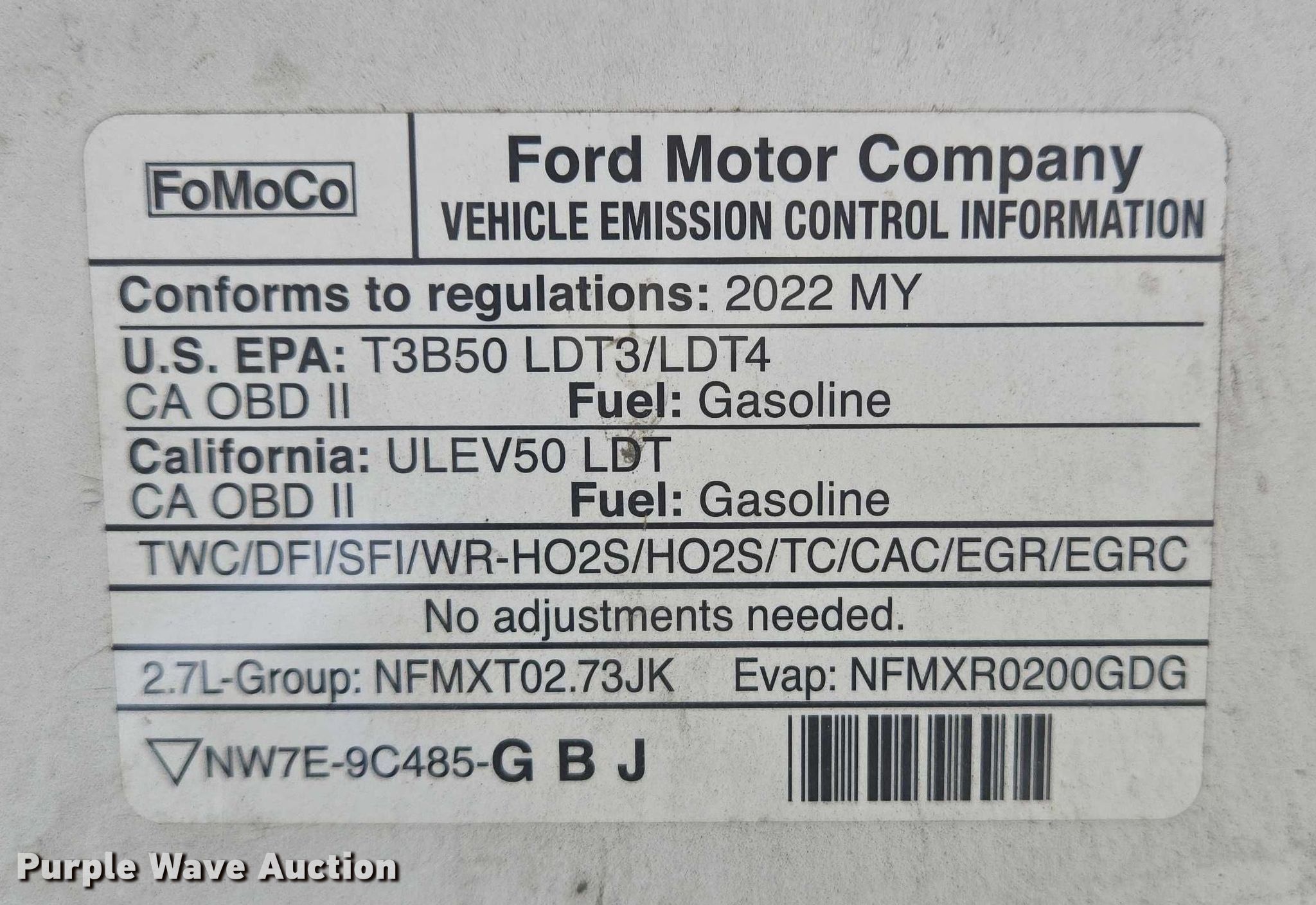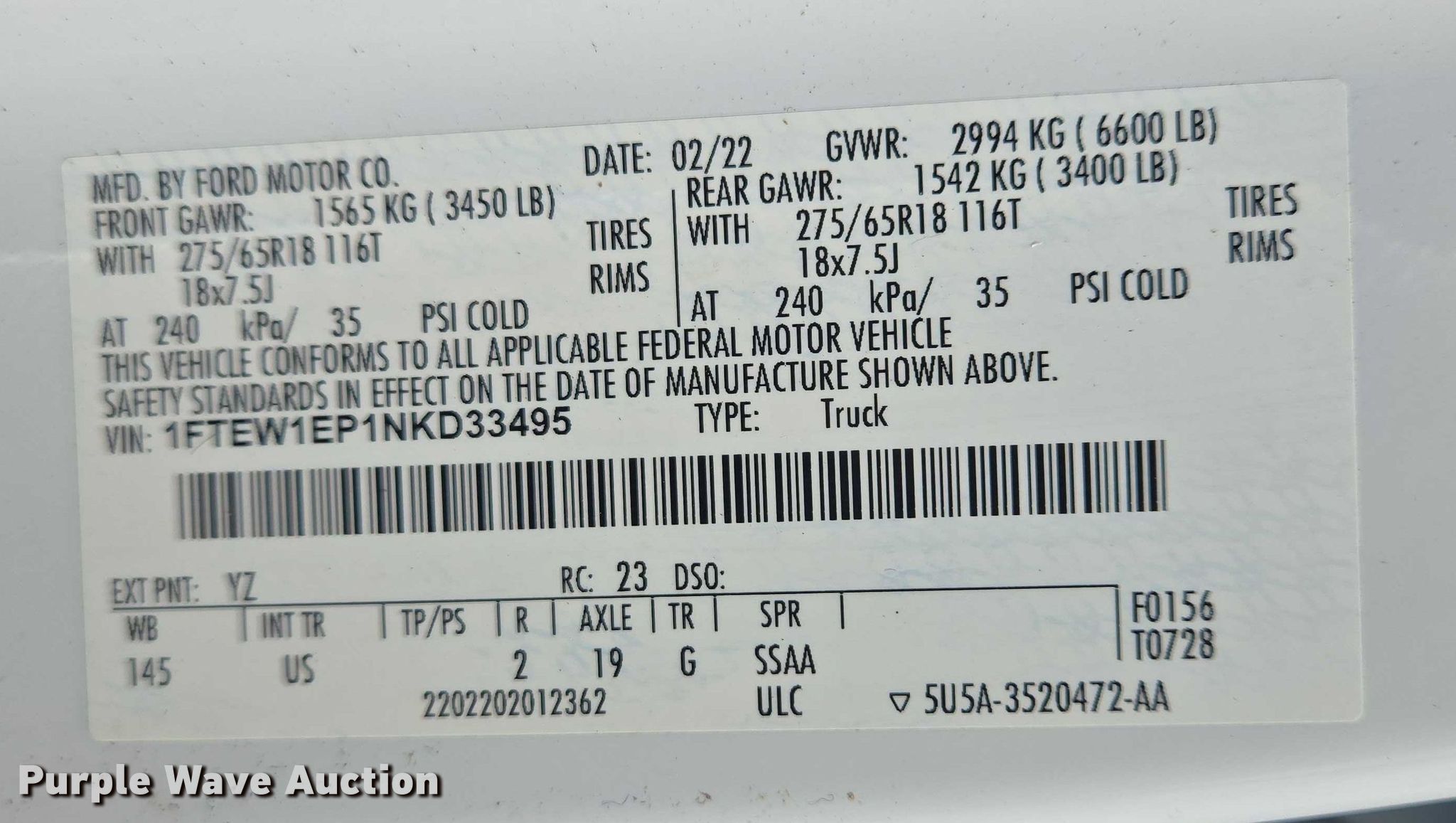 2022 Ford F150 XLT SuperCrew pickup truck. Miles: 78,448 on odometer, VIN: 1FTEW1EP1NKD33495. Engine Displacement: 2.7L V6 DOHC, Cylinders: 6, Fuel type: Gas. Transmission Automatic, Four wheel drive. Interior AC, Heat, Seat: Heated, Power driver, Power passenger, Power windows, Power locks, Cruise control, Backup camera. Tires Size: 275/65R18. Notes In cab camera not included, Dash warning indicator: low fuel, Non-operational power driver seat. Tennessee title. Title has a lien that will be released following the close of the auction. Title distribution may be delayed up to 45 days from verification of funds. Milan, TN 38358
