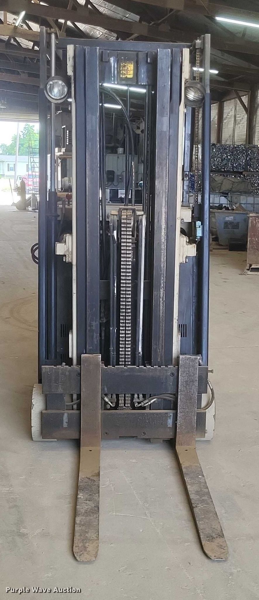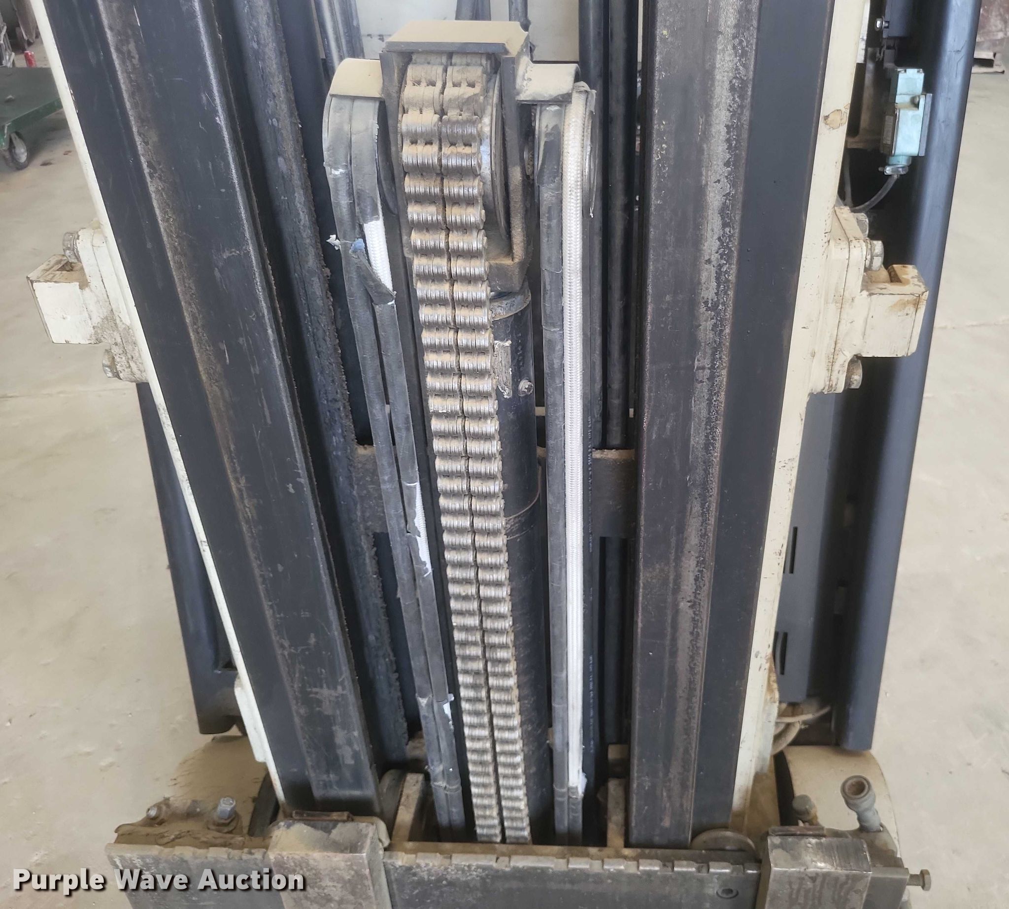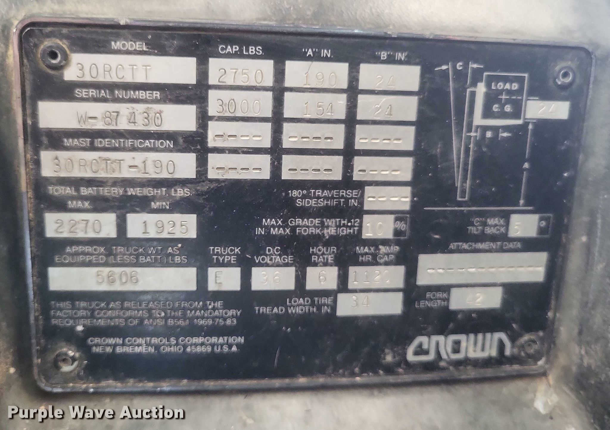 Crown 30RCTT order picker. Hours: 9,501 on meter, Serial: W-87430, Unit #: 10. Electric Motor Volts: 36. Transmission Hydrostatic. Operators station Canopy. Features Maximum lift capacity: 3,000 lbs, Maximum lift height: 190", Mast stages: 2, Mast tilt, Fork length: 42". Tires Solid. Notes Non-operational mast tilt. Tenn-Scrap. Alamo, TN 38001