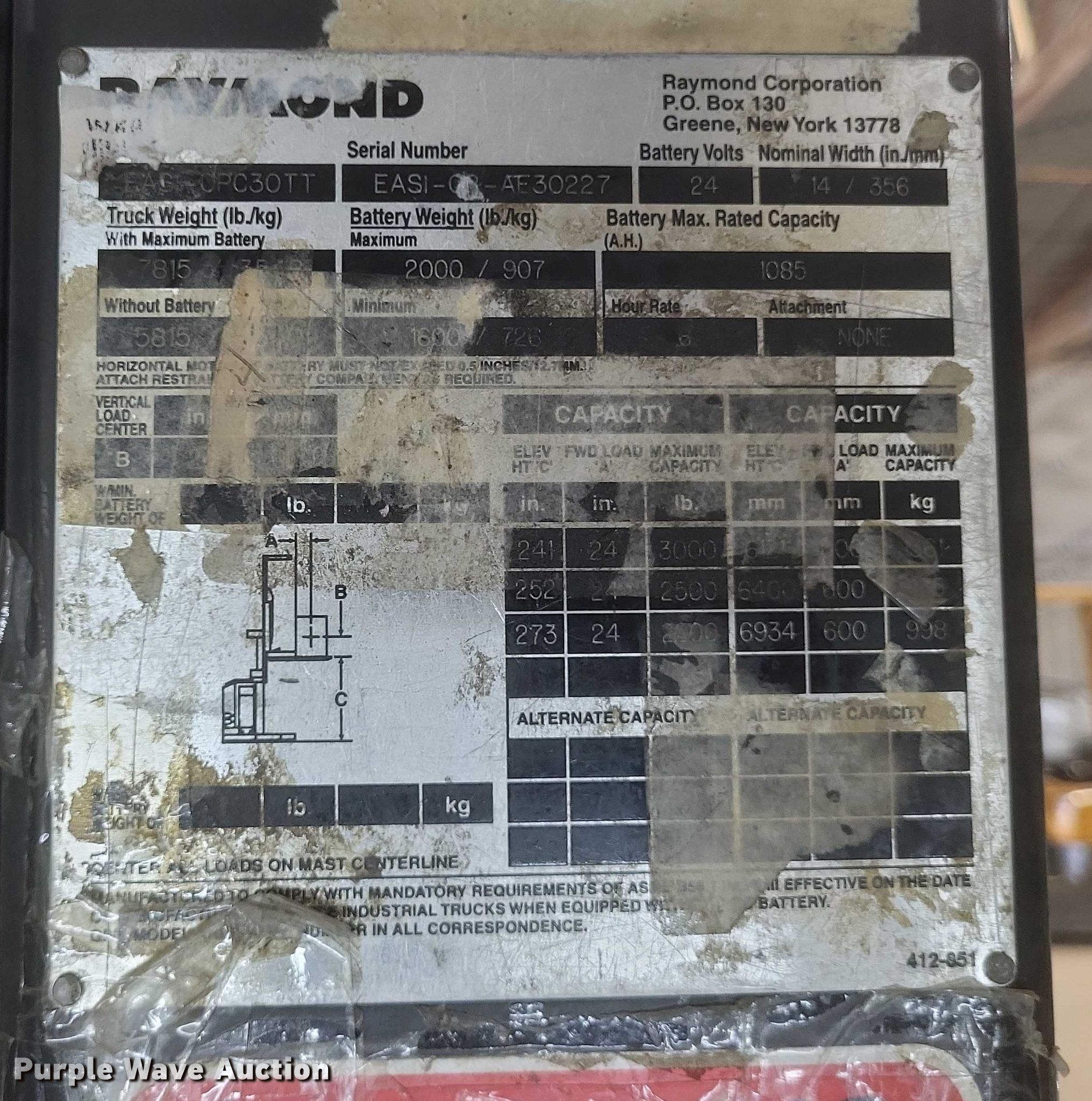 Take a look at this used Raymond EASI-OPC30TT order picker being sold on July 2nd, 2025 in the SOLD! July 02 Vehicles and Equipment Auction made by Raymond. Take a look at all of the item information below or take a look at similar auctions for Warehouse Forklift.