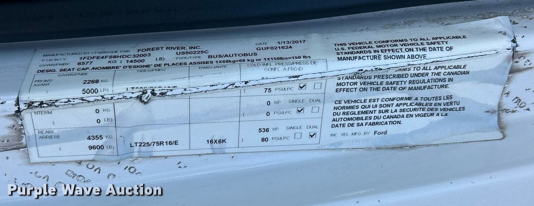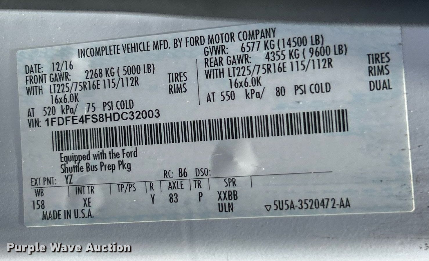 2017 Ford E450 Super Duty shuttle bus. Miles: 141,822 on odometer, VIN: 1FDFE4FS8HDC32003. Engine Displacement: 6.8L, Cylinders: 10, Fuel type: Gas. Transmission Automatic. Chassis Axles: Single, Suspension: Spring, Brakes: Hydraulic, GVWR: 14,500 lbs. Interior AC, Heat, Passengers: 25. Tires Size: 225/75R16. Notes Dash warning indicator: Check engine. Missouri title. Seller is a Missouri licensed motor vehicle dealer. Title will be assigned and distributed by the dealer. Please contact the seller for distribution questions. Title distribution may be delayed up to 30 days from verification of funds. Fruendly Auto Source Inc.. Moscow Mills, MO 63362