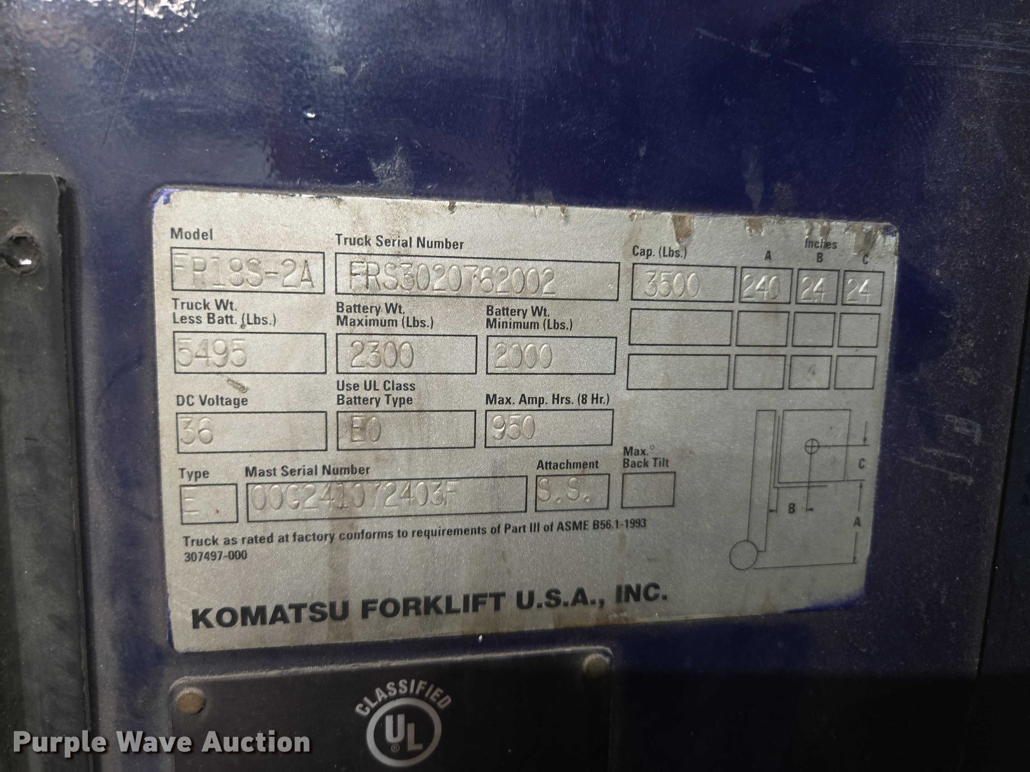 Purple Wave is selling a used Warehouse Forklift in Missouri. This item is a Komatsu FR18S-2A reach truck with the following: Serial: FRS3020762002