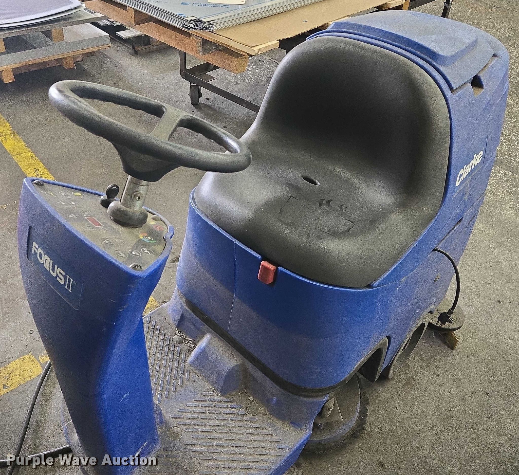Clark Focus II floor scrubber. Hours: Unknown, Serial: 3510164605911. Electric Motor Volts: 120. Transmission Hydrostatic. Features Width: 36". Notes Vacuum pump issues, broken, Unknown operating condition. Standard Sheet Metal. Kansas City, MO 64120
