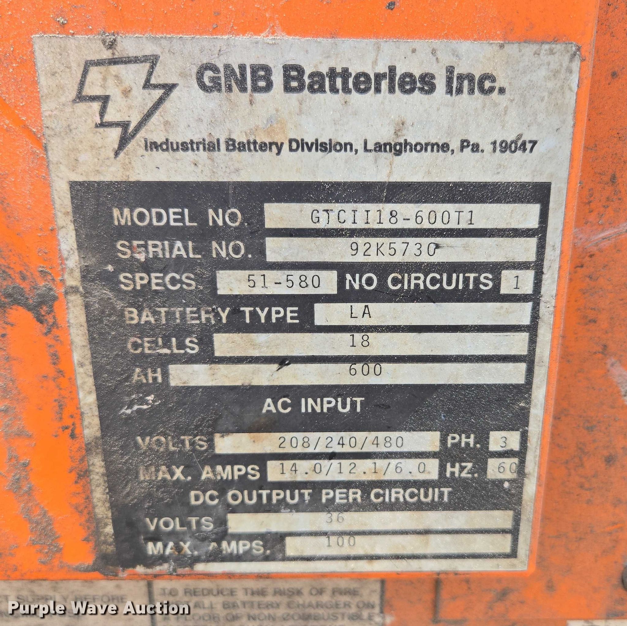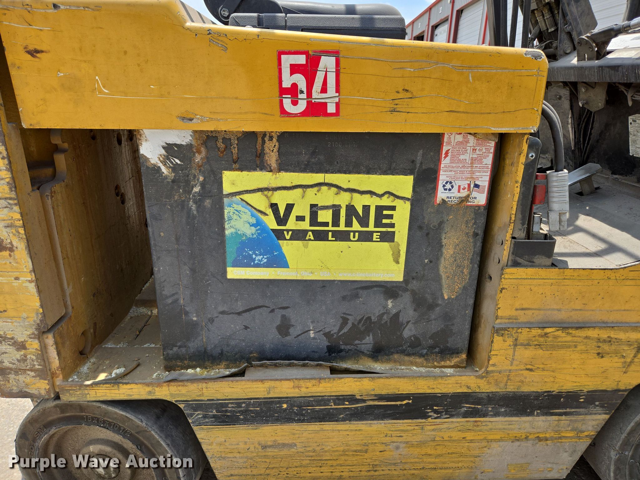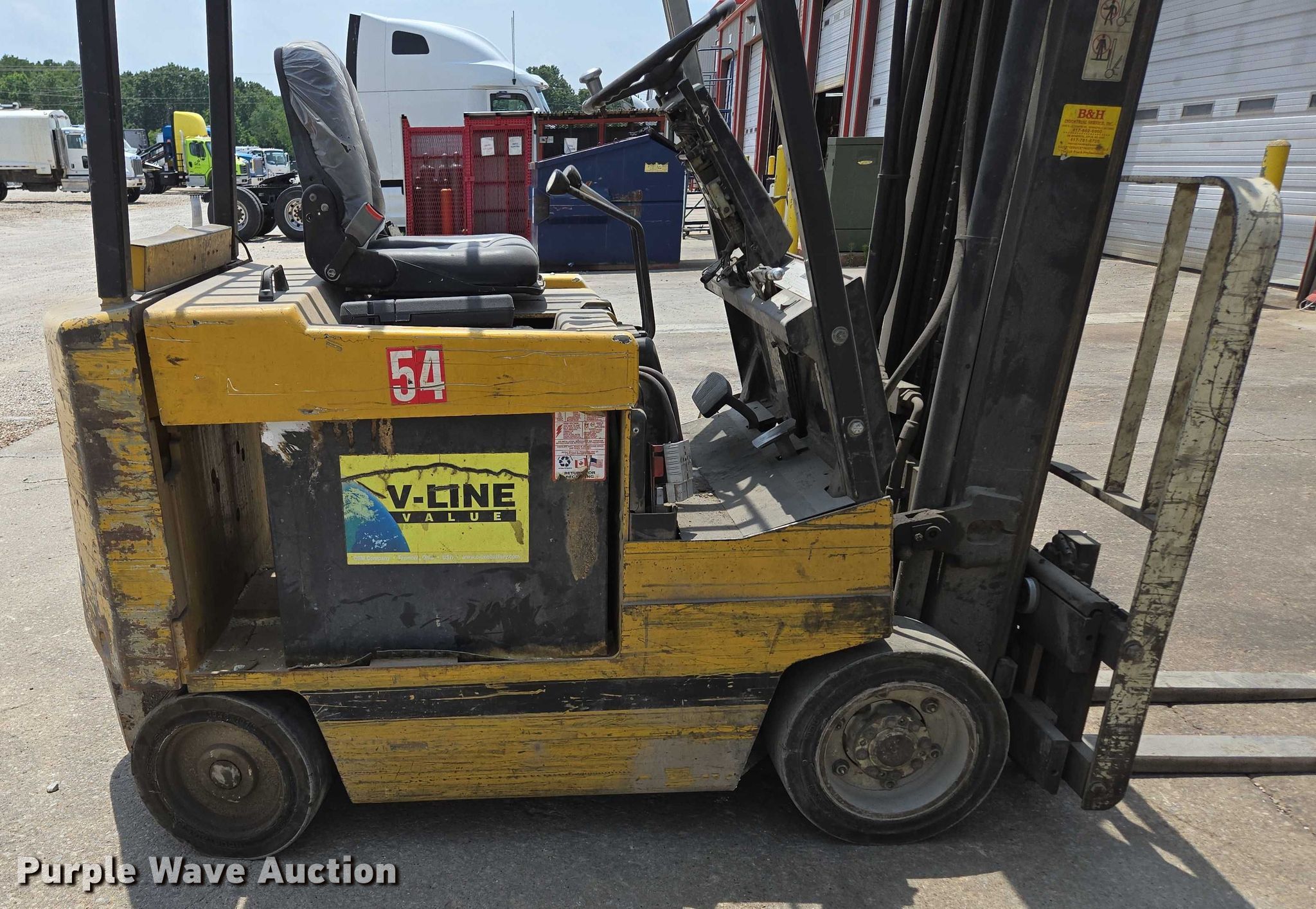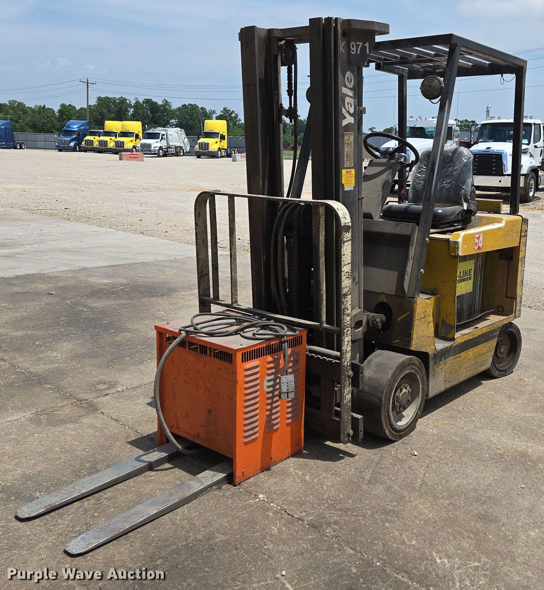 Yale ERC050ZAN48SE083 forklift. Hours: Unknown, Serial: K550674, Unit #: 54. Electric Motor Volts: 48, Charger: Three phase. Transmission Powershift. Operators station Canopy. Features Maximum lift capacity: 5,000 lbs, Collapsed mast height: 82", Mast stages: 3, Side shift, Mast tilt, Fork length: 48", GNB Ferrocharger charger Phase: 3, Volts: 208/240/480. Tires Front: 18x8x121/8, Rear: 16x6x101/2, Solid. Notes Non-operational hour meter, Non-operational GNB Ferrocharger charger, Dead battery, Unknown operating condition. Truck Component Services/Larson Group. Strafford, MO 65757