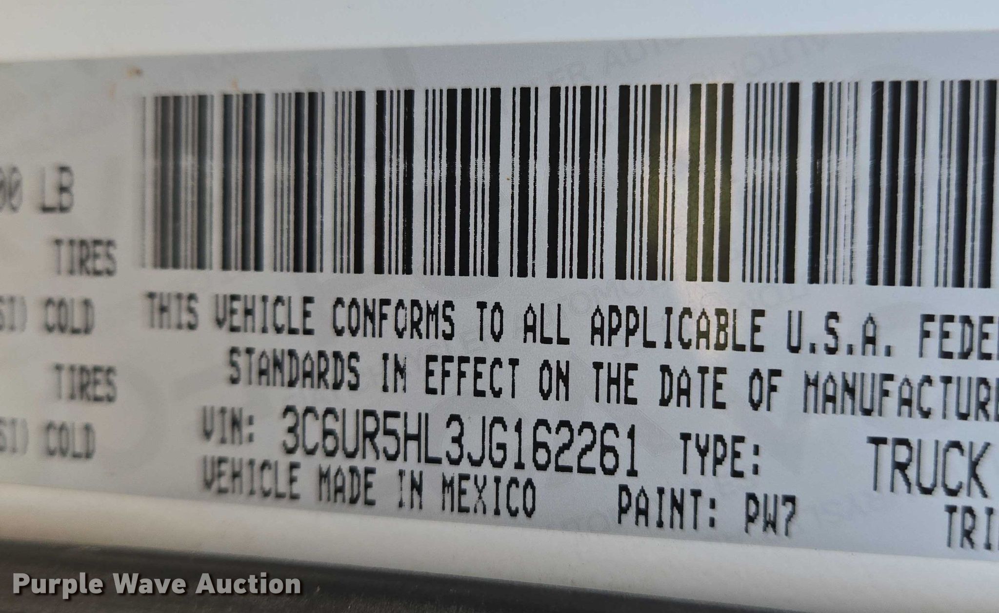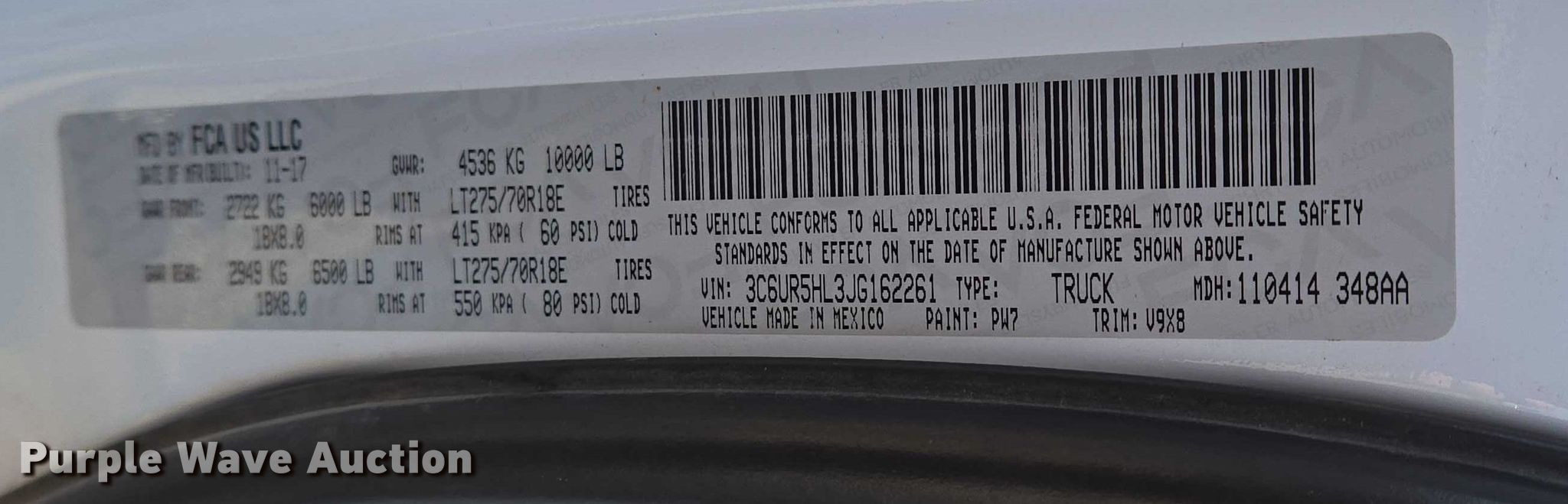Purple Wave is selling a used 3/4 or 1 Ton Pickup or Van in Kansas. This item is a 2018 Dodge Ram 2500 Crew Cab flatbed pickup truck with the following: Miles: 96,679 on odometer, VIN: 3C6UR5HL3JG162261