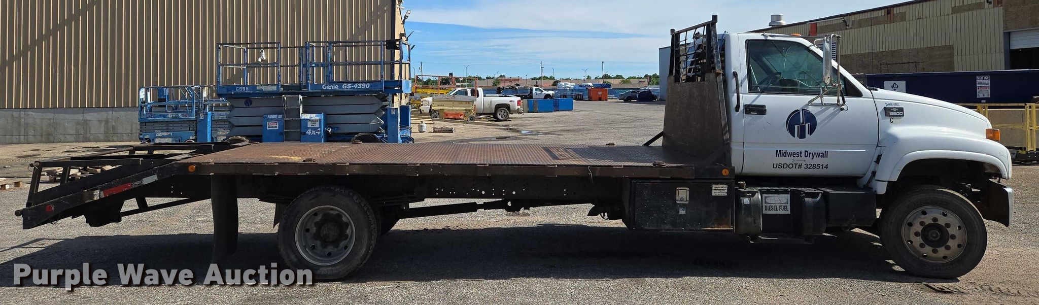 2000 Chevrolet C6500 flatbed truck. VIN: 1GBJ6H1C5YJ11983, Miles: 270,744 on odometer, Hours: 7,653 on meter. Engine Caterpillar 3126, Cylinders: 6, Fuel type: Diesel. Transmission Manual, Speed: 6. Chassis Axles: Single, Suspension: Spring. Interior AC, Heat, Cruise control. Features Flatbed 16' L x 96" W, Tail length: 4', Ramps: Manual Length: 54". Tires Size: 245/70R19.5. Kansas title. Title distribution may be delayed up to 30 days from verification of funds. Midwest Drywall Company. Wichita, KS 67209