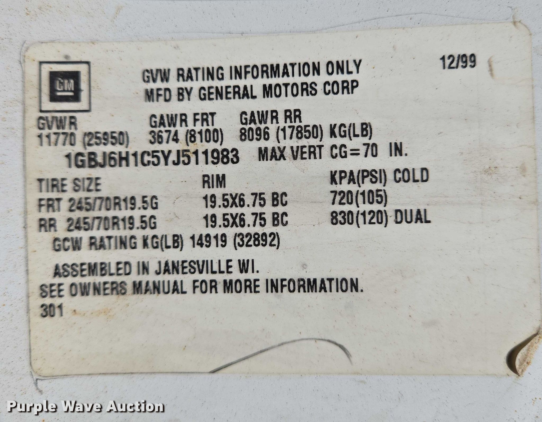 Purple Wave is selling a used Flat Bed Truck in Kansas. This item is a 2000 Chevrolet C6500 flatbed truck with the following: VIN: 1GBJ6H1C5YJ11983, Miles: 270,744 on odometer, Hours: 7,653 on meter