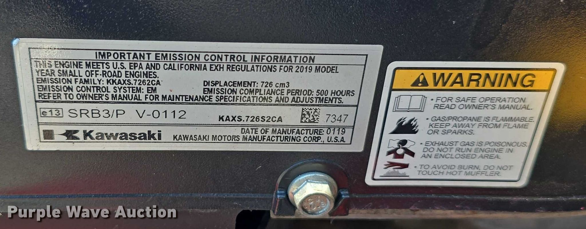 Toro GrandStand ZTR lawn mower. Hours: 1,588 on meter, Cutting width: 48", Serial: 313001017. Engine Kawasaki FS691V, Serial: FS691VA67135, Displacement: 726 cc, Cylinders: 2, Fuel type: Gas. Transmission Hydrostatic. Features Stand on. Tires Front: 11X4.00-5/3.25, Rear: 20X10.50-8. Jordan Machinery/ S & N Auto Sales. Waterloo, NE 68069