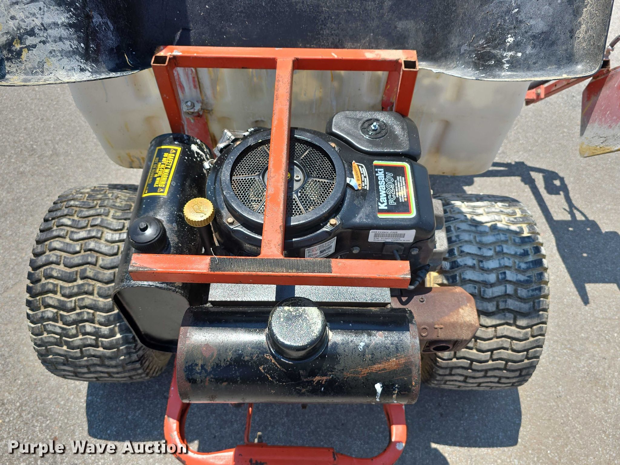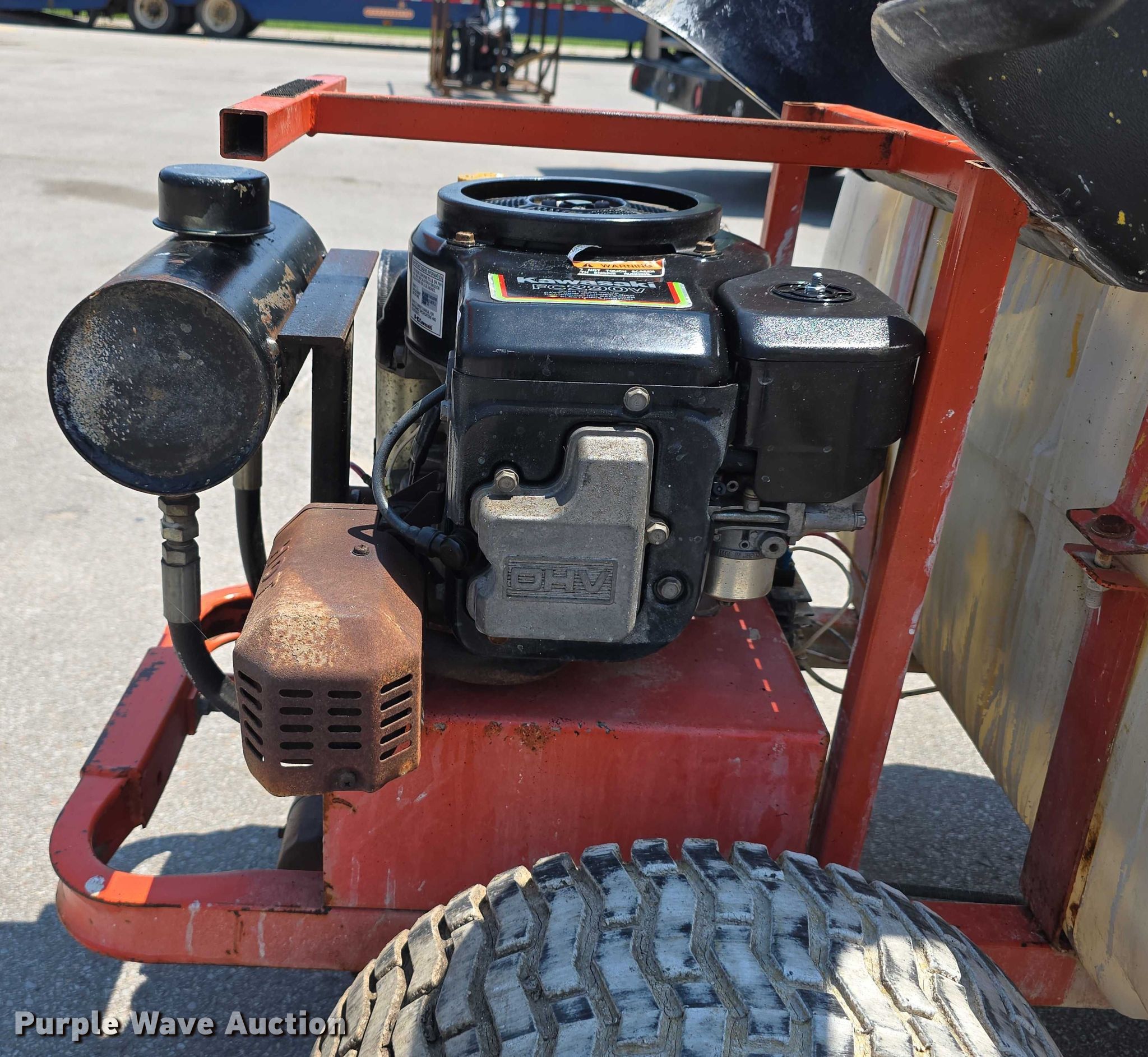 Smithco 40-650 paint striper. Serial: LN538. Engine Kawaskai FC290V, Serial: FC290VA21823, Displacement: 287 cc, Cylinders: 1, Fuel type: Gas. Transmission Hydrostatic. Features Tank capacity: 50 gallons, Nozzles: 2. Tires Front: 13X6.50-6, Rear: 18X9.50-8. Jordan Machinery/ S & N Auto Sales. Waterloo, NE 68069