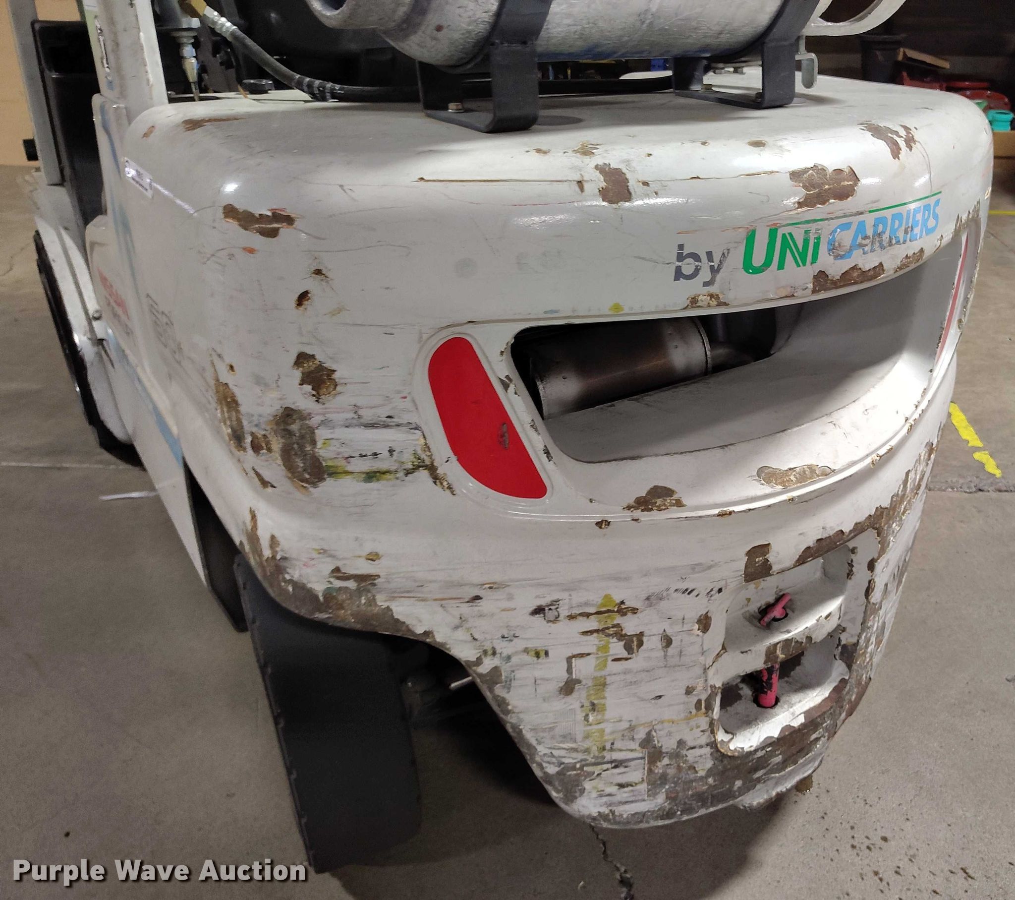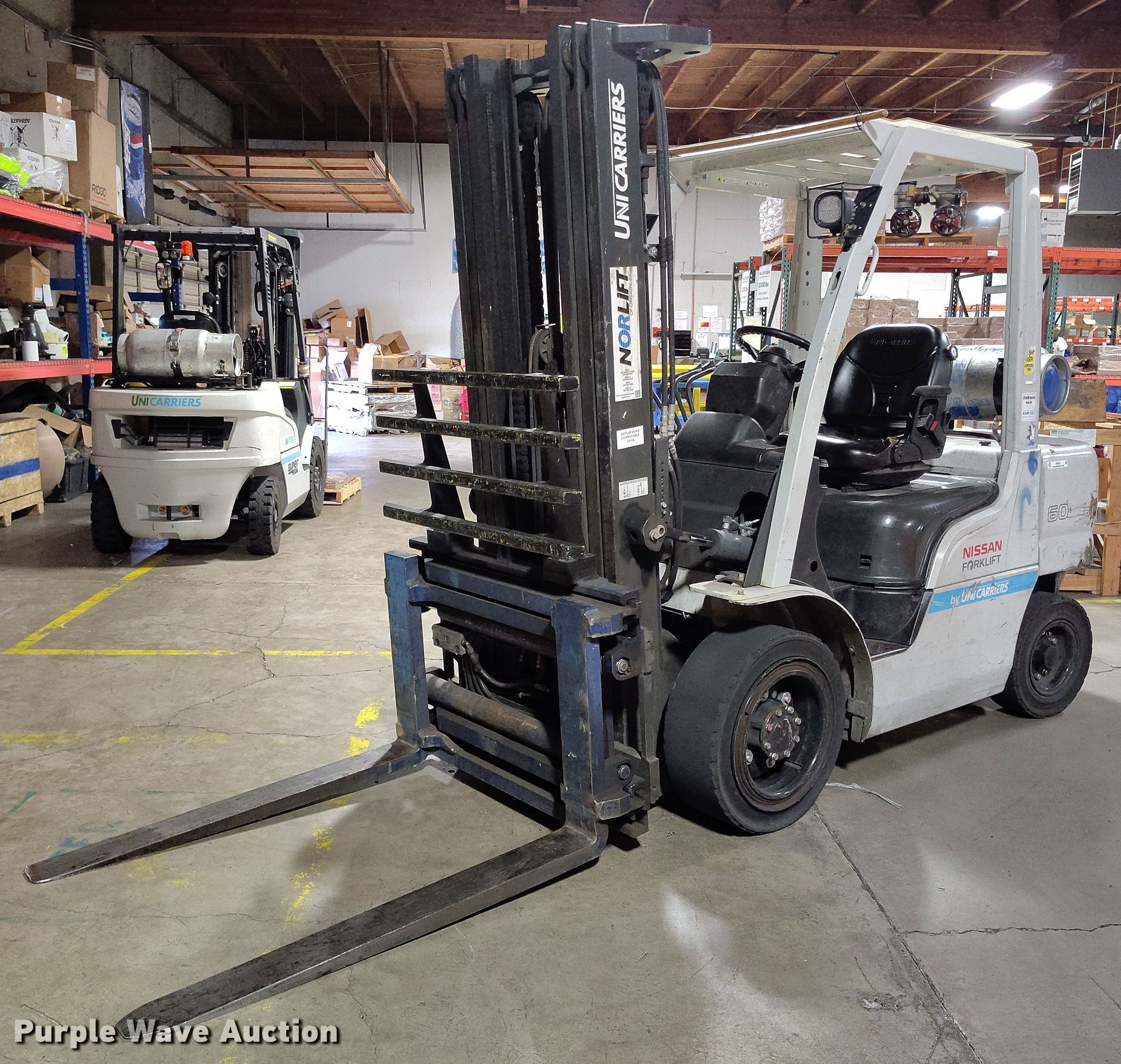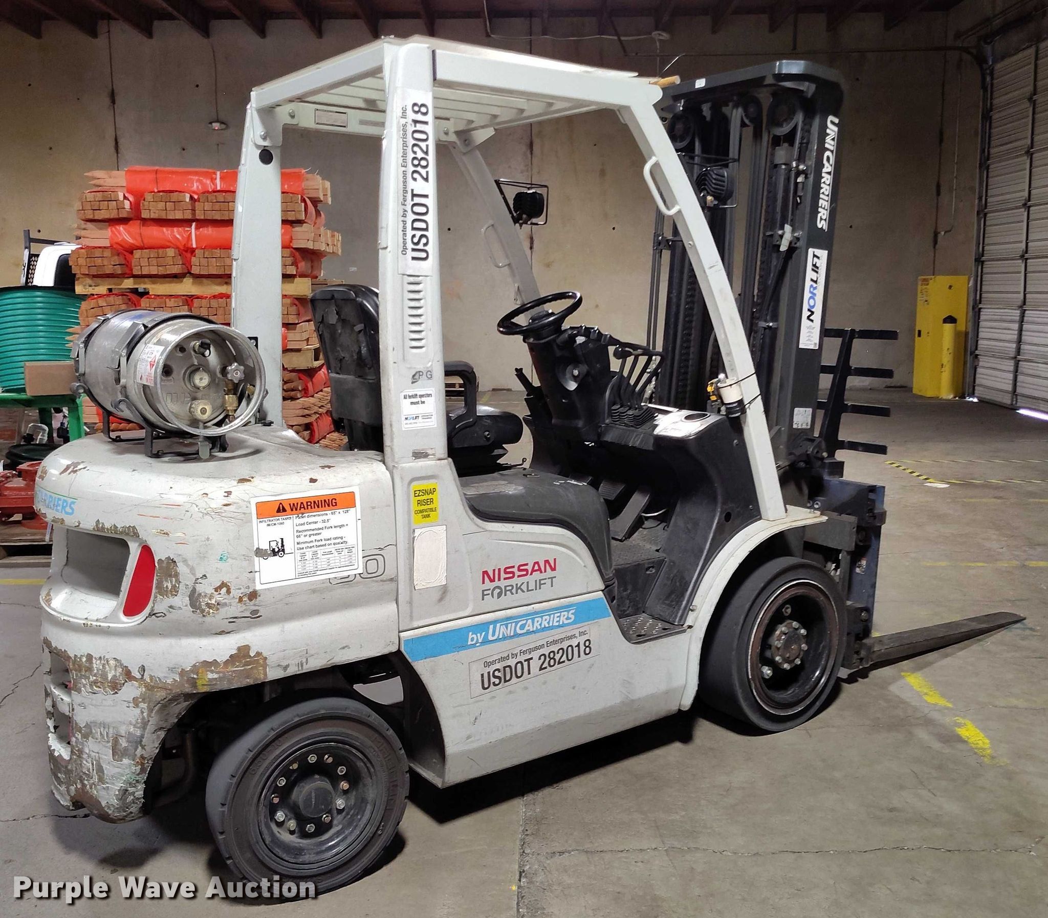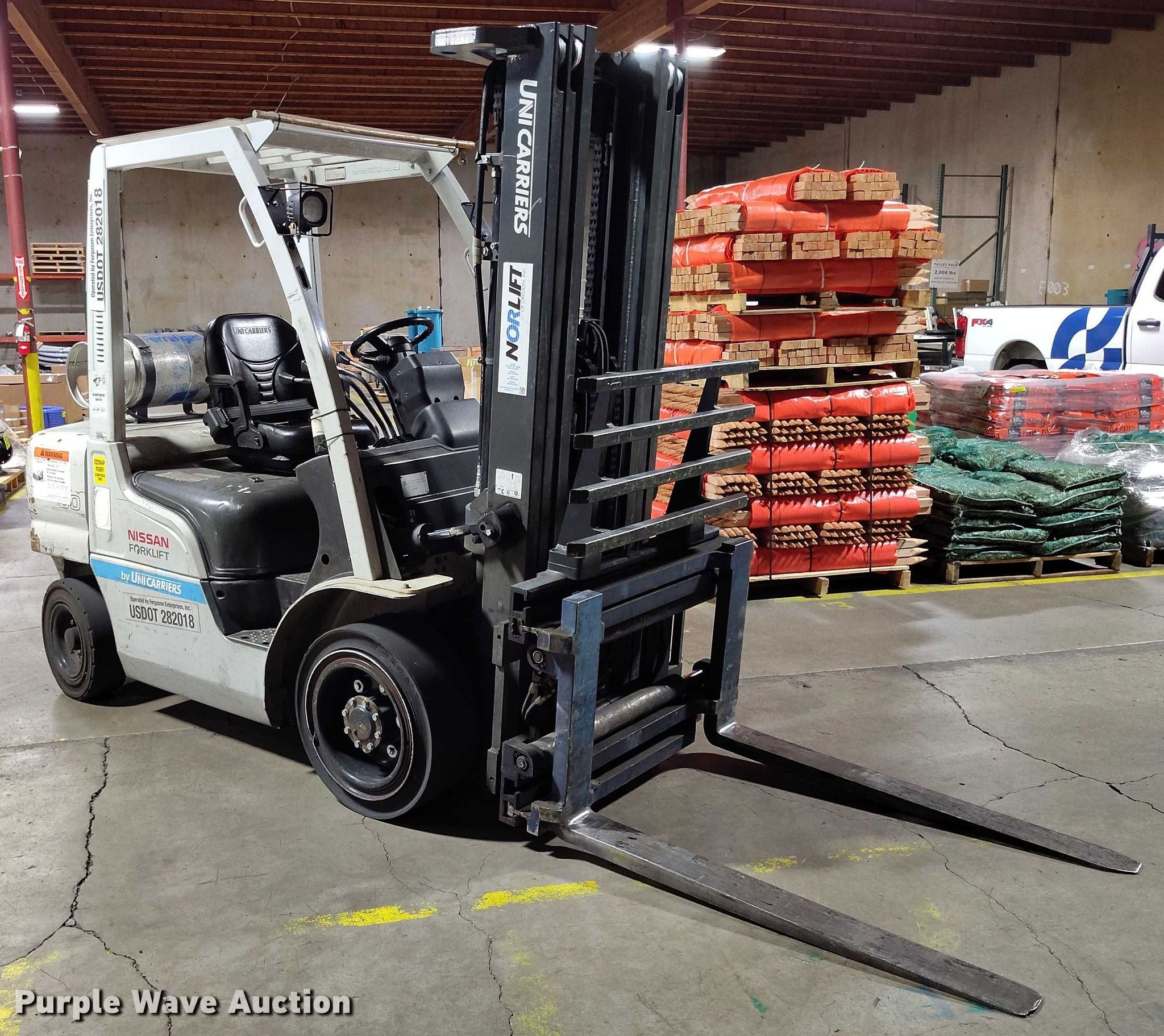 Purple Wave is selling a used Cushion Tire or Pneumatic Forklift in Oregon. This item is a 2015 Nissan PF60 forklift with the following: Hours: 4,480 on meter, Miles or hours may vary, unit still in use, Serial: UG1F2-9L4321