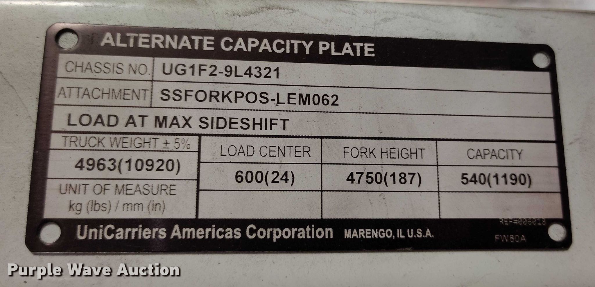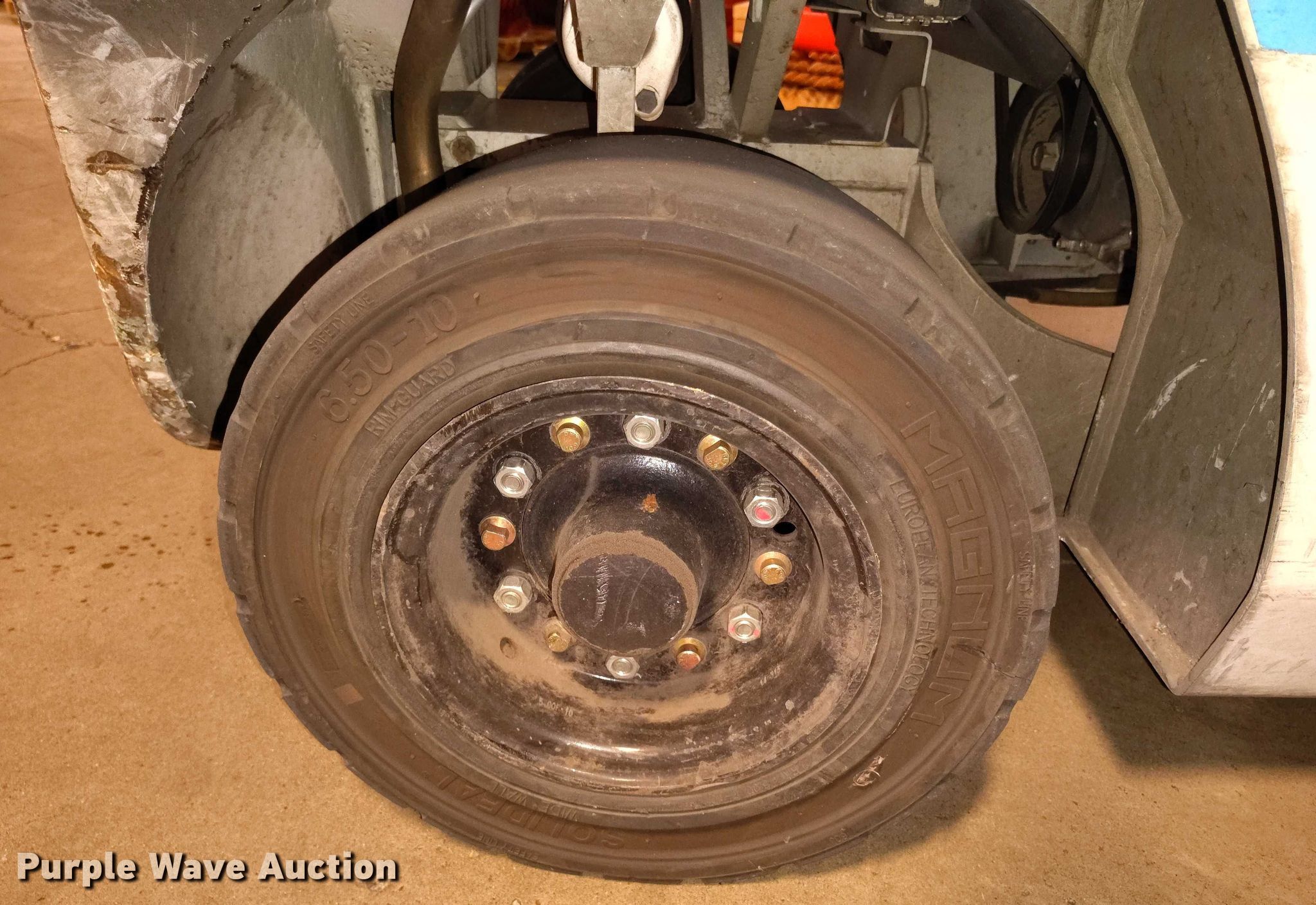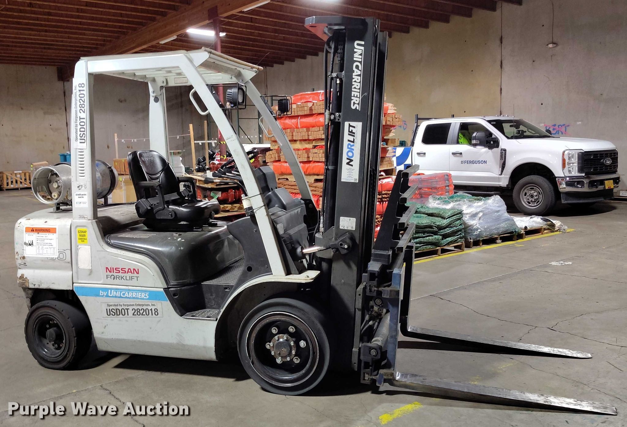 2015 Nissan PF60 forklift. Hours: 4,480 on meter, Miles or hours may vary, unit still in use, Serial: UG1F2-9L4321. Engine GCT, Displacement: 2.5L, Cylinders: 4, Fuel type: LPG LP bottle: Not included. Transmission Automatic. Operators station OROPS, Canopy. Features Maximum lift capacity: 4,770 lbs, Maximum lift height: 187", Mast stages: 3, Side shift, Mast tilt, Fork positioner, Fork length: 48". Tires Front: 28x9-15, Rear: 6.50-10, Solid. Ferguson. Eugene, OR 97402