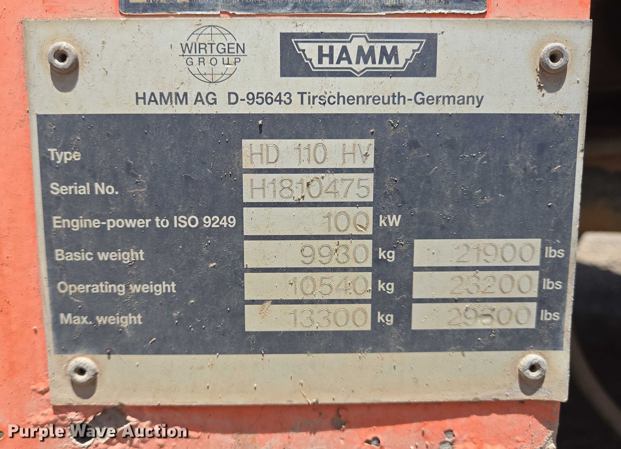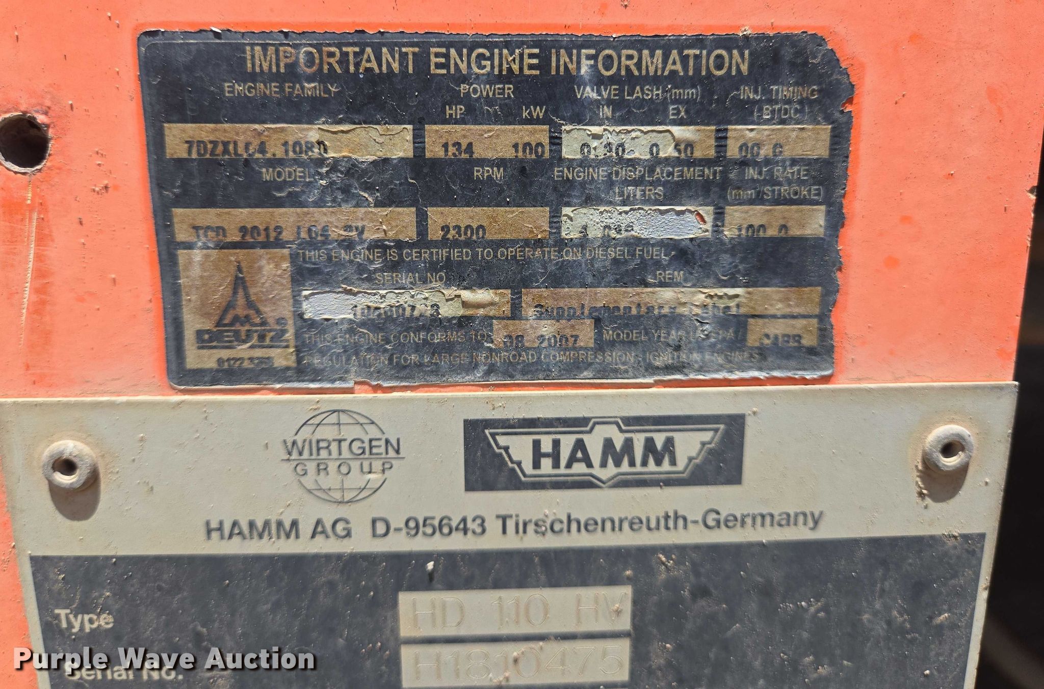 2009 Hamm HD 110 HV double drum vibratory roller. Hours: 808 on meter, Serial: H1810475. Engine Deutz TCD 2012 L04, Cylinders: 6, Fuel type: Diesel. Transmission Hydrostatic. Features Drum: Smooth, Vibratory system: Double, Independent drum controls, Front drum Width: 66", Diameter: 48", Rear drum Width: 66", Diameter: 48", Drum scrapers: Front, Rear, Water spray applicator: Front, Rear. Notes Dead battery. TLC Plumbing. Albuquerque, NM 87107