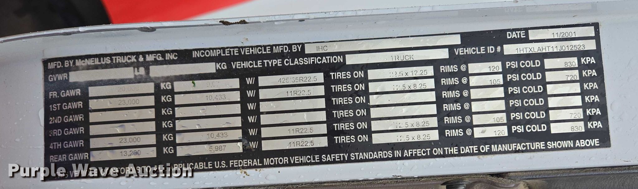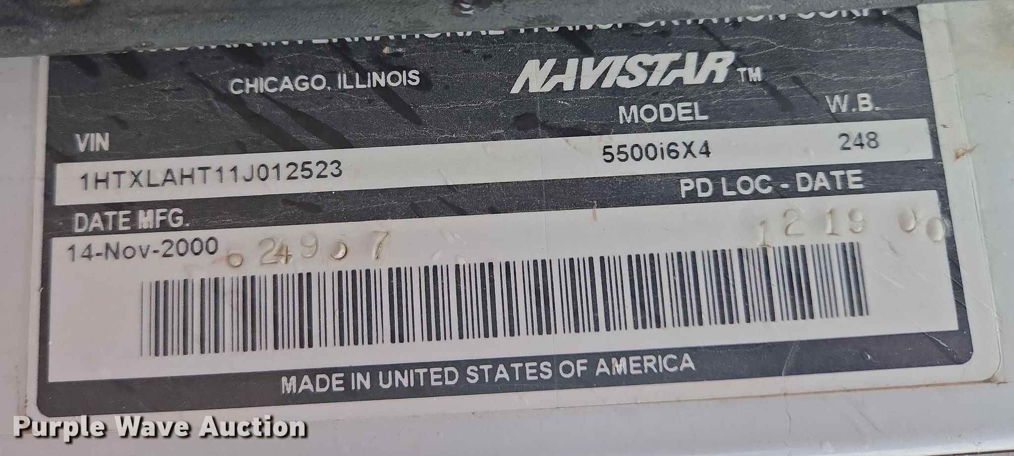 2001 International 5500i ready mix truck. Miles: 227,400 on odometer, VIN: 1HTXLAHT11J012523, Unit #: 36. Engine Cummins ISM, Displacement: 10.8L, Cylinders: 6, Fuel type: Diesel. Transmission Eaton Fuller, Manual, Speed: 11. Chassis Axles: Triple, Tag axle Steerable, Differential lock: Inter-axle, Suspension: Spring over walking beam, Brakes: Air, PTO, FAWR: 20,000 lbs, IAWR: 23,000 lbs, RAWR: 23,000 lbs, Lift axle GAWR: 13,200 lbs. Interior AC, Heat, Heated mirrors, Cruise control. Features Mixer McNeilus, Capacity: 11 cu.yd., Discharge: Rear, In-cab controls, Rear drum controls, Water tank capacity: 150 gallons, Chute Extensions: 3, Chute type: Steel.. Tires Front: 425/65R22.5, Rear: 11/R22.5, Lift axle: 11/R22.5. View repairs. Minnesota title. Title distribution may be delayed up to 14 days from verification of funds. Buffalo Ridge Concrete. Slayton, MN 56172