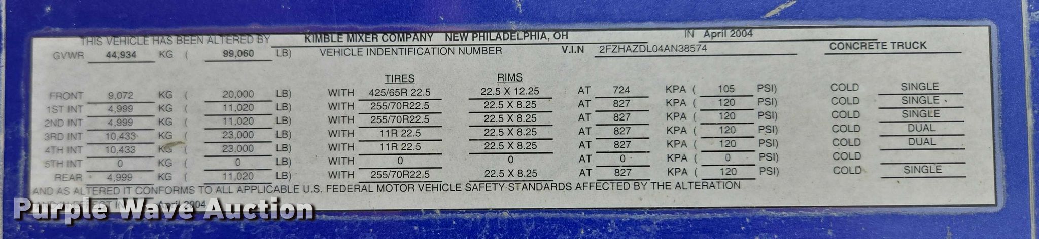 2004 Sterling LT9500 ready mix truck. Miles: 252,391 on odometer, Hours: 11,807 on meter, VIN: 2FZHAZDL04AN38574, Unit #: 6. Engine Caterpillar C11, Displacement: 11.1L, Cylinders: 6, Fuel type: Diesel, Engine brake. Transmission Eaton Fuller Road Ranger RTO-9, Manual, Speed: 11. Chassis Axles: 5, Pusher axle Steerable, Tag axle Steerable, Differential lock: Inter-axle, Suspension: Spring over walking beam, Brakes: Air, PTO, GVWR: 99,060 lbs FAWR: 20,000 lbs, IAWR: 23,000 lbs, RAWR: 23,000 lbs, Lift axle GAWR: 11,020 lbs. Interior AC, Heat, Cruise control. Features Mixer Kimble Mixer Company K-2000, Capacity: 11 cu.yd., Discharge: Rear, In-cab controls, Rear drum controls, Water tank capacity: 135 gallons, Chute Extensions: 3, Chute type: Steel.. Tires Front: 425/65R22.5, Rear: 11R22.5, Lift axle: 255/70R22.5. Notes Pusher axles issues, will not lower. South Dakota title. Title distribution may be delayed up to 14 days from verification of funds. Buffalo Ridge Concrete. Watertown, SD 57201