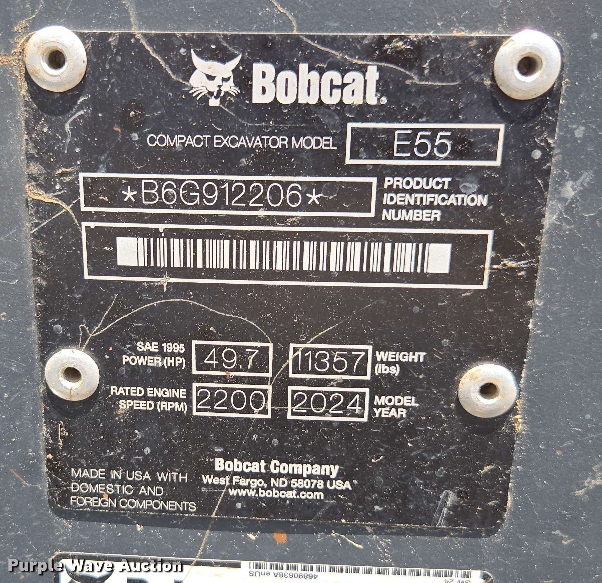Purple Wave is selling a used Mini Excavator in Kansas. This item is a 2024 Bobcat E55 mini excavator with the following: Hours: 245 on meter, Miles or hours may vary, unit still in use, Serial: B6G912206
