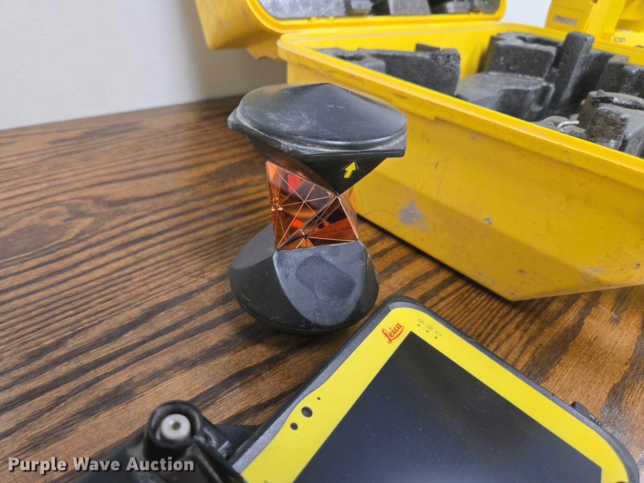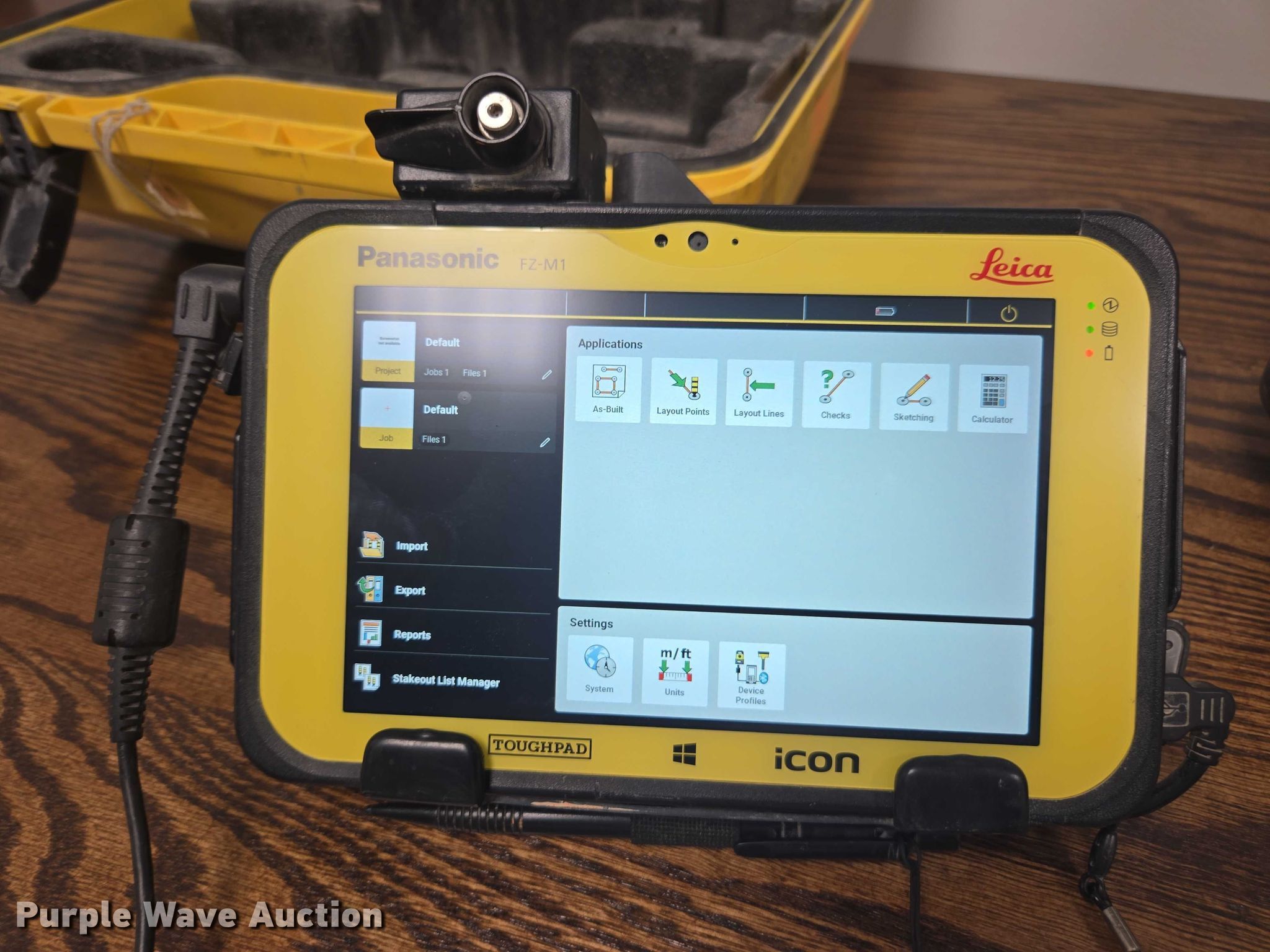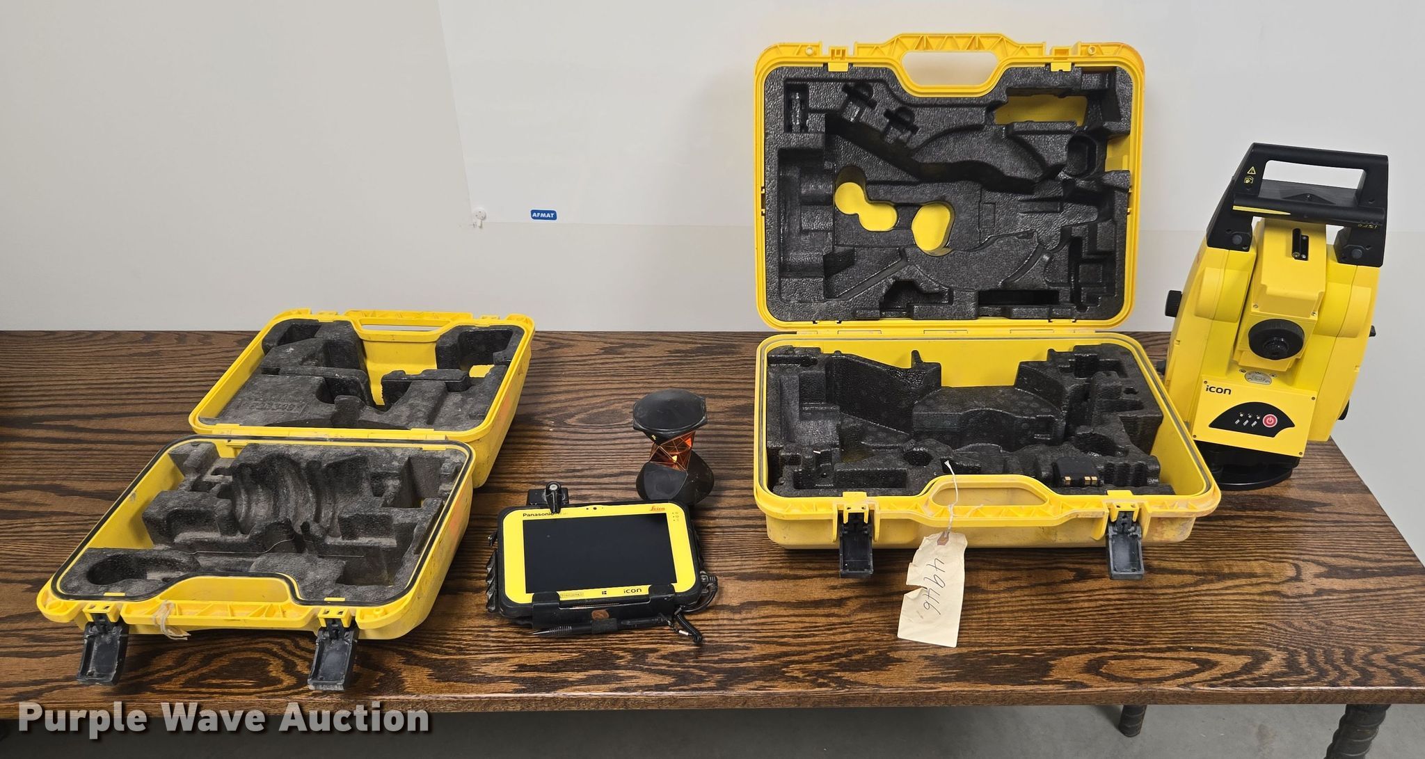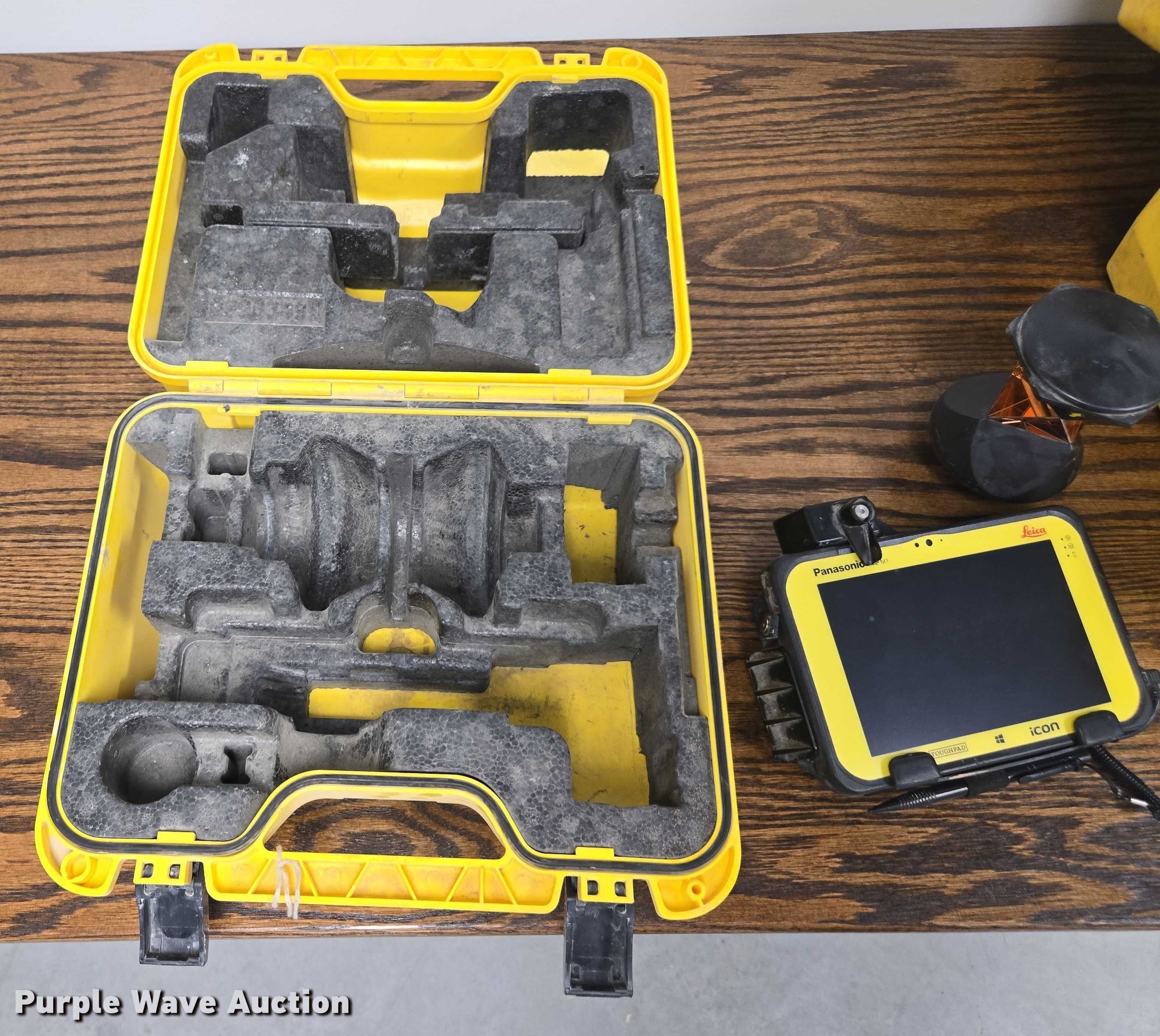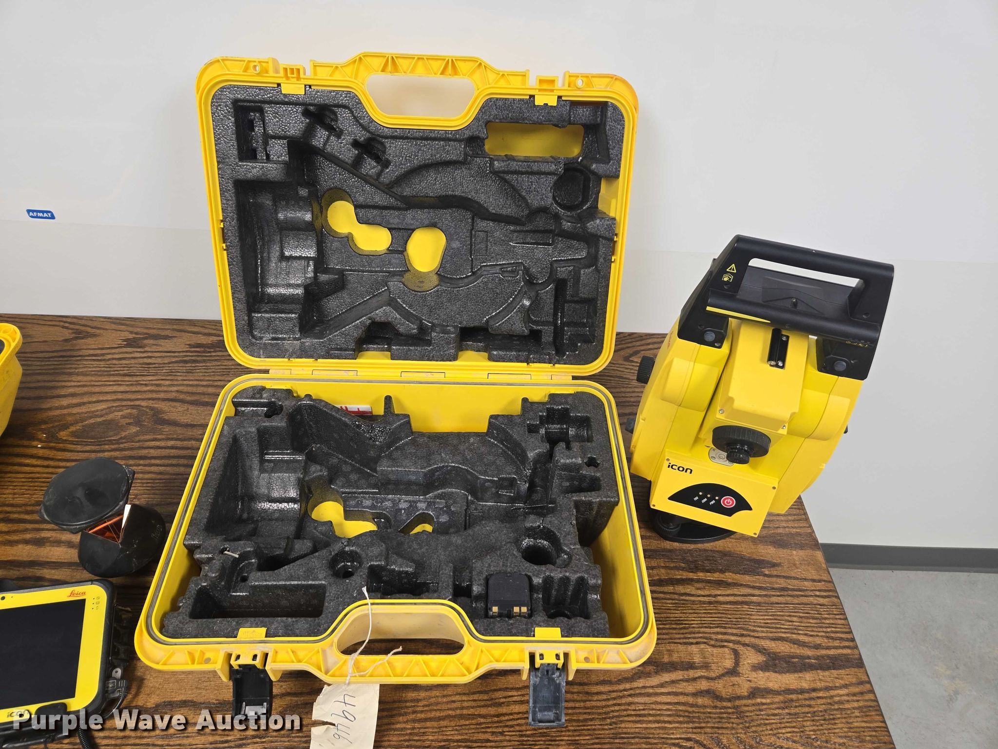 Purple Wave is selling a used Surveying Equip. in Kansas. This item is a Leica Total Station surveying equipment with the following: Leica iCON Robot 50, (2) batteries, Charger, Leica Panasonic FZ-M1, Prism and Prism stick, Tripod
