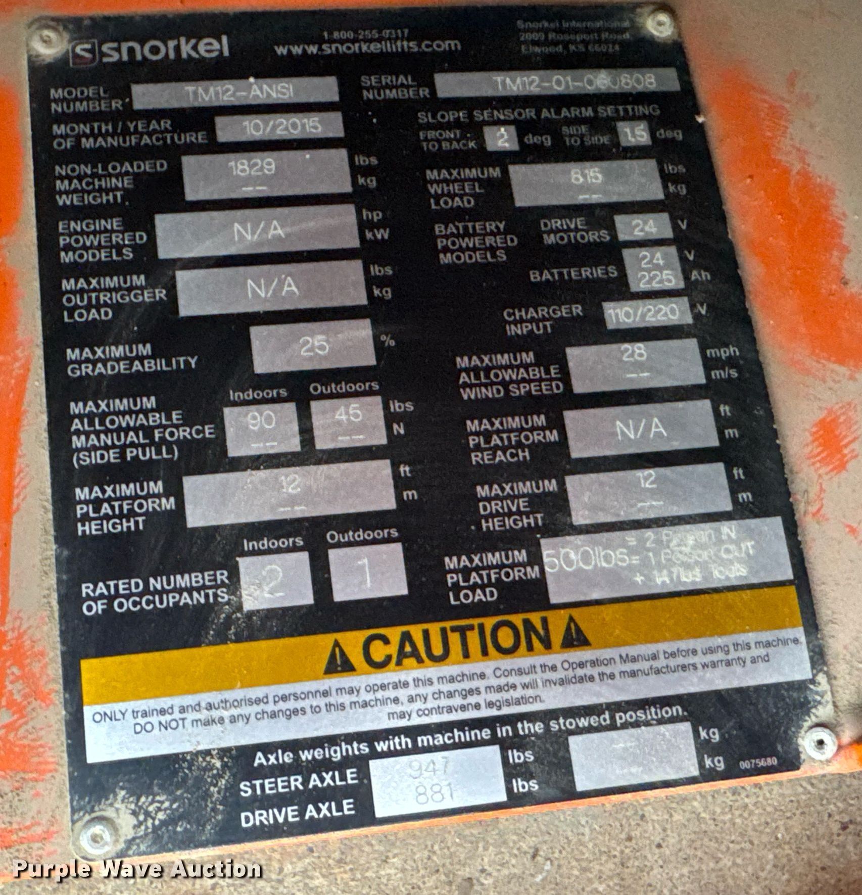 Purple Wave is selling a used Scissor or Vertical Lift in Oklahoma. This item is a 2015 Snorkel TM12 vertical lift with the following: Serial: TM12-01-060808