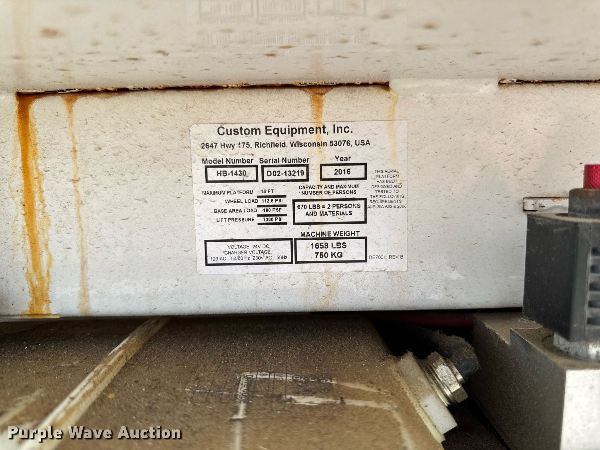 2016 HY-BRID 1430 scissor lift. Hours: 201 on meter, Serial: D02-13219. Electric Motor Volts: 24. Features Maximum lift capacity: 670 lbs, Maximum lift height: 14', Platform: 64" L x 25" W, AC power outlet, Controls: Platform, Ground, Platform extensions: Manual. Tires Solid. Tri-City Electric Co. of Iowa. Davenport, IA 52806