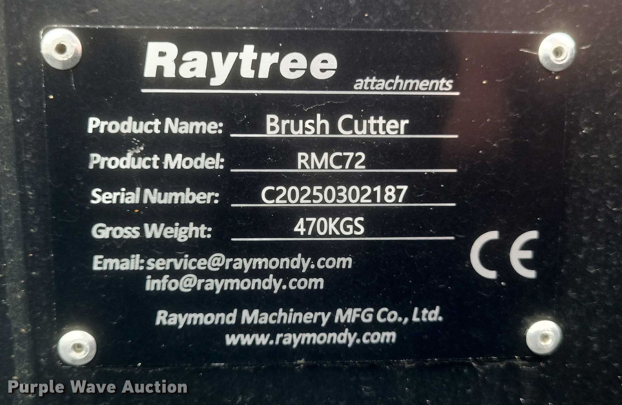 Purple Wave is selling a used Skid Steer Attach. in Missouri. This item is a Raytree RMC72 skid steer brush mower with the following: Serial: C20250302187, Width: 72"