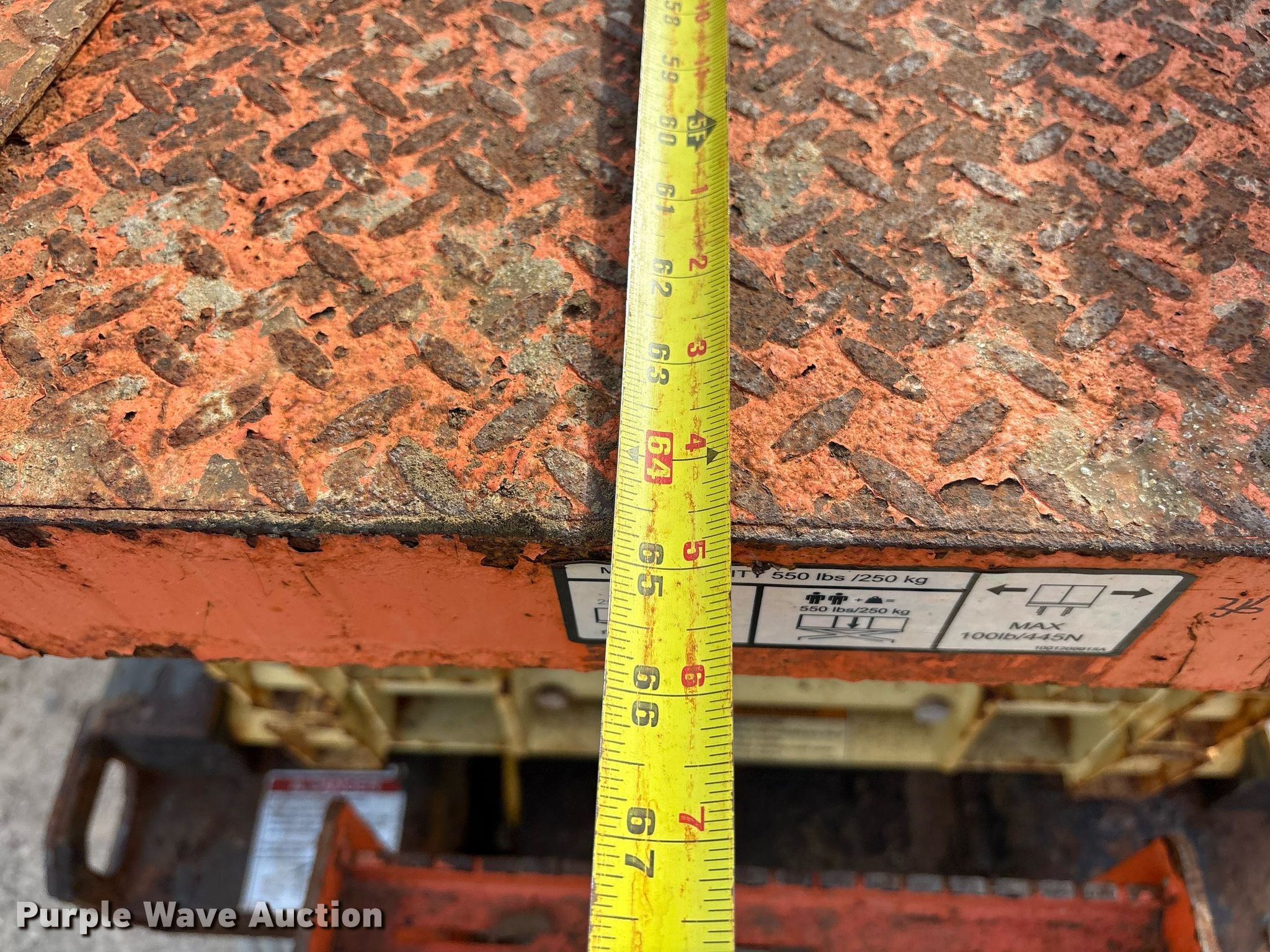 2017 JLG 1932R scissor lift. Hours: 119 on meter, Serial: M200011564. Electric Motor Volts: 24. Features Maximum lift capacity: 550 lbs, Maximum lift height: 19', Platform: 67" L x 26" W, AC power outlet, Controls: Remote Control, Ground, Platform extensions: Manual. Tires Tire size: 323x100, Solid. Texas Star Equipment. Alba, TX 75410