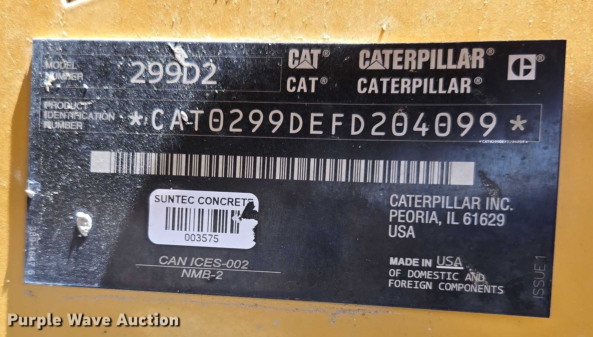 2018 Caterpillar 299D2 tracked skid steer loader. Hours: 6,234 on meter, Serial: CAT0299DEFD204099. Engine Caterpillar C3.8, Displacement: 3.8L, Cylinders: 4, Fuel type: Diesel. Transmission Hydrostatic, Two speed travel. Operators station Enclosed cab, AC, Heat, Backup camera, Bucket control: Hand, Electronic Monitoring System panel. Features Auxiliary hydraulics, Auxiliary electrical outlet, Quick coupler: Hydraulic, Counter weights, Bucket Caterpillar, Width: 80", Low profile, Cutting edge: Bolt-on. Tracks Brand: Caterpillar, Width: 17.5". Suntec Concrete. Phoenix, AZ 85085