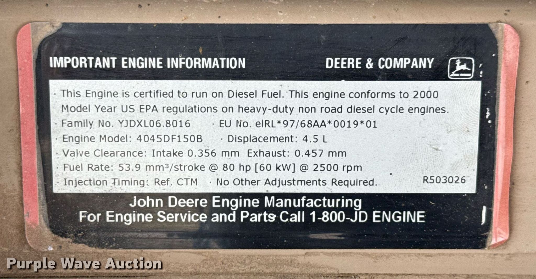 2001 Ingersoll-Rand P185WJD air compressor. Hours: 3,457 on meter, Serial: 315172UHK221, Unit #: 4-300-00. Engine John Deere 4045, Displacement: 4.5L, Cylinders: 4, Fuel type: Diesel, HP: 80, kW: 60. Features Air compressor Skid mounted. Notes Dead battery, Engine issues, turns over but will not start , Non-operational unit. Jay Reese Contractors, Inc. Dripping Springs, TX 78620