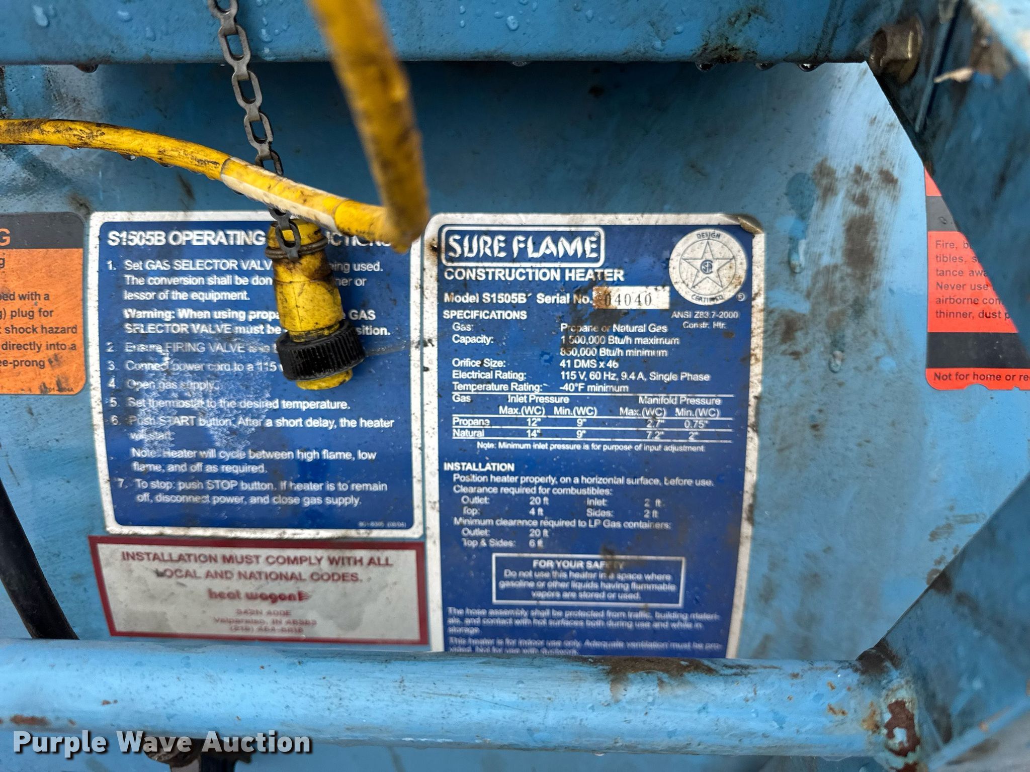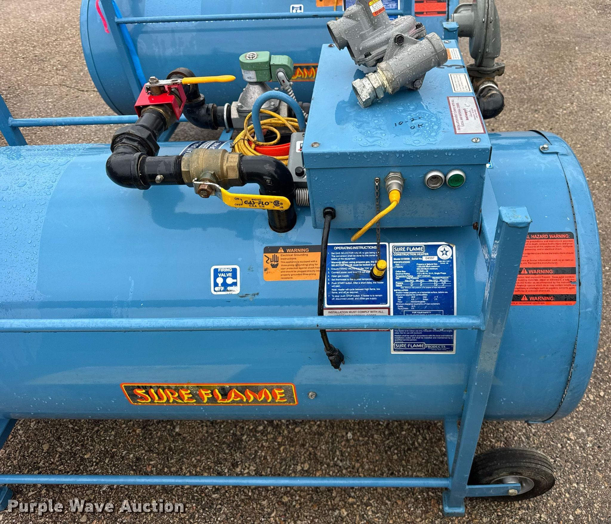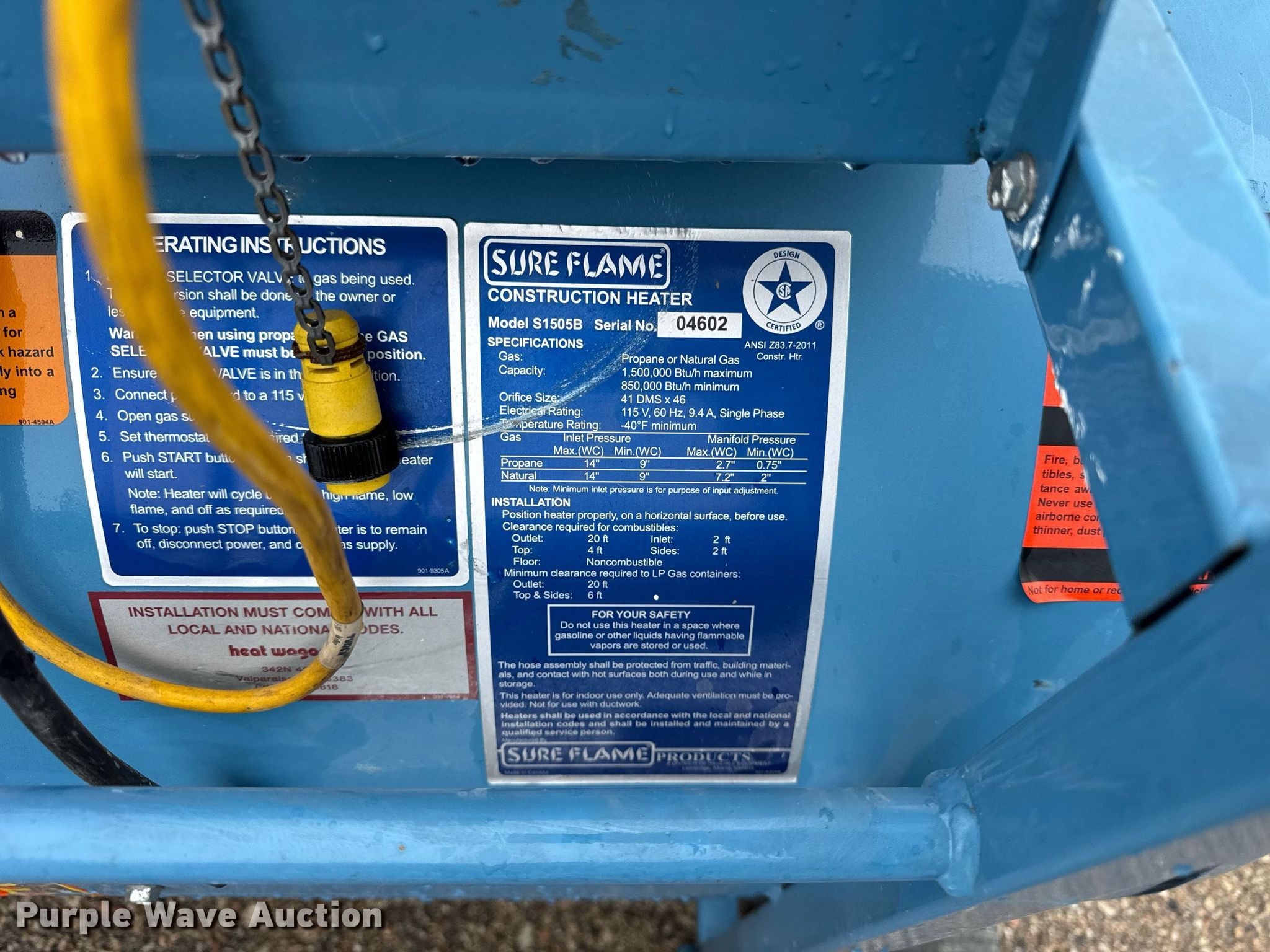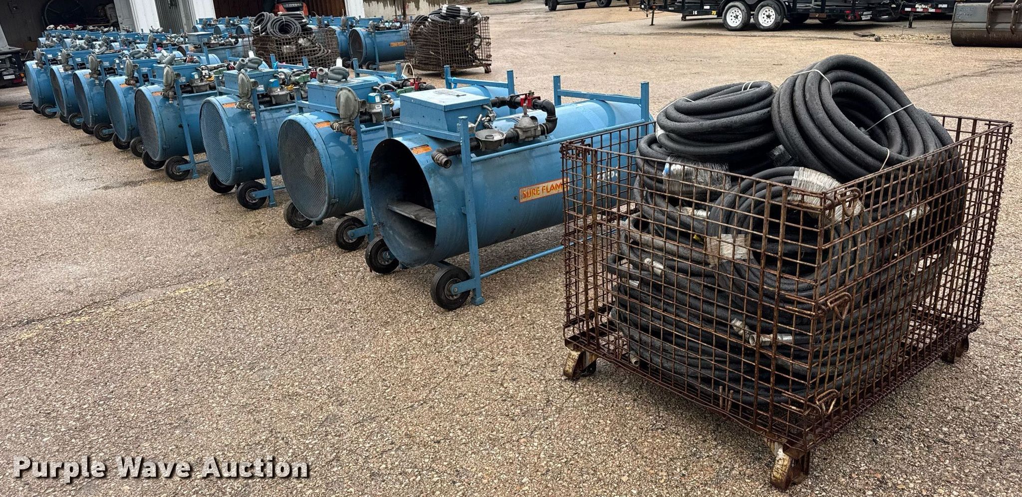 Purple Wave is selling a used Portable Heater or Fan in Illinois. This item is a (8) Sure Flame S1505B heaters with the following: BTU: 1,500,000 BTU, Fuel types:, CNG, LPG, Additional regulators, Fuel hose length: 1,000', (2) hoses, Lengths:, 300', Diameter: 3/4", 700', Diameter" 1",, (2) electric junction boxes, (2) electric cords
