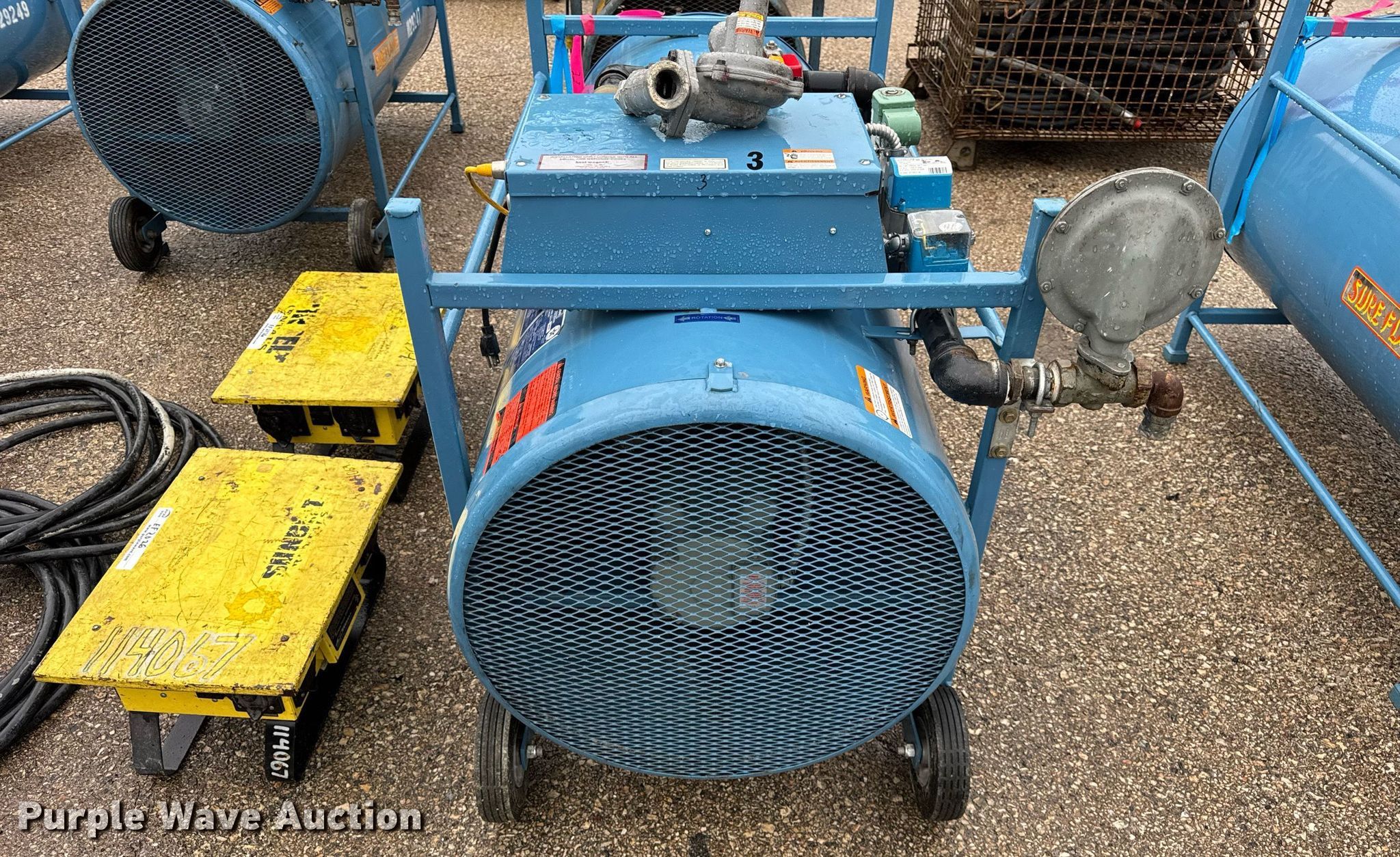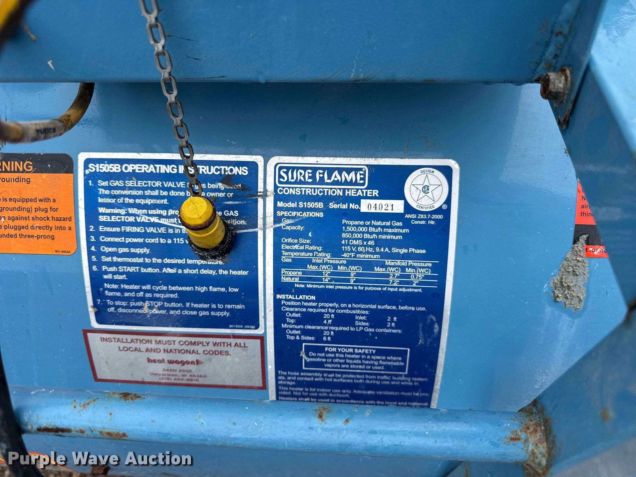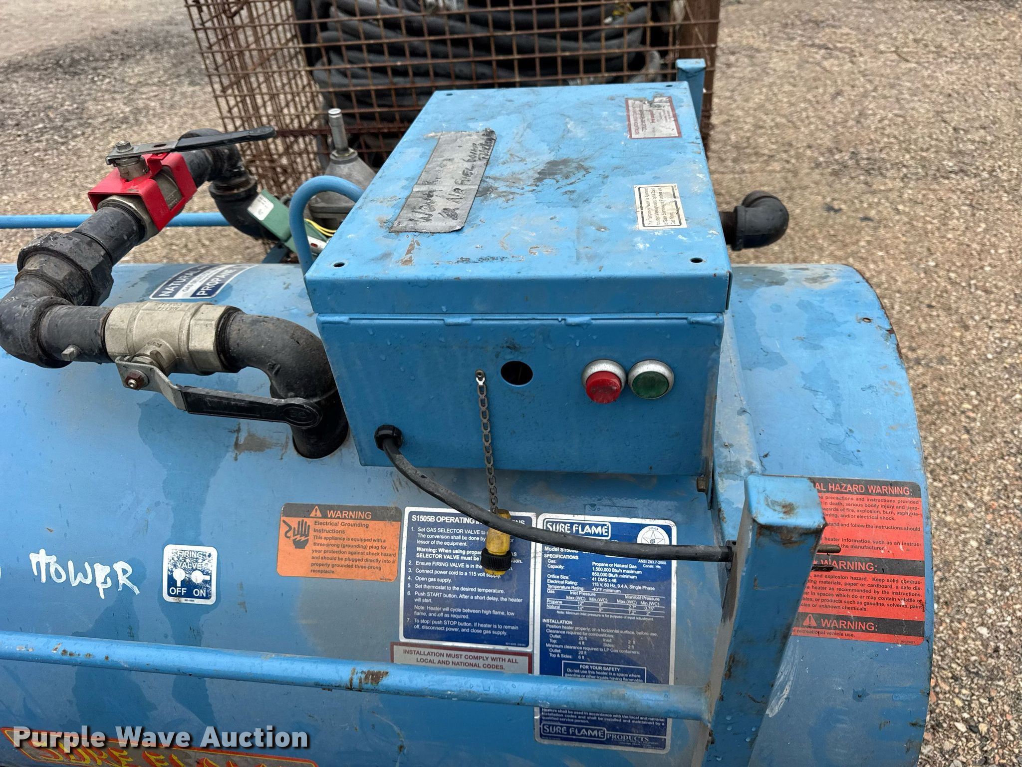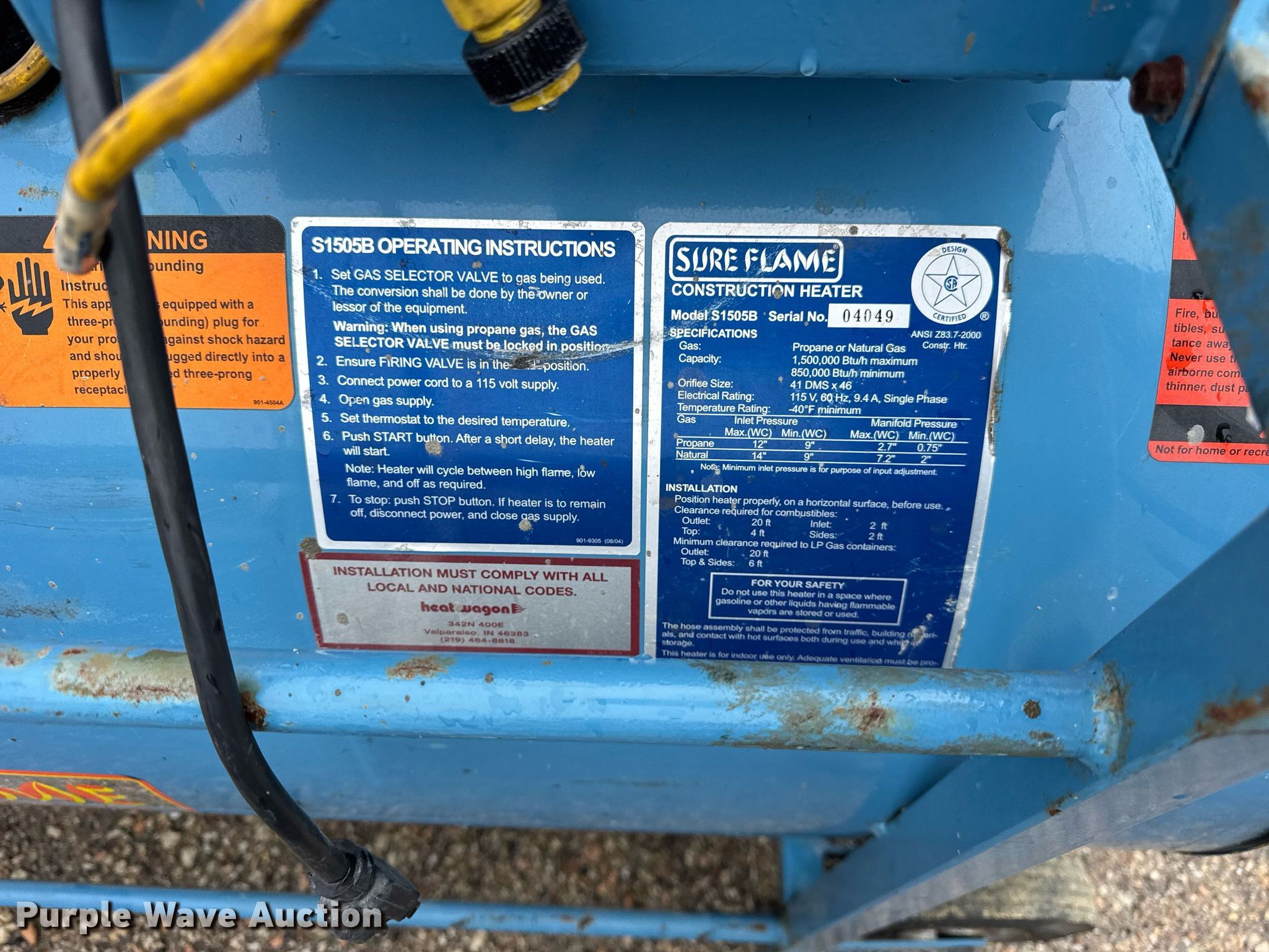 Purple Wave is selling a used Portable Heater or Fan in Illinois. This item is a (8) Sure Flame S1505B heaters with the following: BTU: 1,500,000 BTU, Fuel types:, CNG, LPG, Additional regulators, Fuel hose length: 1,000', (2) hoses, Lengths:, 300', Diameter: 3/4", 700', Diameter" 1",, (2) electric junction boxes, (2) electric cords