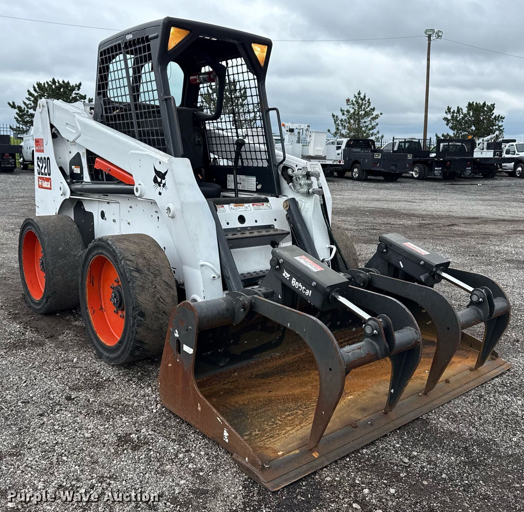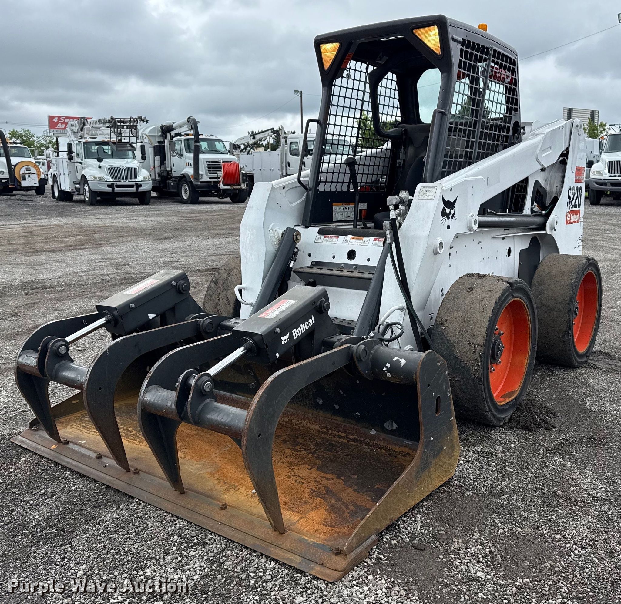 2007 Bobcat S220 skid steer loader. Hours: 6,002 on meter, Serial: 530713912. Engine Kubota V3300-DI-ES903, Displacement: 3.3L, Cylinders: 4, Fuel type: Diesel. Transmission Hydrostatic, Two speed travel. Operators station Bucket control: Foot. Features Auxiliary hydraulics High flow, Quick coupler: Manual, 2018 Bobcat grapple bucket Width: 74", Cutting edge: Bolt-on. Tires Size: 33x6x10, Solid. Collinsville, OK 74021